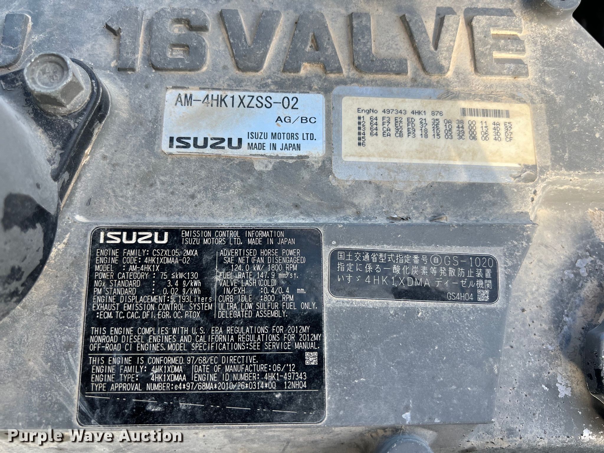 2012 Case CX210C excavator. Hours: 4,683 on meter, Serial: DAC210K6NCSAH1162, Unit #: E8371. Engine Isuzu 4HK1XDMAA, Serial: 4HK1-497343, Displacement: 5.193L, Cylinders: 4, Fuel type: Diesel, kW: 124. Transmission Hydrostatic, Two speed travel. Operators station Enclosed cab, AC, Heat. Features Counter weights, Boom Standard, Stick Stick length: 9' 7", Bucket Strickland CX210, Width: 48", Teeth: 6. Tracks Width: 32", Steel, Grouser pads: Triple. Notes Warning indicator: Service due. HL Equipment. Buda, TX 78610