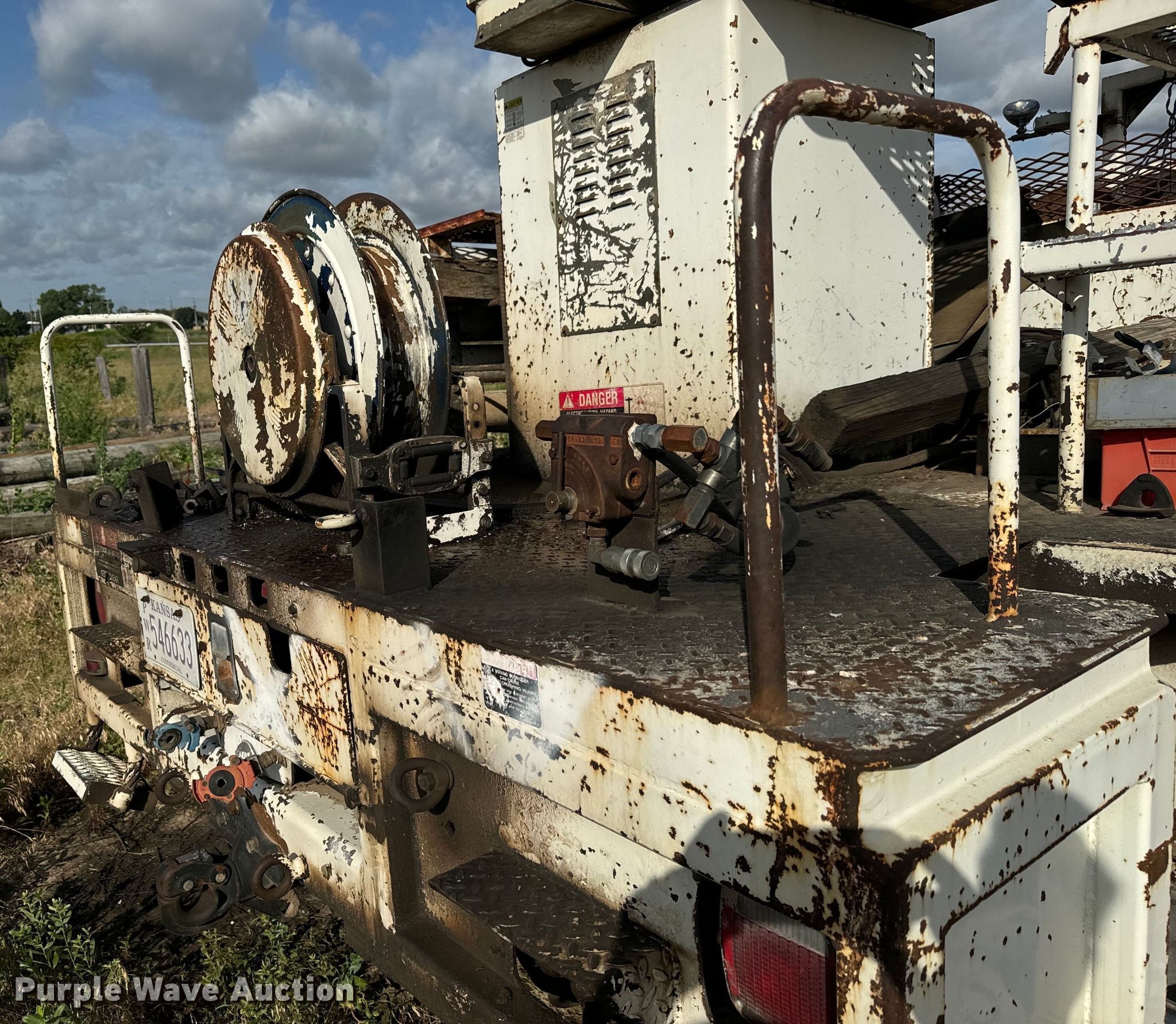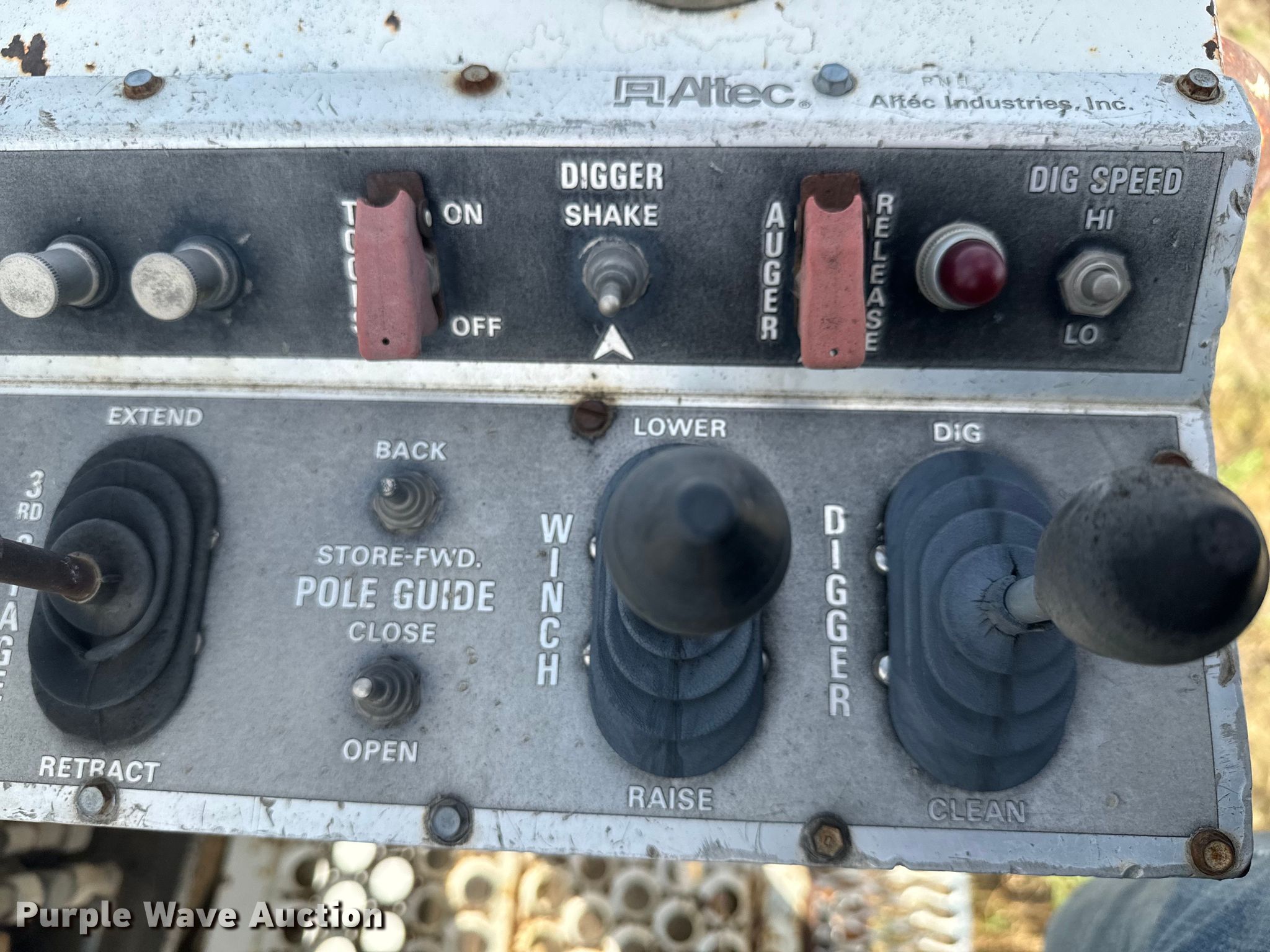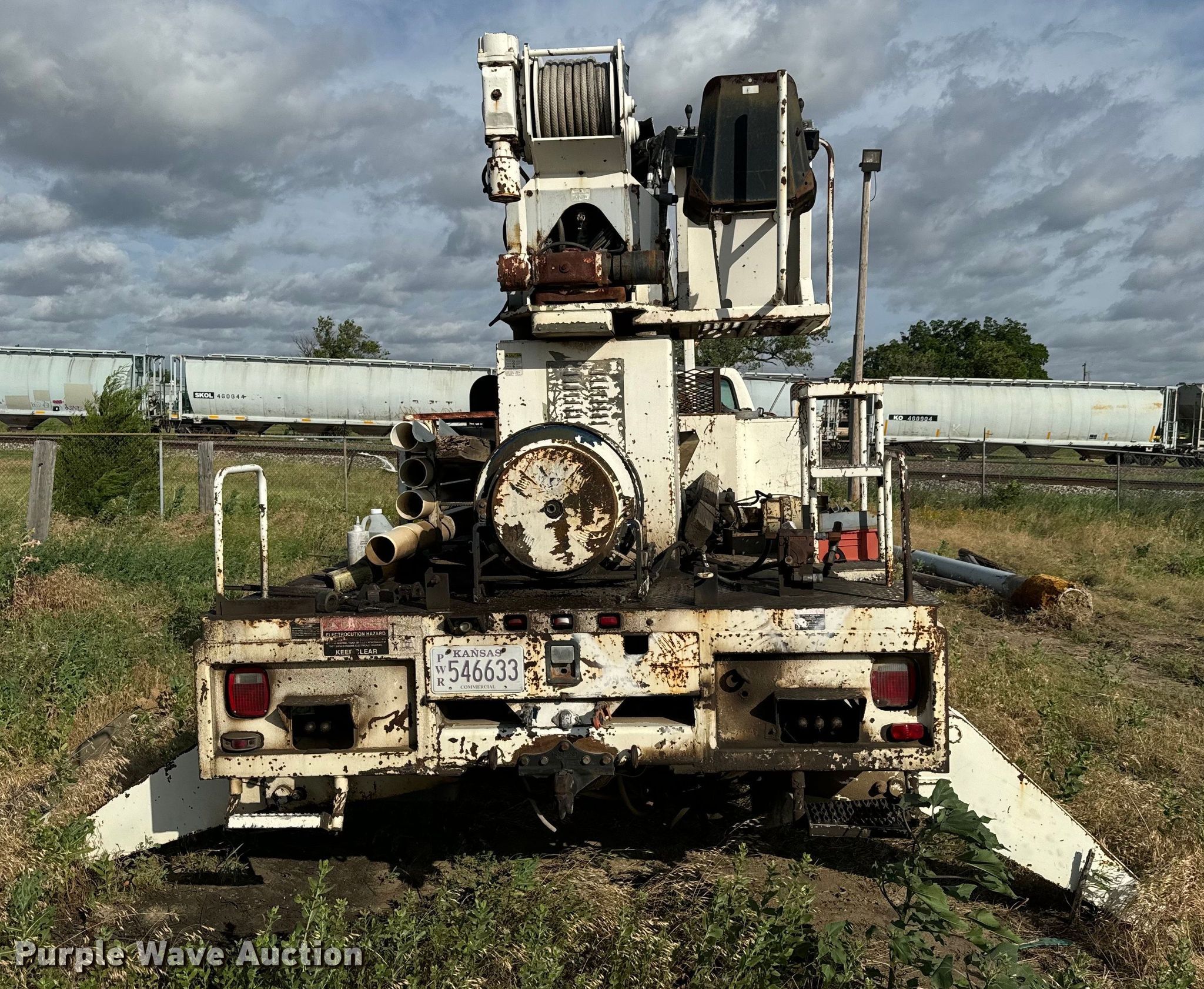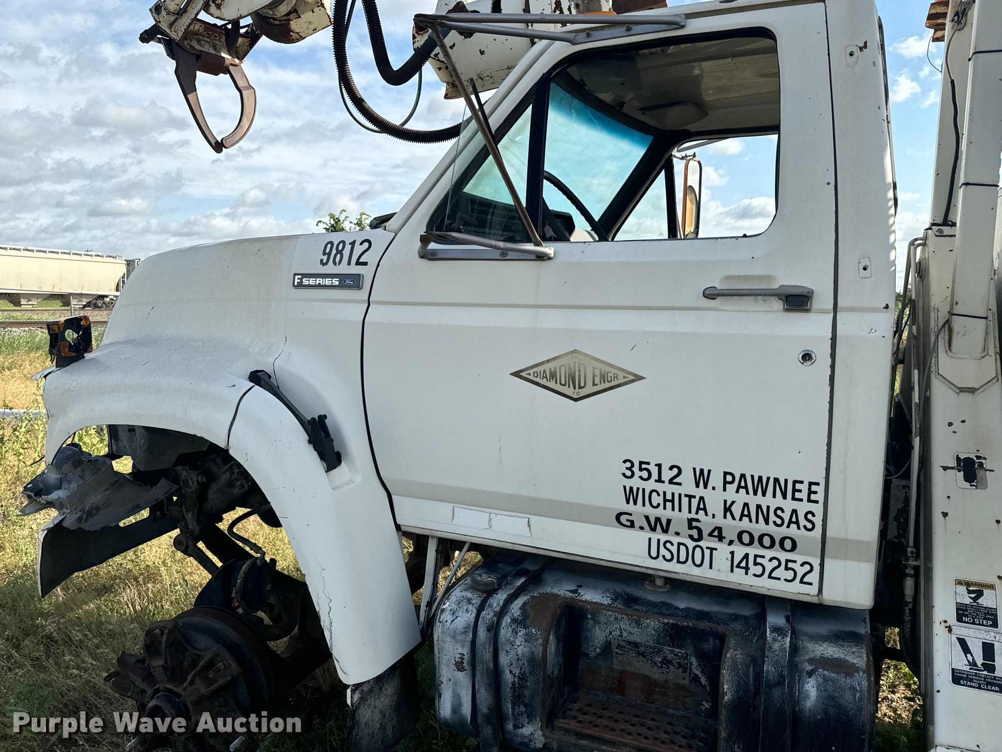 1995 Ford F800 digger derrick truck. Miles: 192,409 on odometer, VIN: 1FDYF80C3SVA40374, Unit #: 9812. Engine Cummins, Displacement: 5.9L, Cylinders: 6, Fuel type: Diesel. Transmission Manual, Speed: 5, plus 2. Chassis Axles: Single, Suspension: Spring, Brakes: Air, PTO. Interior Heat. Features Bed Altec, Serial: 35-30321, 14' 6" L x 96" W, Boom Altec D1090-TR, Maximum lift capacity: 20,700 lbs, Maximum lift height: 45', Boom type: Telescopic, Boom controls Ground, Platform/ basket, Pole guide, Auger. Notes Glass damaged, Wheels and tires missing, Non-operational hydraulics, Non-operational unit. Kansas title. Diamond Engineering Co. - Wichita Division Liquidation - Open Inspection Tuesday, July 9 from 9:00 a.m. to 3:00 p.m.. 3512 West Pawnee Street. Wichita, KS 67213