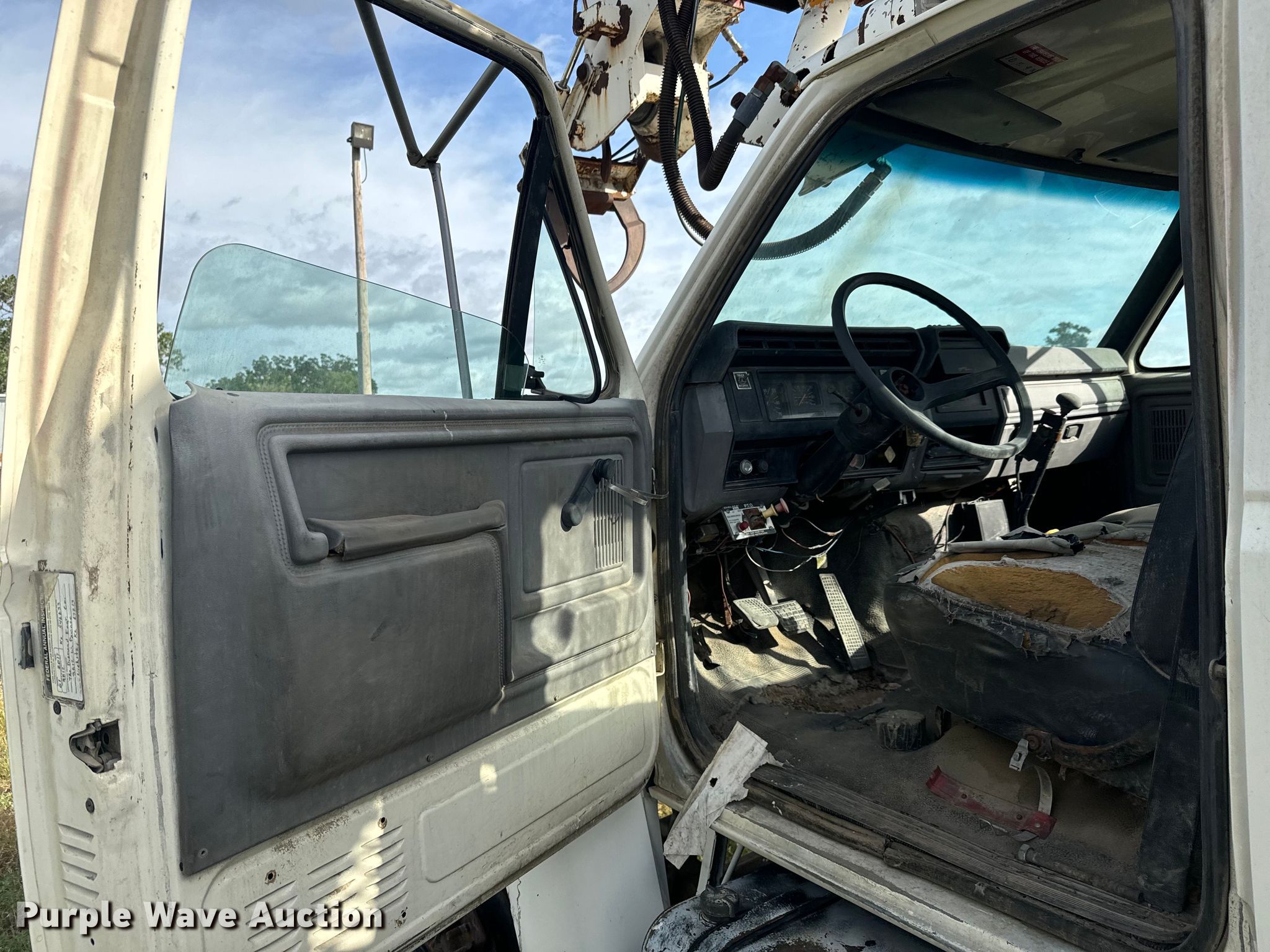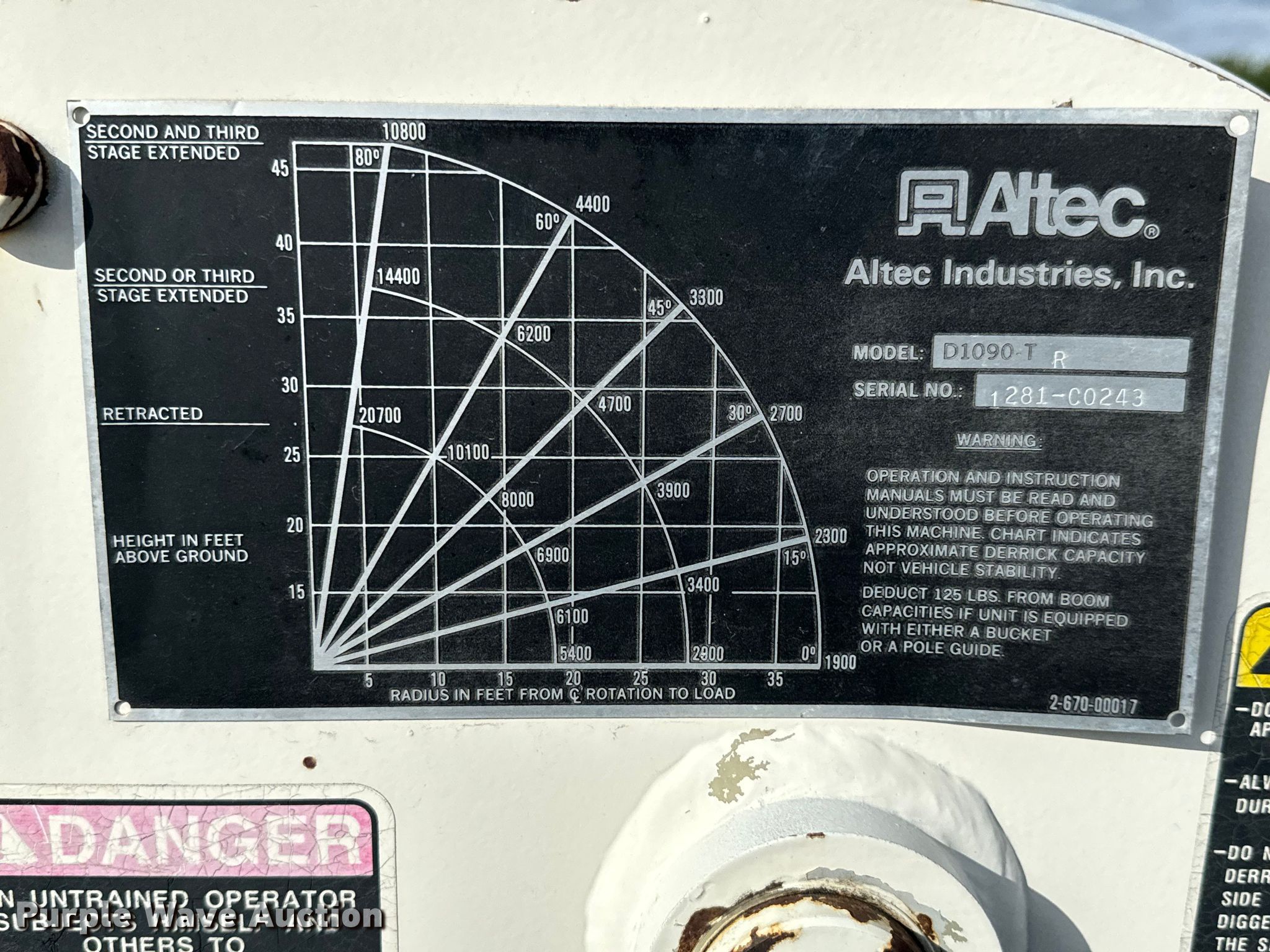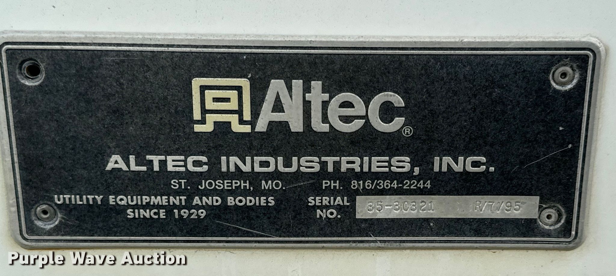 1995 Ford F800 digger derrick truck. Miles: 192,409 on odometer, VIN: 1FDYF80C3SVA40374, Unit #: 9812. Engine Cummins, Displacement: 5.9L, Cylinders: 6, Fuel type: Diesel. Transmission Manual, Speed: 5, plus 2. Chassis Axles: Single, Suspension: Spring, Brakes: Air, PTO. Interior Heat. Features Bed Altec, Serial: 35-30321, 14' 6" L x 96" W, Boom Altec D1090-TR, Maximum lift capacity: 20,700 lbs, Maximum lift height: 45', Boom type: Telescopic, Boom controls Ground, Platform/ basket, Pole guide, Auger. Notes Glass damaged, Wheels and tires missing, Non-operational hydraulics, Non-operational unit. Kansas title. Diamond Engineering Co. - Wichita Division Liquidation - Open Inspection Tuesday, July 9 from 9:00 a.m. to 3:00 p.m.. 3512 West Pawnee Street. Wichita, KS 67213