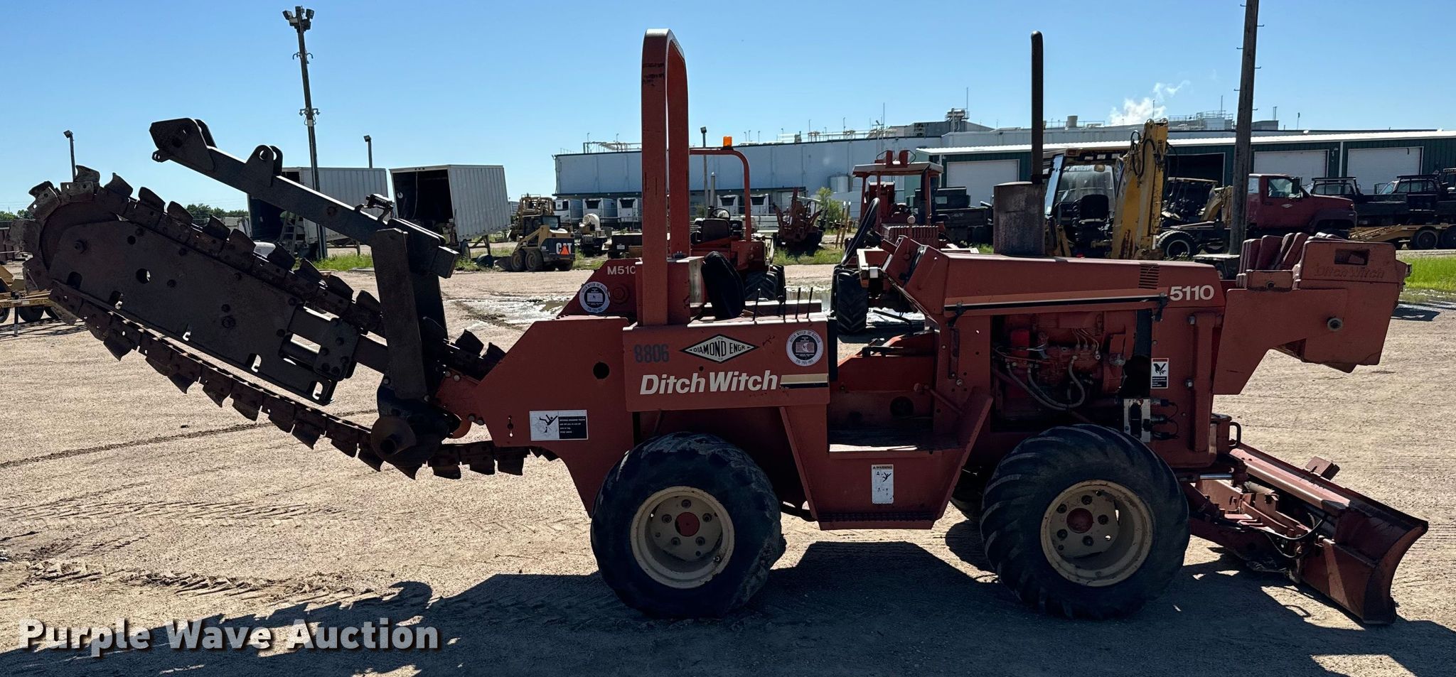 1996 Ditch Witch 5110 trencher. Hours: 1,723 on meter, Serial: 5N0037, Unit #: 8806. Engine Deutz F3L912, Serial: 8429123, Cylinders: 3, Fuel type: Diesel. Transmission Manual, 4F - 1R, Four wheel drive. Operators station OROPS. Features Trencher Model: M510, Serial: 2N0115, Estimated dig depth: 84", Cutting width: 5", Teeth: Dirt, Backfill blade Width: 72", Suitcase weights: 13. Tires Size: 31x15.5-15. Notes Hour meter issues, unreadable, Dead battery. Diamond Engineering Co. - Wichita Division Liquidation - Open Inspection Tuesday, July 9 from 9:00 a.m. to 3:00 p.m.. 3512 West Pawnee Street. Wichita, KS 67213