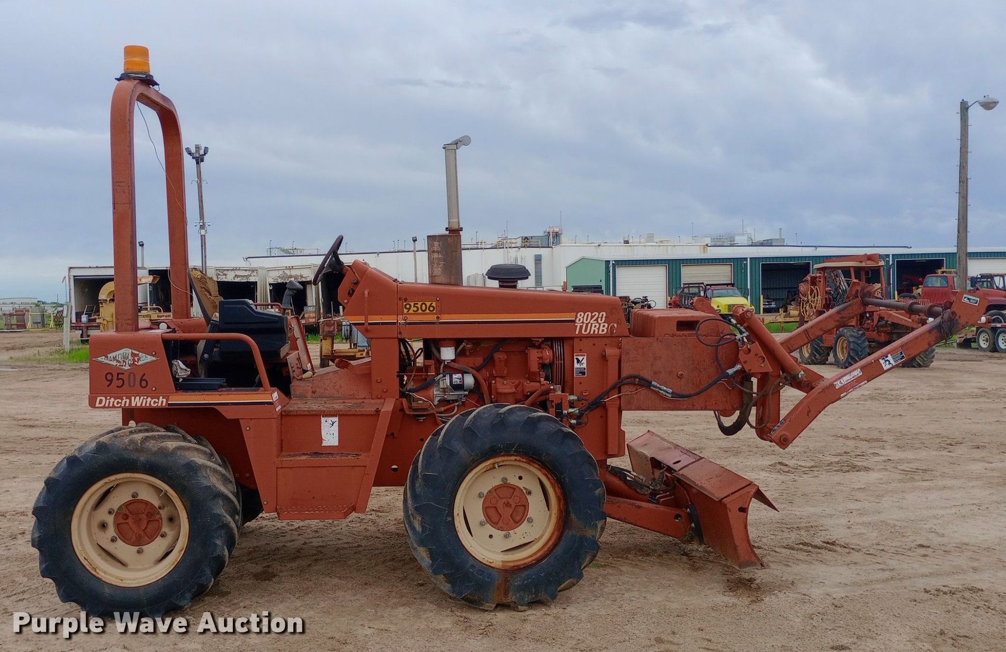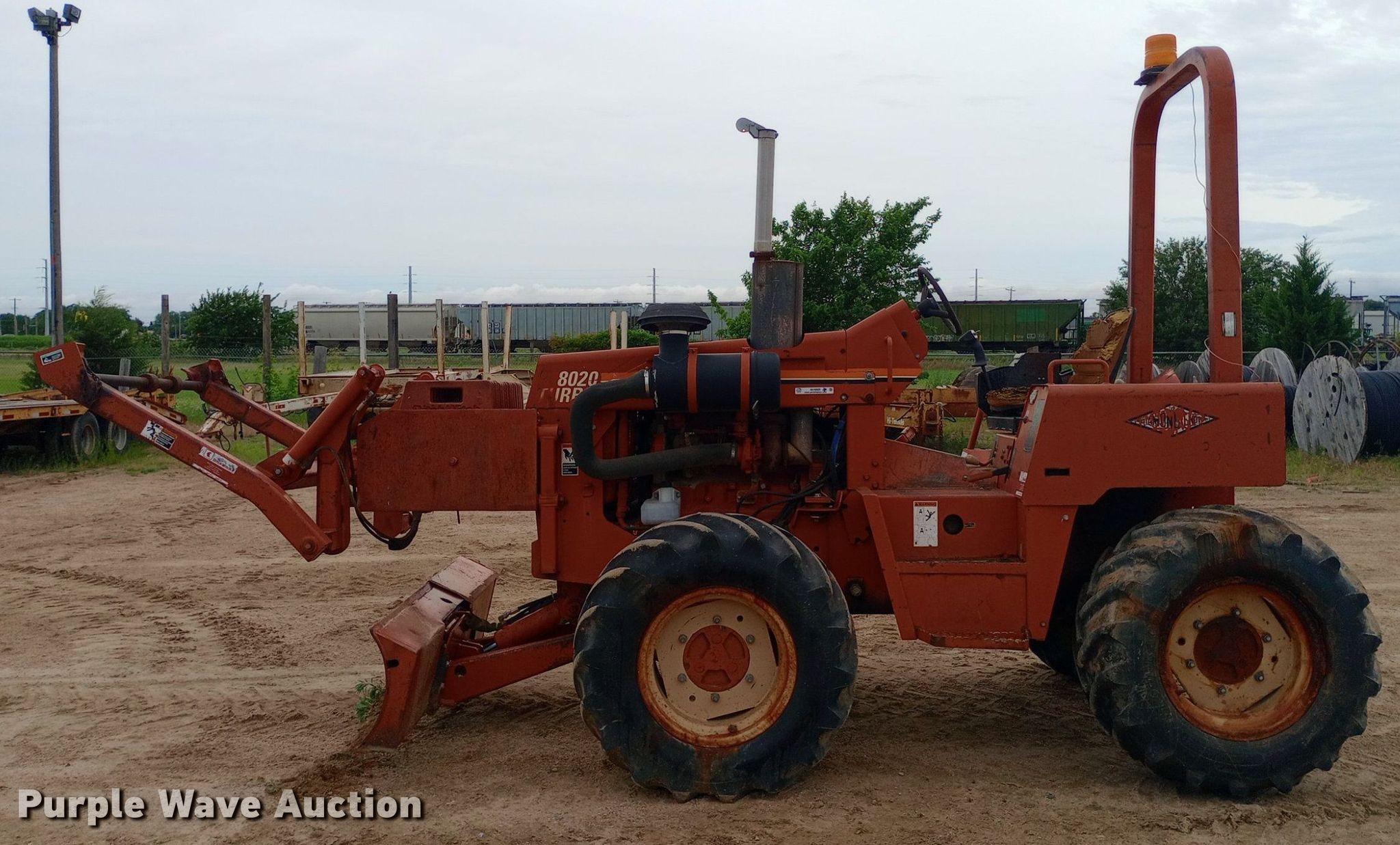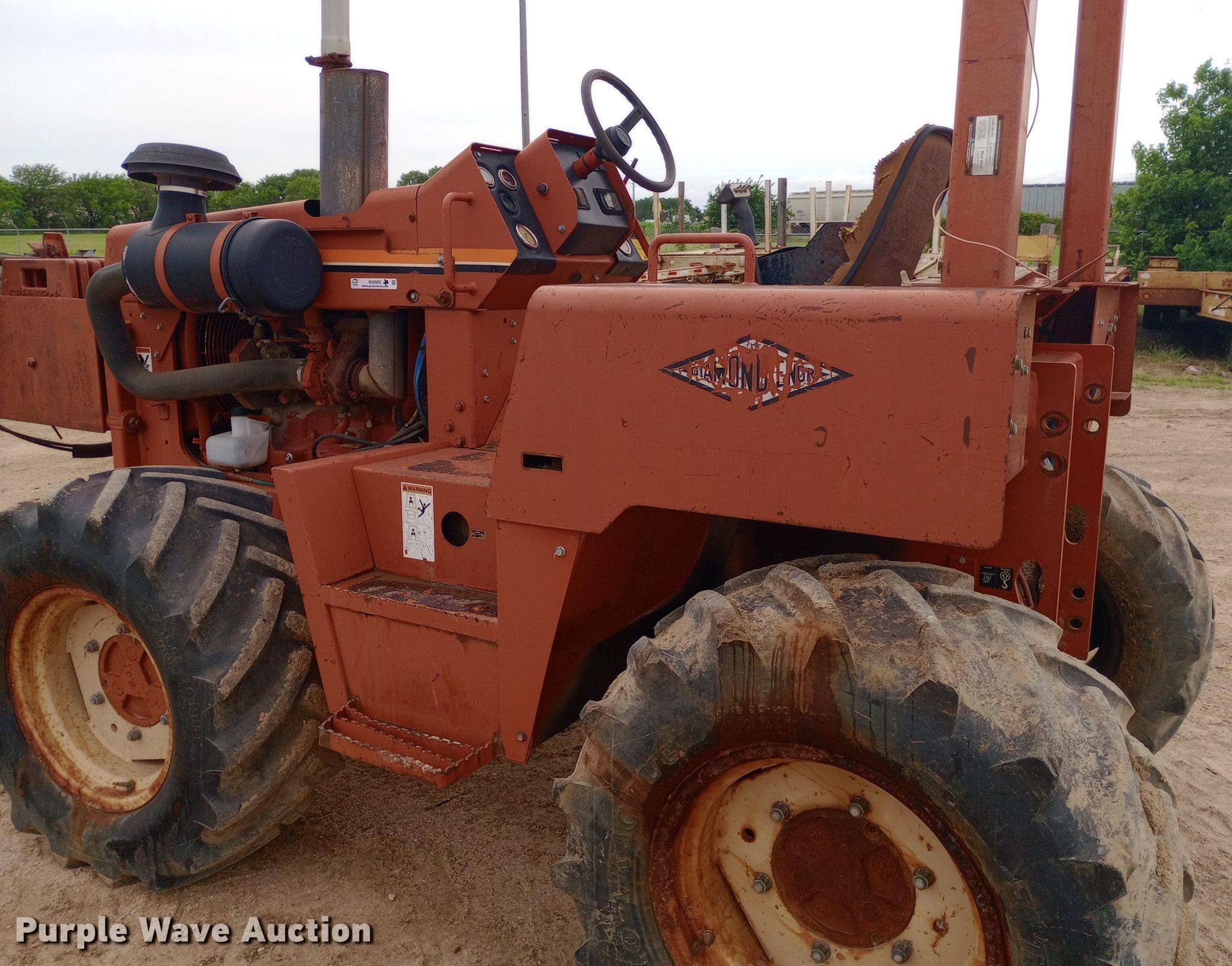 1998 Ditch Witch 8020 cable plow. Hours: 151 on meter, Actual hours unknown, Serial: 5R0563. Engine Cylinders: 4, Fuel type: Diesel. Transmission Hydrostatic, Four wheel drive. Features Reel carrier Maximum reel width: 42", Backfill blade Width: 72". Tires Size: 38x18.00-20. Diamond Engineering Co. - Wichita Division Liquidation - Open Inspection Tuesday, July 9 from 9:00 a.m. to 3:00 p.m.. 3512 West Pawnee Street. Wichita, KS 67213