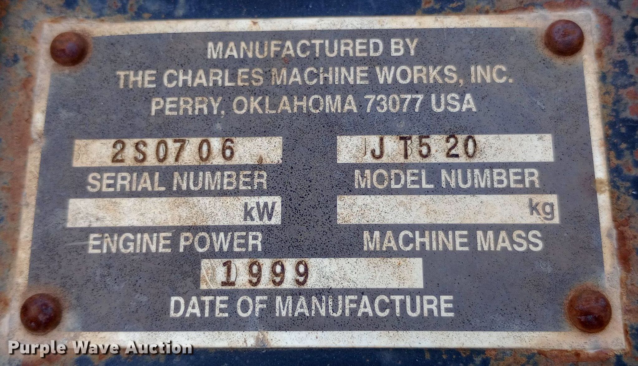 1999 Ditch Witch JT520 directional boring unit. Hours: 2,917 on meter, Serial: 2S0706. Engine Cylinders: 3, Fuel type: Diesel. Features Drill stems On drill: 1, Drill stem length: 5'. Tracks Width: 7", Rubber. Notes Non-operational unit. Diamond Engineering Co. - Wichita Division Liquidation - Open Inspection Tuesday, July 9 from 9:00 a.m. to 3:00 p.m.. 3512 West Pawnee Street. Wichita, KS 67213