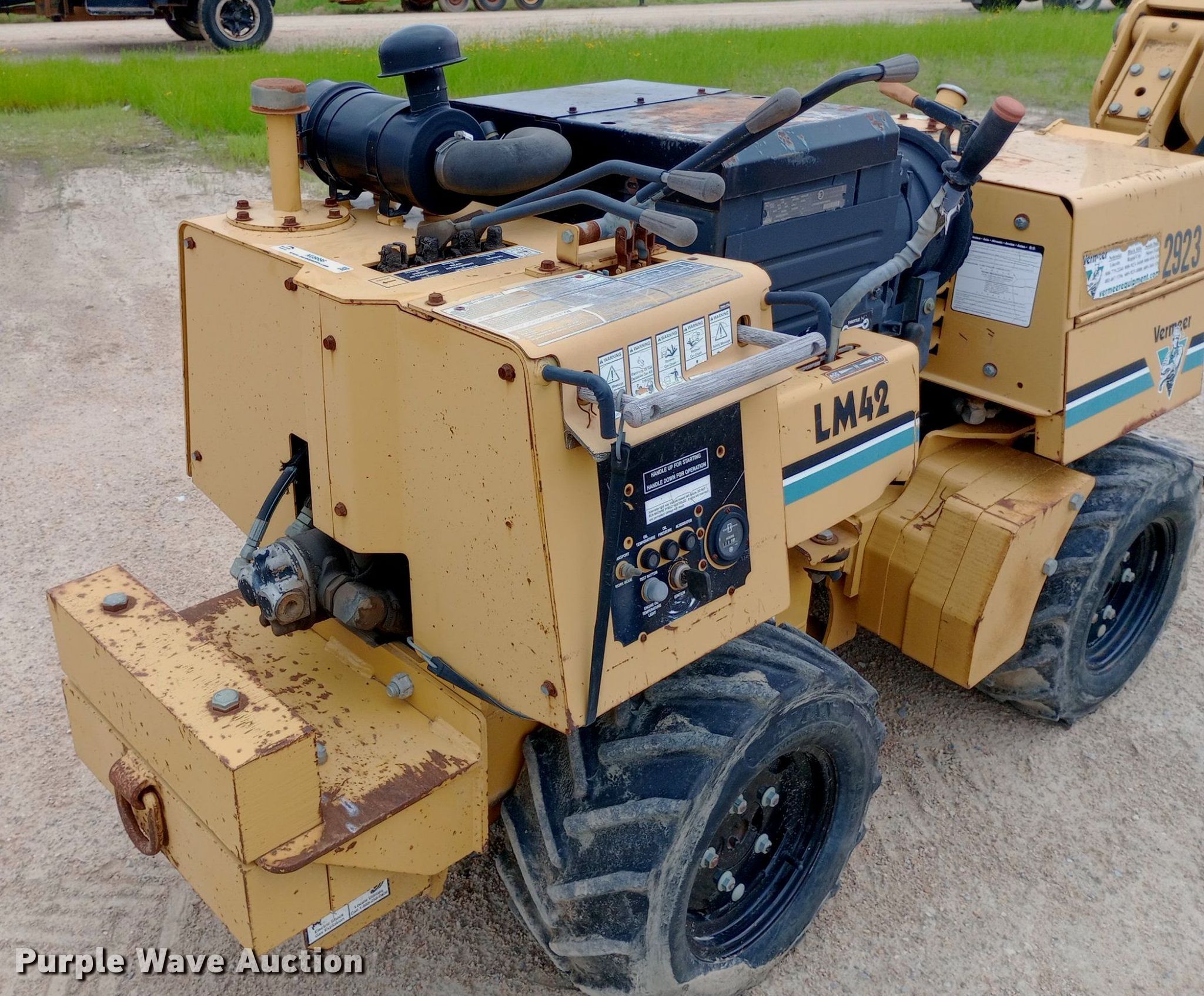 2004 Vermeer LM42 vibratory cable plow. Hours: 326 on meter, Serial: 1VRM112L341002417. Engine Deutz, Cylinders: 3, Fuel type: Diesel. Transmission Hydrostatic, Four wheel drive. Features Vibratory plow Model: VP40. Tires Size: 23x10.50-12. Notes Dead battery, Vibratory plow blade missing. Diamond Engineering Co. - Wichita Division Liquidation - Open Inspection Tuesday, July 9 from 9:00 a.m. to 3:00 p.m.. 3512 West Pawnee Street. Wichita, KS 67213