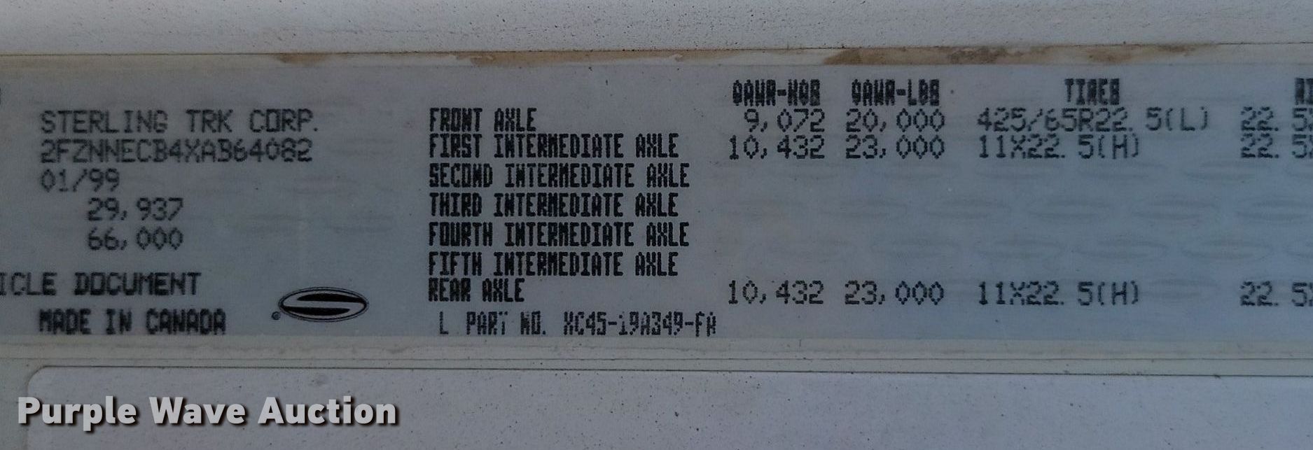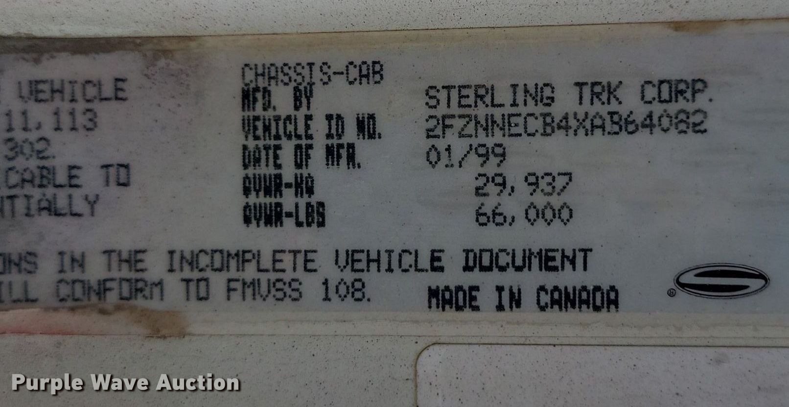 1999 Sterling LT9511 dump truck. Miles: 37,555 on odometer, Hours: 9,498 on meter, VIN: 2FZNNECB4XAB64082, Unit #: 3021. Engine Caterpillar C10, Displacement: 10.3L, Cylinders: 6, Fuel type: Diesel. Transmission Eaton Fuller Road Ranger RT0-9 MLL, Manual, Speed: 11. Chassis Axles: 4, Pusher axle Steerable, Differential lock: Inter-axle, Suspension: Spring over walking beam, Brakes: Air, PTO, GVWR: 66,000 lbs FAWR: 20,000 lbs, IAWR: 23,000 lbs, RAWR: 23,000 lbs. Interior AC, Heat, Heated mirrors, Cruise control. Features Dump bed 18' L x 96" W, Side height: 54", Side board height: 6", Bed type: Aluminum, Liner, Ram: Single, End gate: Air operated. Tires Front: 385/65R22.5, Rear: 11R22.5, Lift axle: 255/70R22.5. South Dakota title. GCC. Bellingham, MN 56212