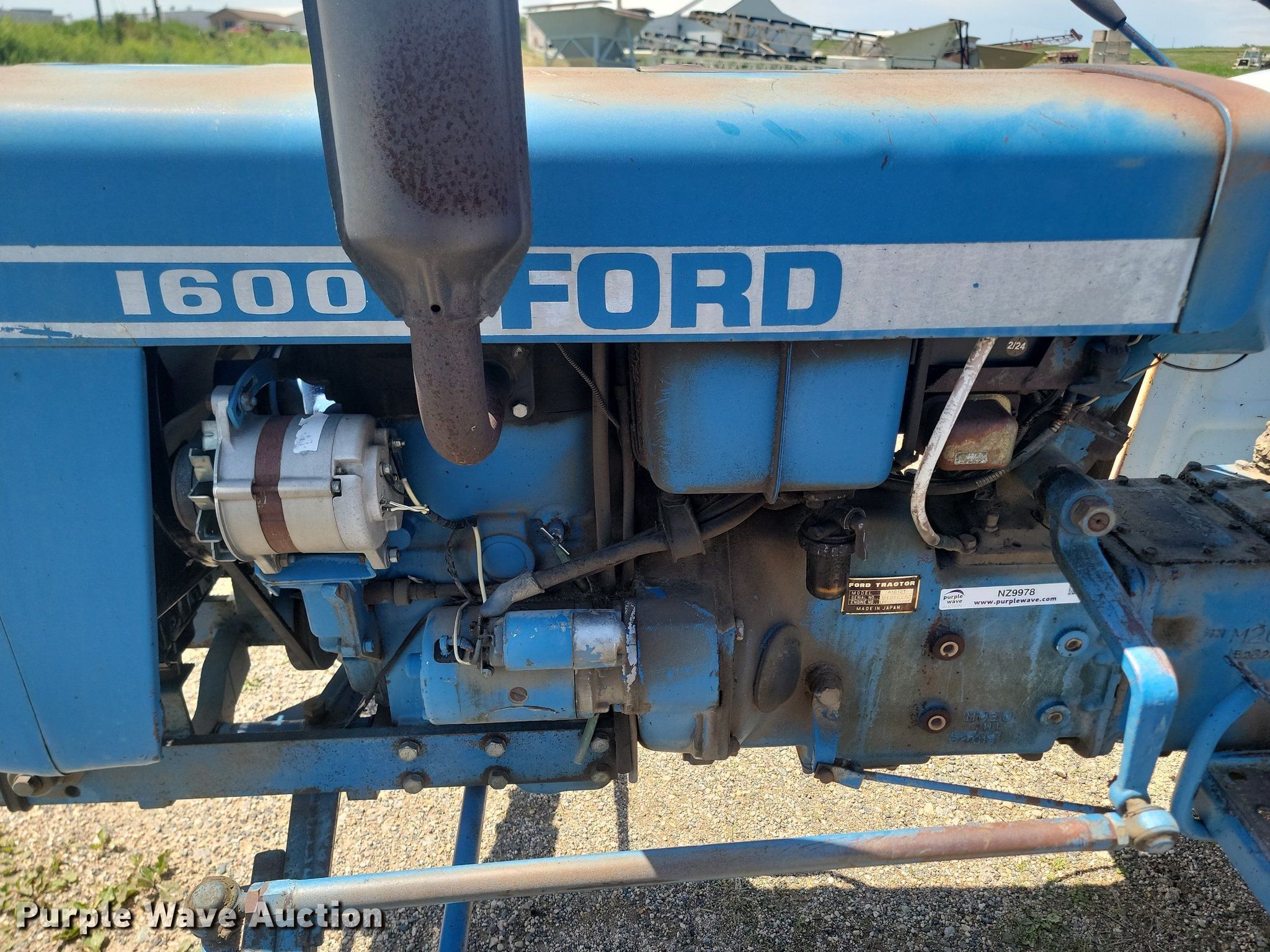 1977 Ford 1600 tractor. Hours: 1,697 on meter, Serial: U106026. Engine Ford, Cylinders: 2, Fuel type: Diesel. Transmission Manual, 9F - 3R. Features PTO: 540, Three point Top link. Tires Front: 5.00-15, Rear: 14.9-24. Notes Ignition switch issues, Solenoid issues. GCC. Bellingham, MN 56212