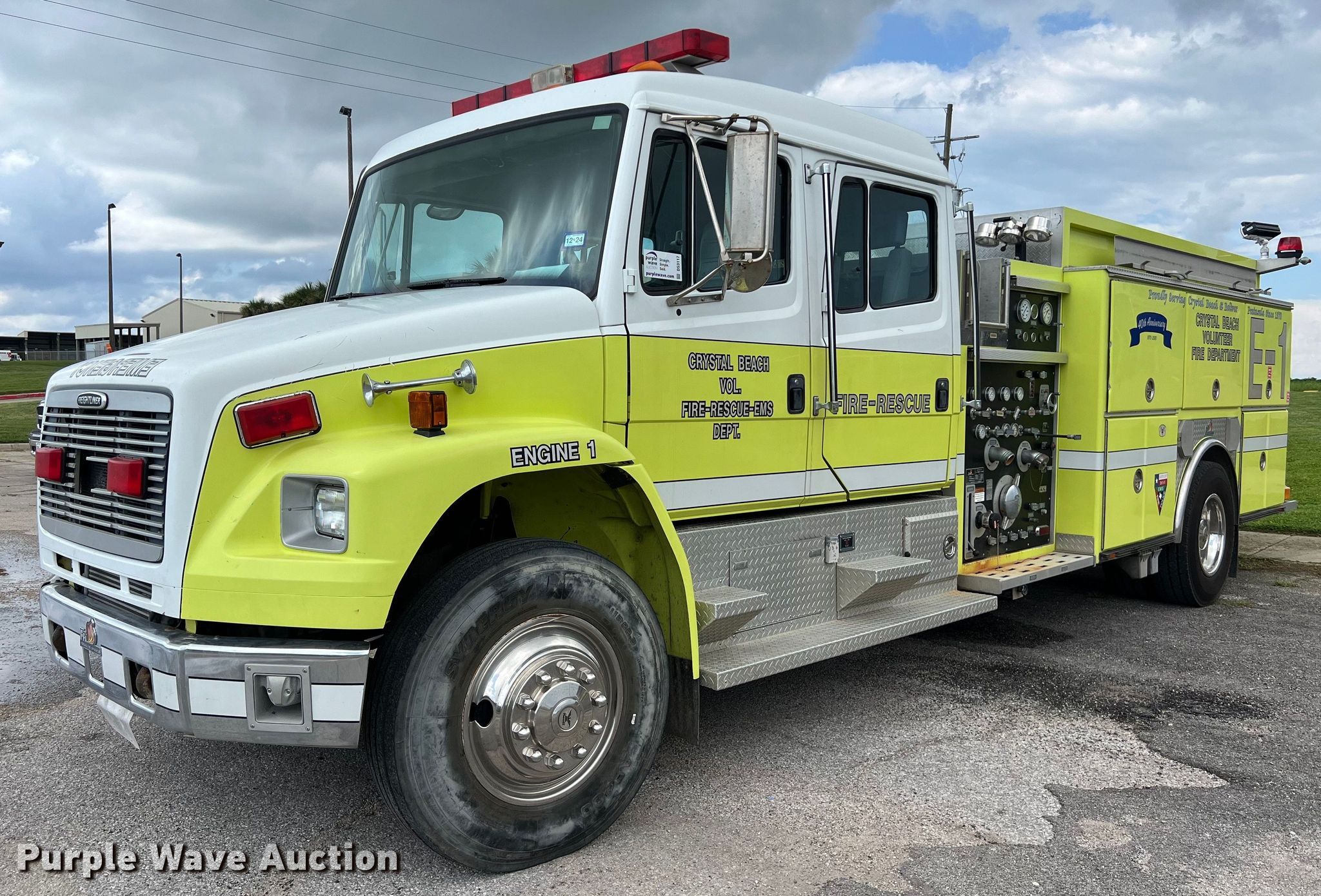 Purple Wave is selling a used Fire Truck or Emergency Vehicle in Texas. This item is a 1999 Freightliner pumper fire truck with the following: Miles: 30,925 on odometer, Hours: 1,596 on meter, VIN: 1FV6JLCB5XHA71798, Unit #: 1