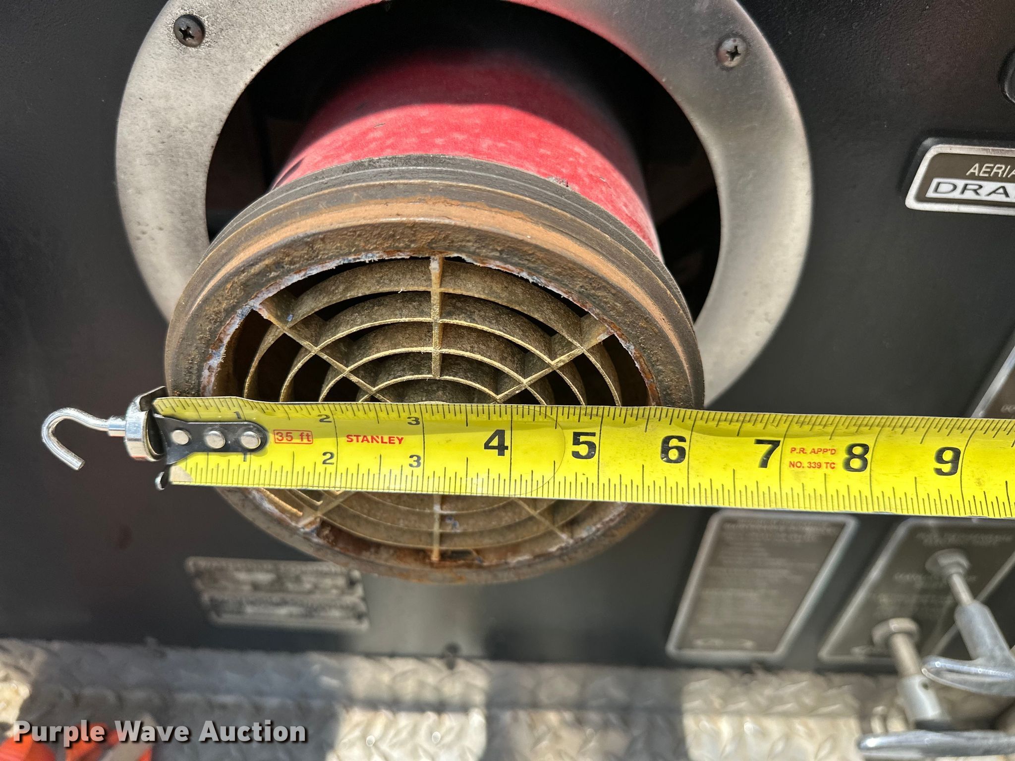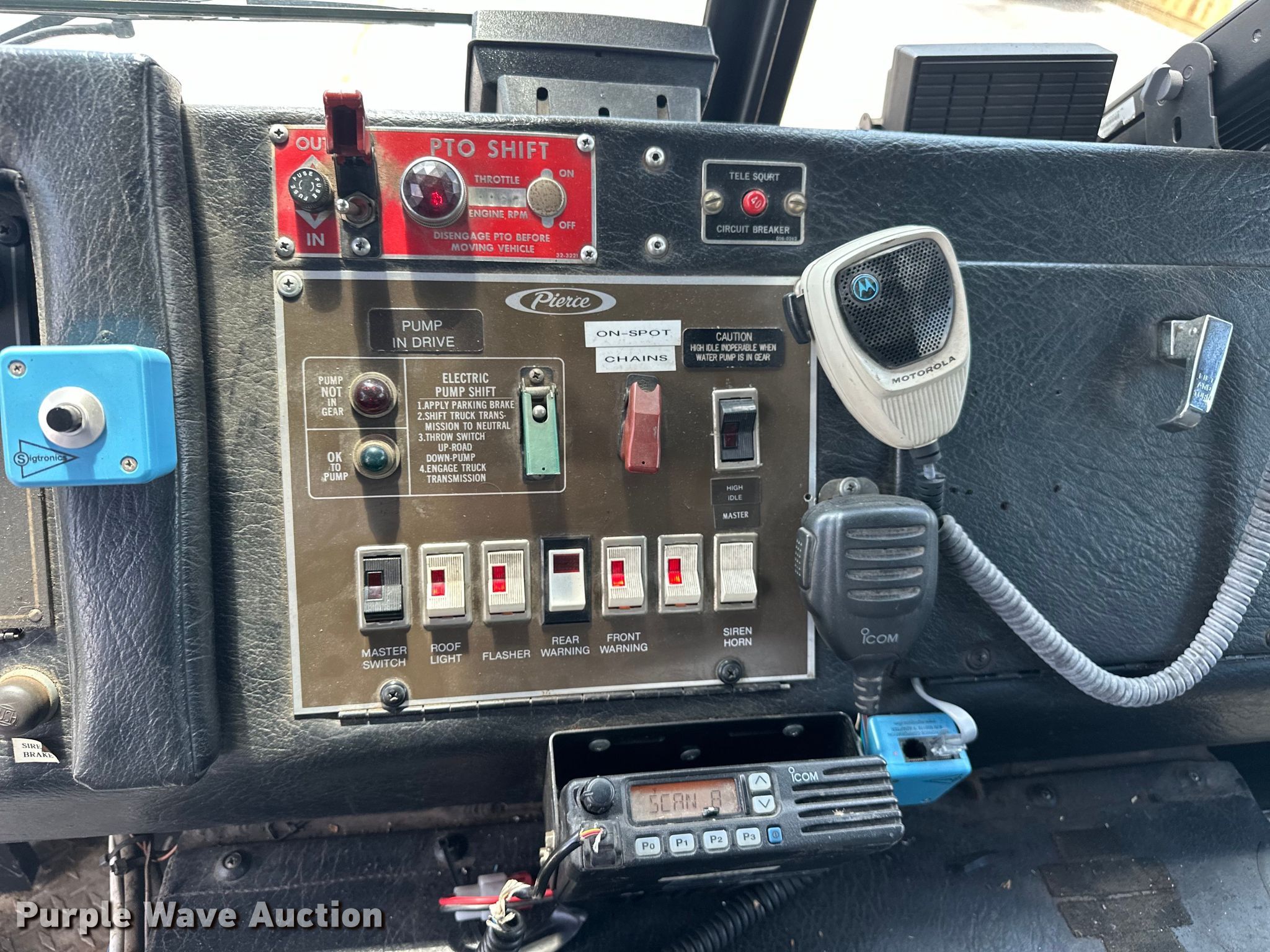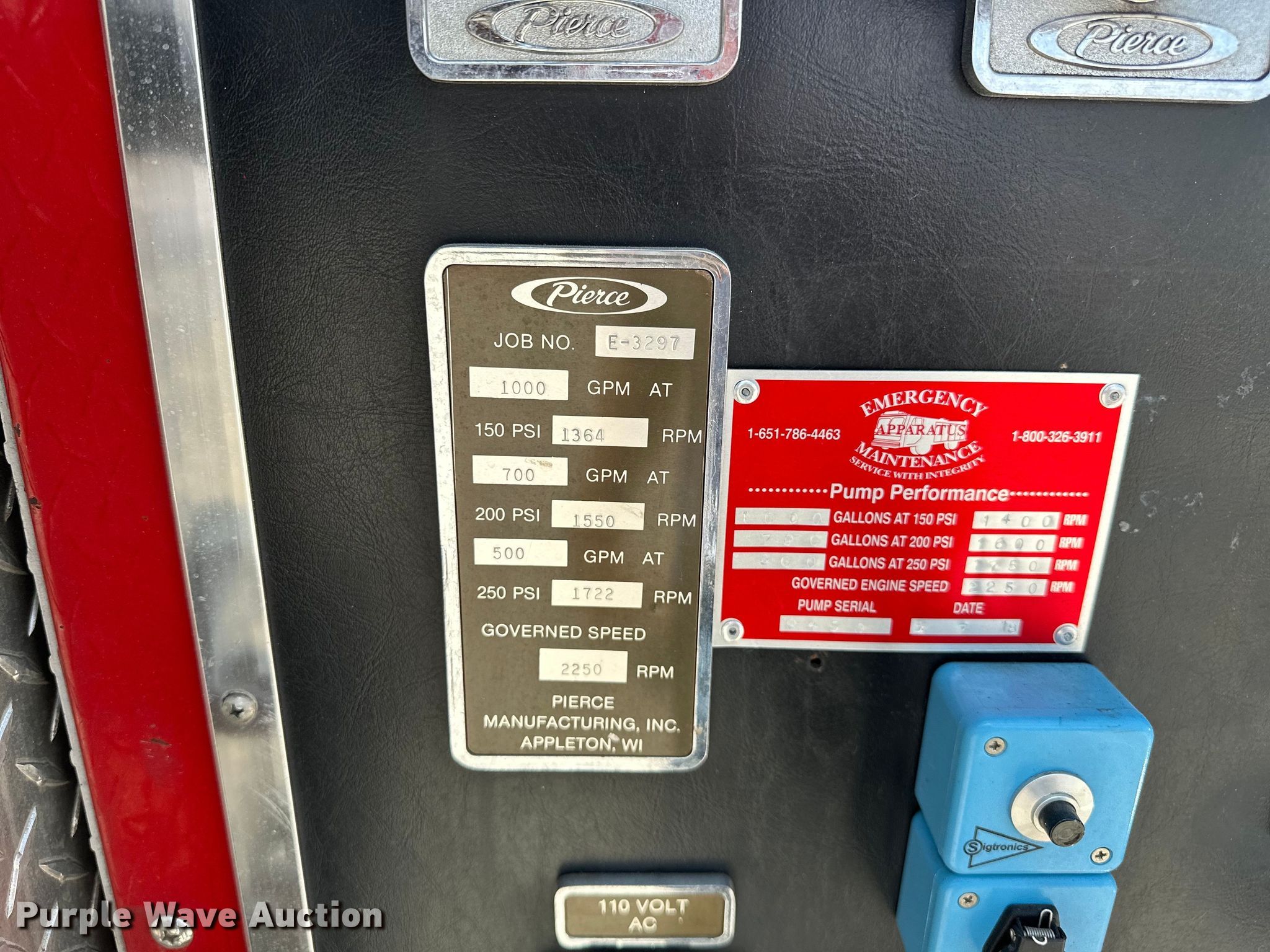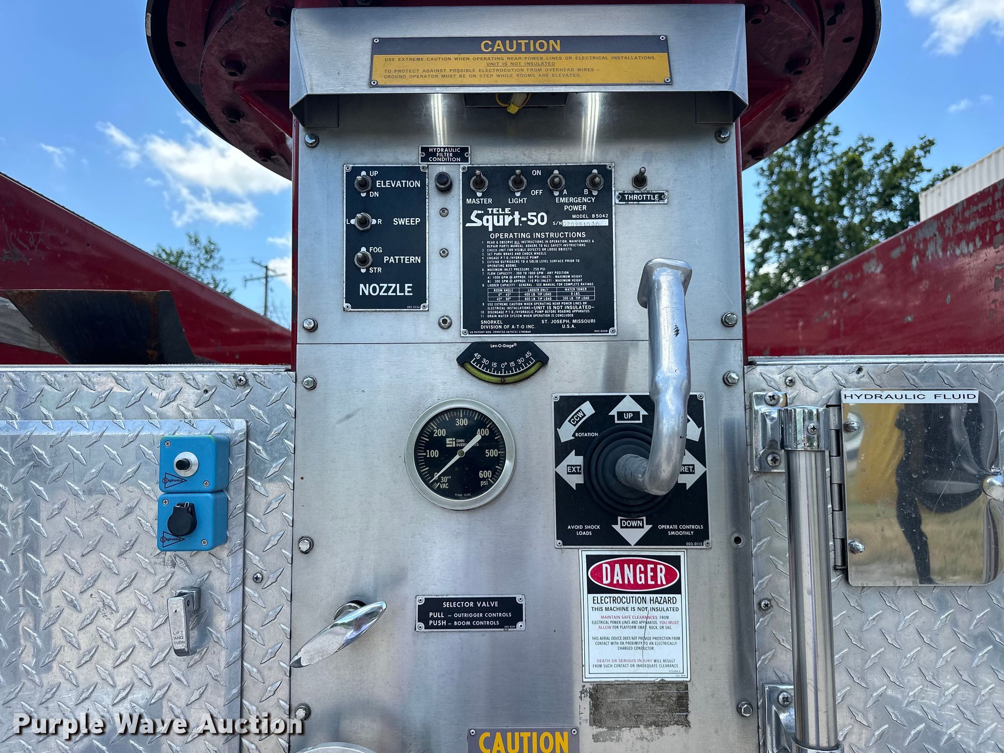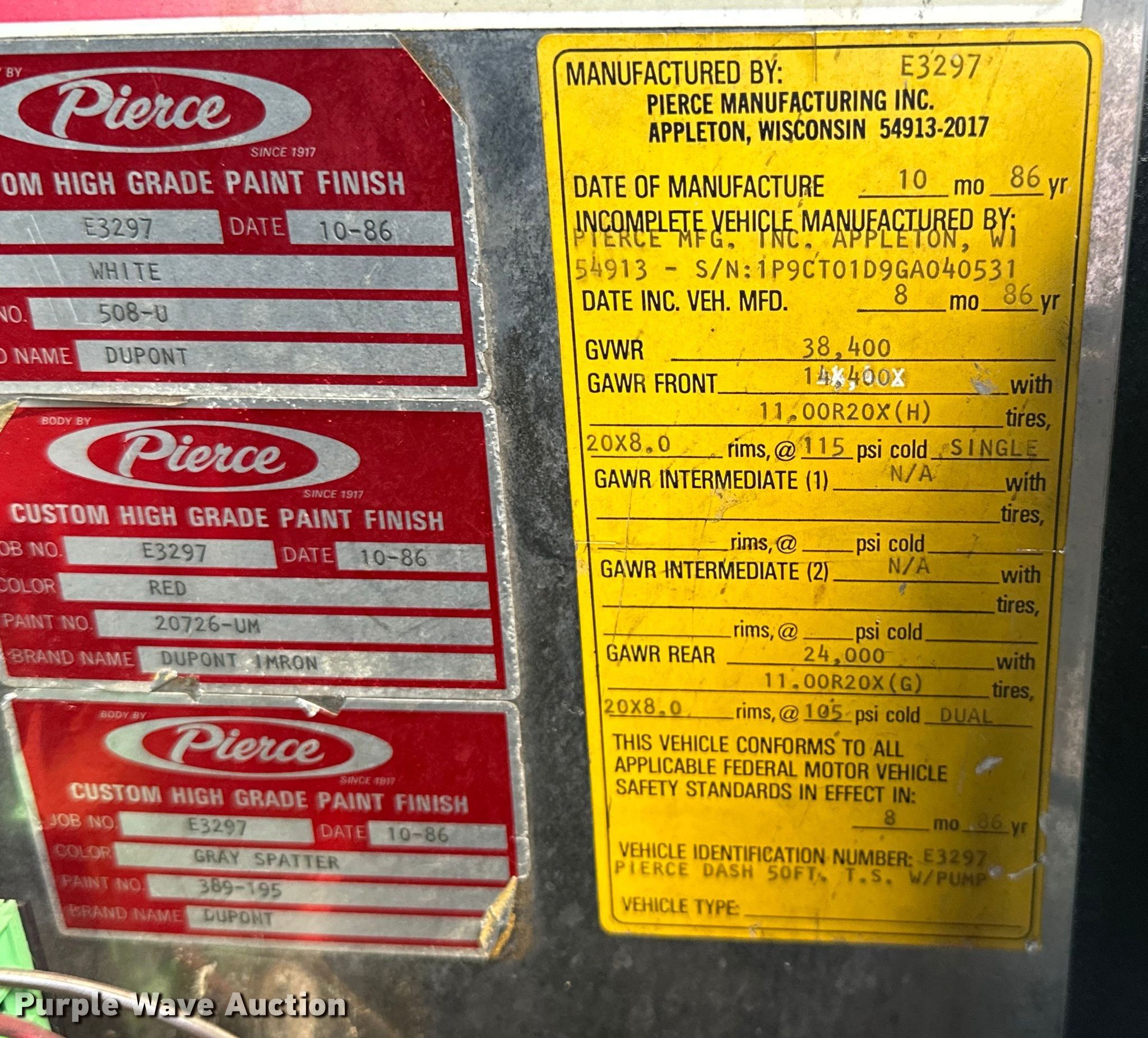 1986 Pierce E3297 Quint fire truck. Miles: 5,391 on odometer, Hours: 5,970 on meter, VIN: 1P9CT01D9GA040531. Engine Cylinders: 6, Fuel type: Diesel. Transmission Automatic. Chassis Axles: Single, Suspension: Spring, Brakes: Air, GVWR: 38,400 lbs. Interior Heat, Auxiliary controls. Features Fire truck body Aerial Telesqurt-50 B5042, Maximum height: 55', Maximum lift capacity: 300 lbs, Stabilizers Quantity: 2, Elevated deck gun 1,000 gpm, Tank Capacity: 500 gallons, Pump 1,000 gpm, Ground ladder, PA/ siren controls. Tires Size: 11.00R20. Notes Contents not included, Rear driver side window cracked, Outrigger issues, leaks hydraulic fluid. Oklahoma title. Mileage has not been verified. Exempt will be written in the odometer disclosure on the title. Rolling Hills Fire Protection District #1. Tulsa, OK 74108