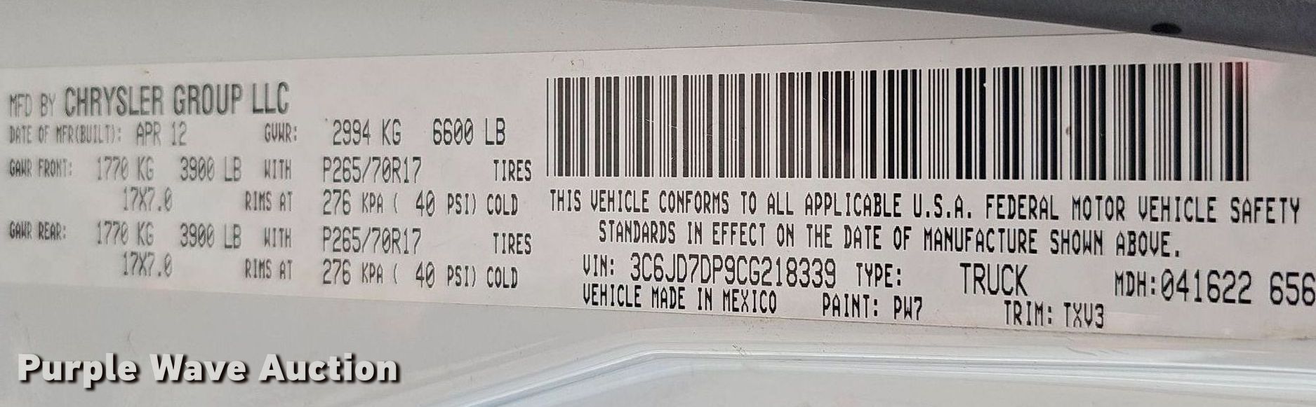 • VIN: 3C6JD7DP9CG218339