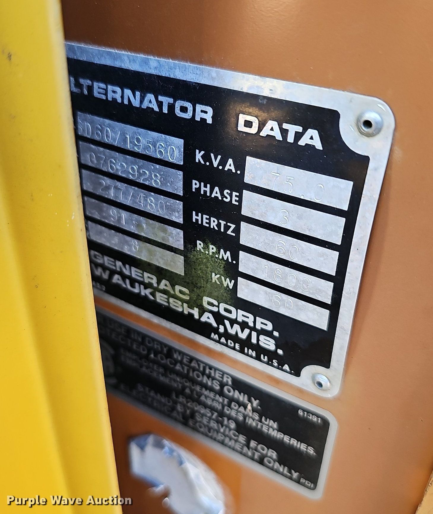 Purple Wave is selling a used Generator Set in Missouri. This item is a Generac SD60/19560 generator with the following: Hours: 912 on meter, Serial: 0762928