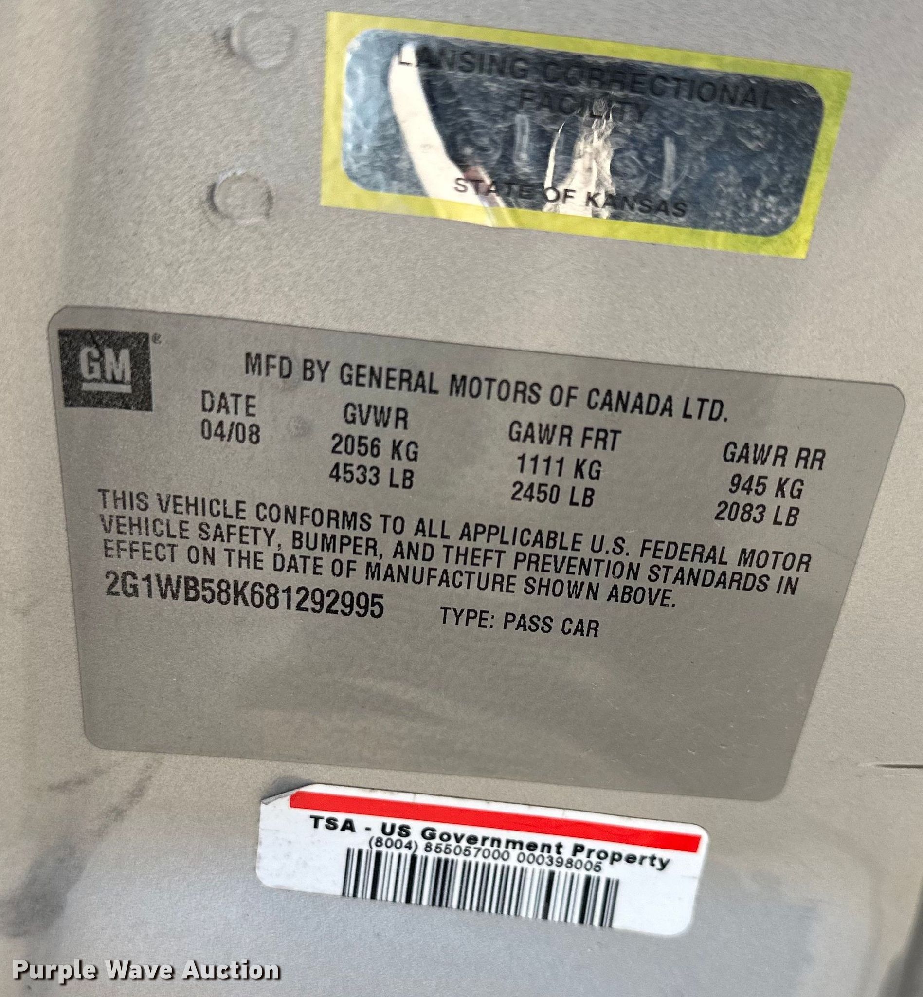 2008 Chevrolet Impala LS. Miles: 133,849 on odometer, VIN: 2G1WB58K681292995. Engine Displacement: 3.5L V6 OHV, Cylinders: 6, Fuel type: Gas. Transmission Automatic. Interior AC, Heat, Power windows, Power locks, Cruise control. Tires Size: 225/60R16. Notes Dash warning indicator: Airbag, Front end damaged. Kansas title. Lansing Correctional Facility. Lansing, KS 66043