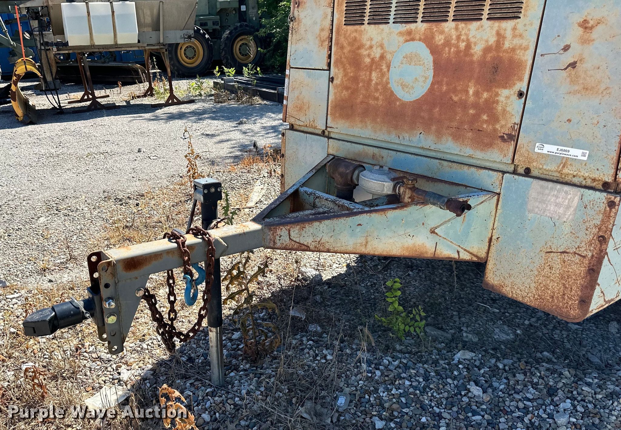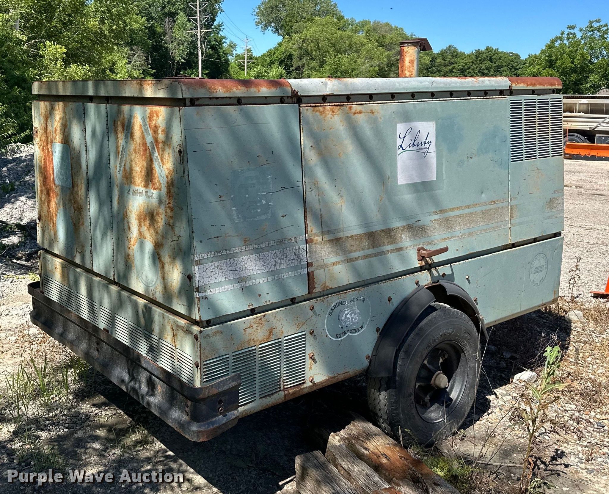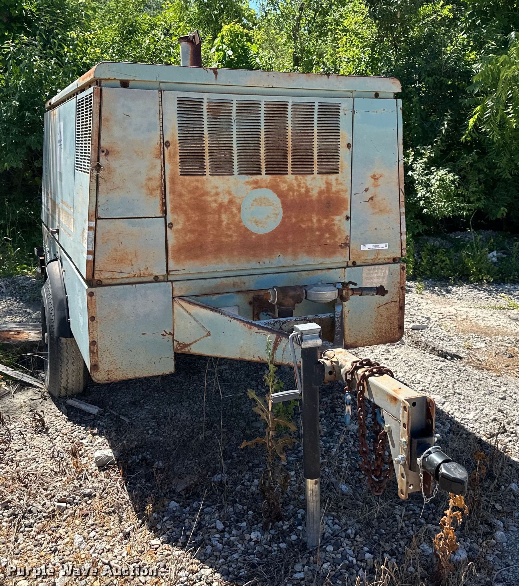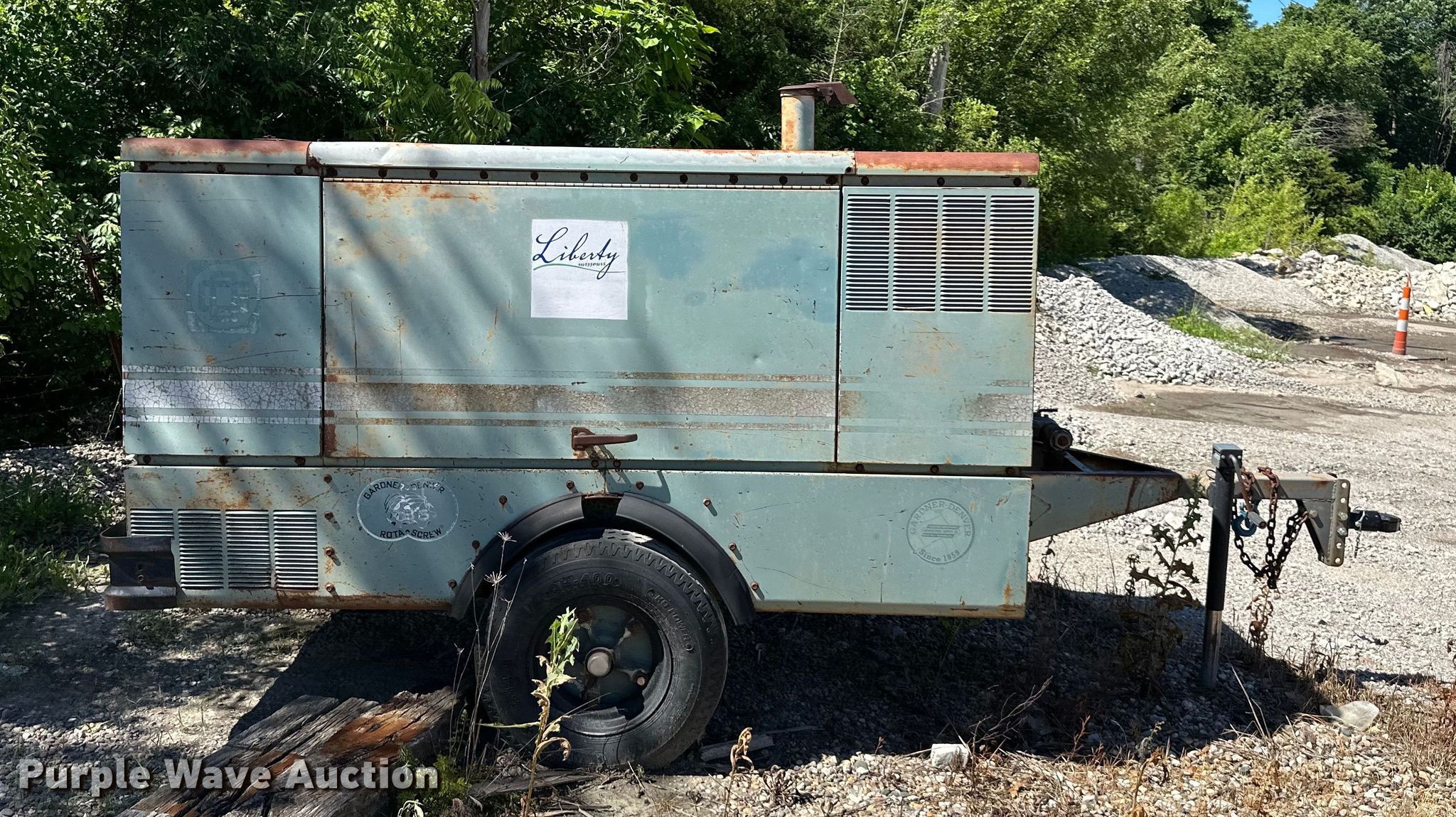 Gardner Denver air compressor. Serial: 710021. Engine John Deere, Cylinders: 4, Fuel type: Diesel. Features Air compressor CFM: 185, PSI: 100. Trailer 12' L x 72" W, Ball hitch size: 2", Suspension: Spring, Axles: Single, Tire size: 8-14.3. Notes Injection pump issue, Non-operational unit. City of Liberty, MO. Liberty, MO 64068