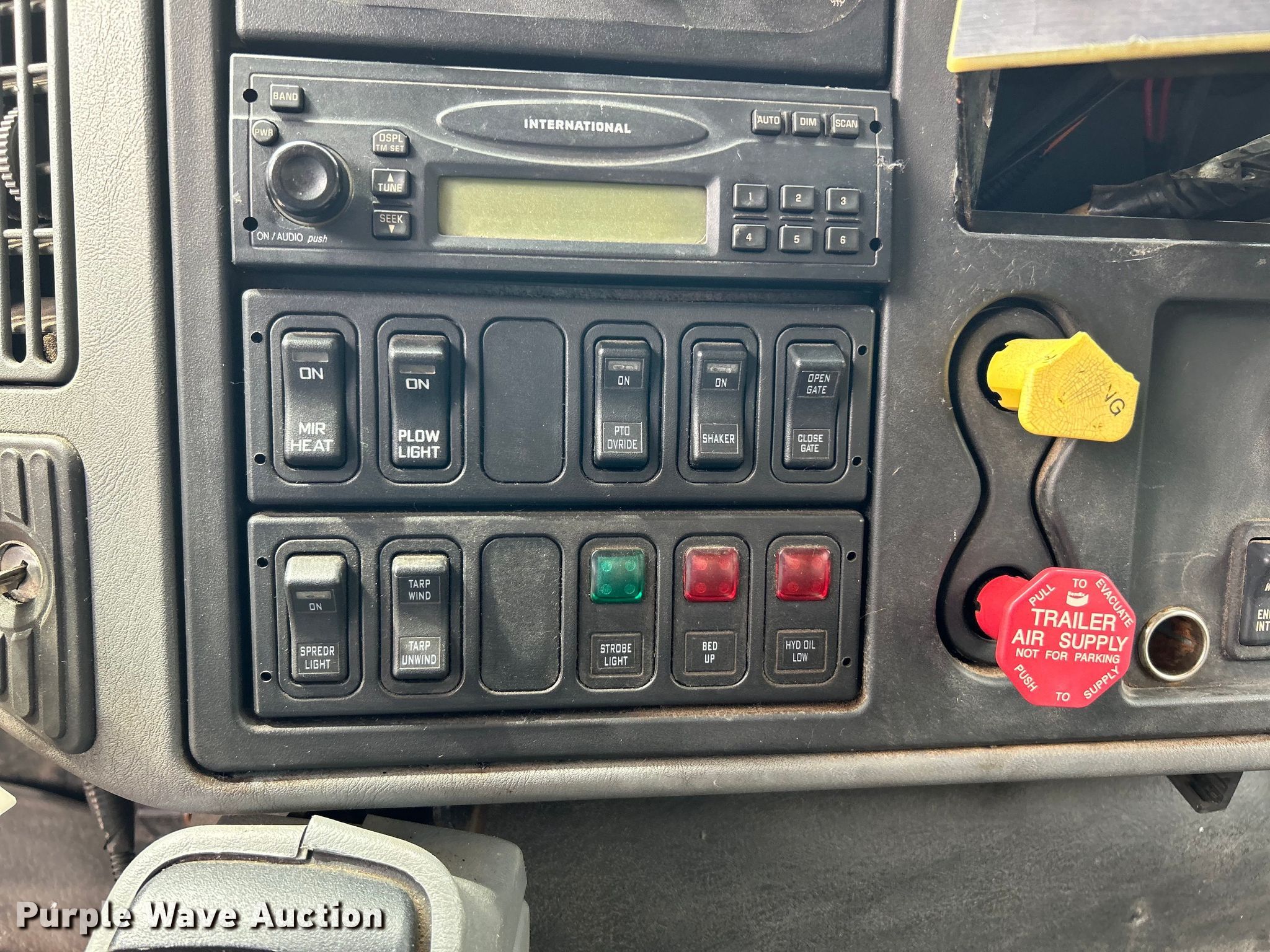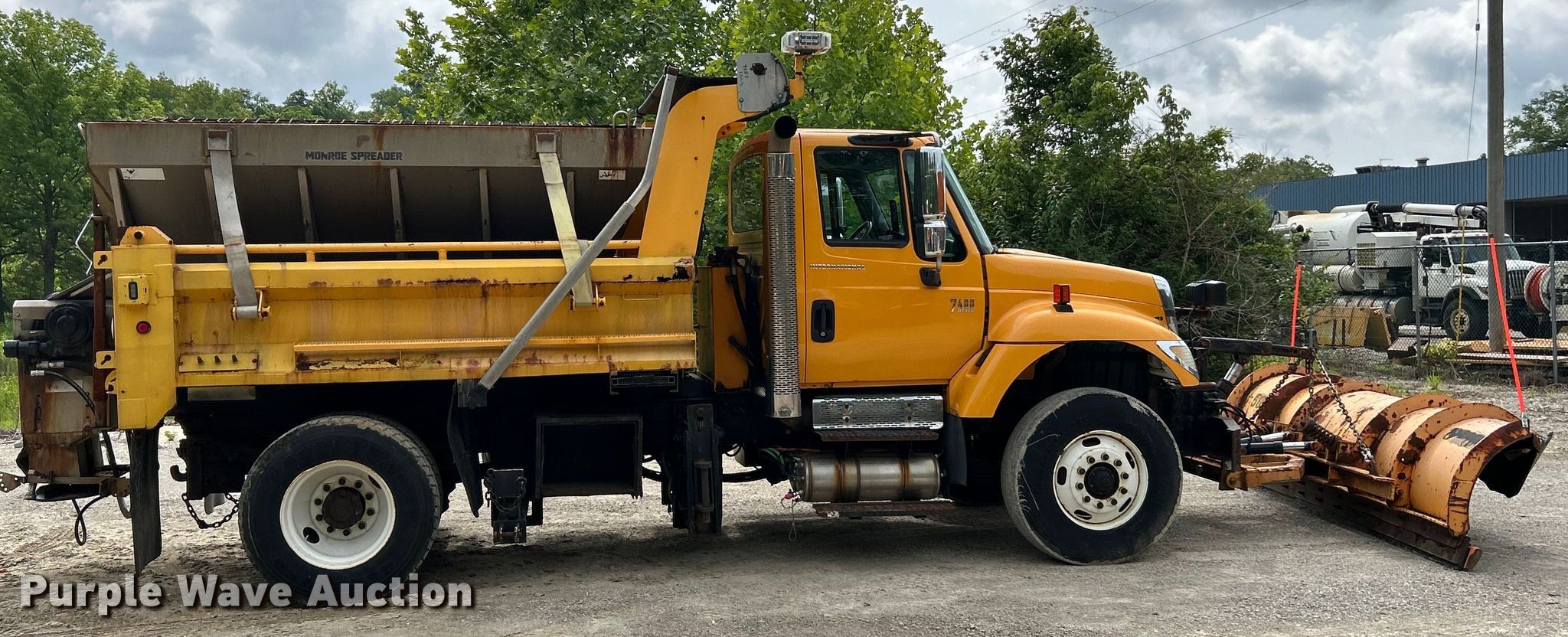 2006 International 7400 dump truck. Miles: 190,895 on odometer, Hours: 13,477 on meter, VIN: 1HTWDAAR36J244250, Unit #: 7557. Engine International DT466, Displacement: 7.6L, Cylinders: 6, Fuel type: Diesel. Transmission Automatic. Chassis Axles: Single, Suspension: Spring, Brakes: Air, PTO, GVWR: 37,000 lbs FAWR: 16,000 lbs, RAWR: 21,000 lbs. Interior AC, heat, Heated mirrors, Power windows, Cruise control. Features Dump bed 10' L x 96" W, Side height: 26", Bed type: Steel, Roll tarp, Ram: Single, End gate: Air operated, Spreader Monroe, Plow Width: 144". Tires Front: 315/80R22.5, Rear: 11R22.5. Notes Tailgate not included, Oil leak, Transmission leak, Hydraulic leak, Floor rust damage, Bed rust damage. Missouri title. Missouri Dept. of Transportation - District 6. Ballwin, MO 63021