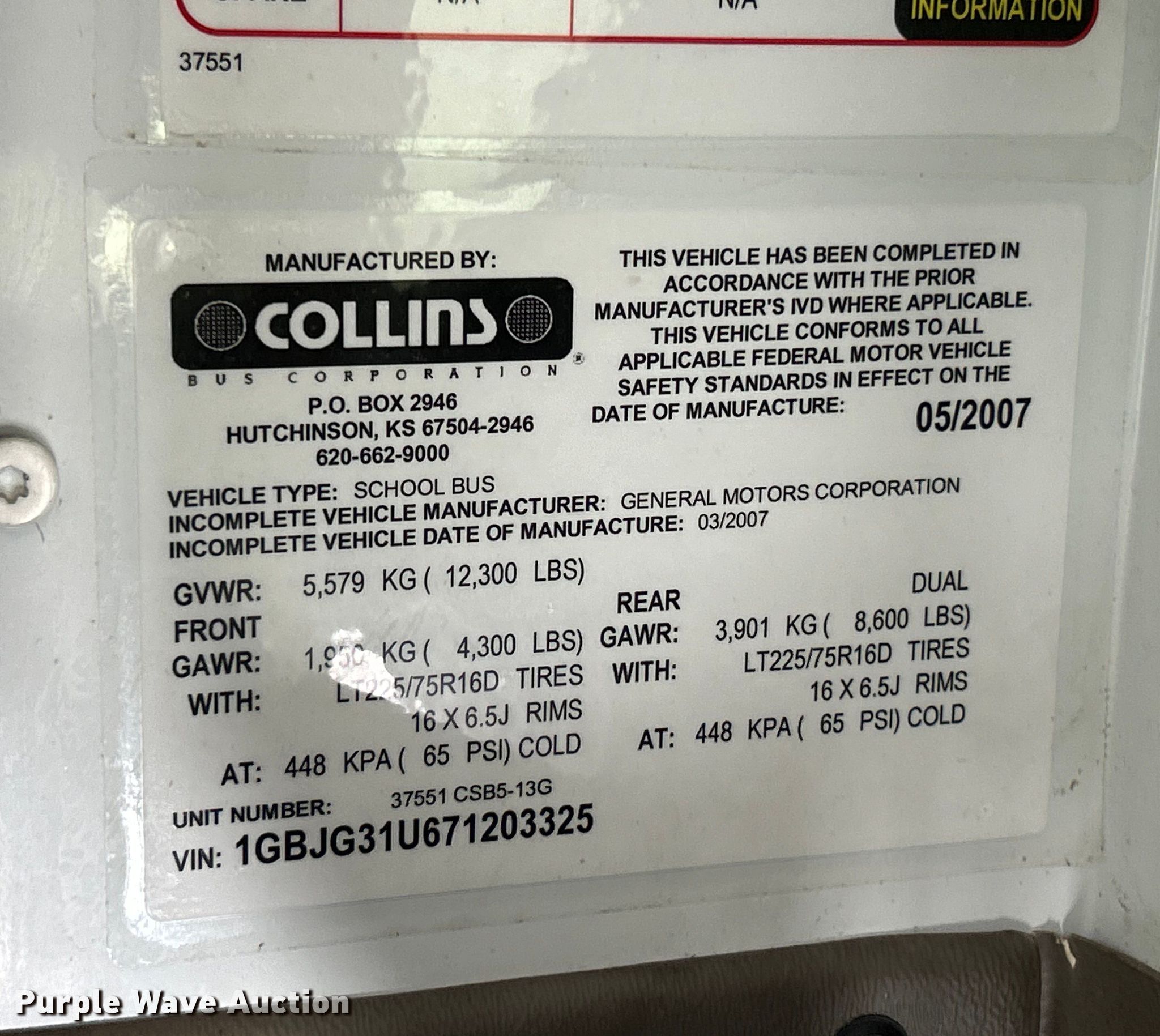 Purple Wave is selling a used Bus in Missouri. This item is a 2007 Chevrolet Express school bus with the following: Miles: 198,458 on odometer, VIN: 1GBJG31U671203325