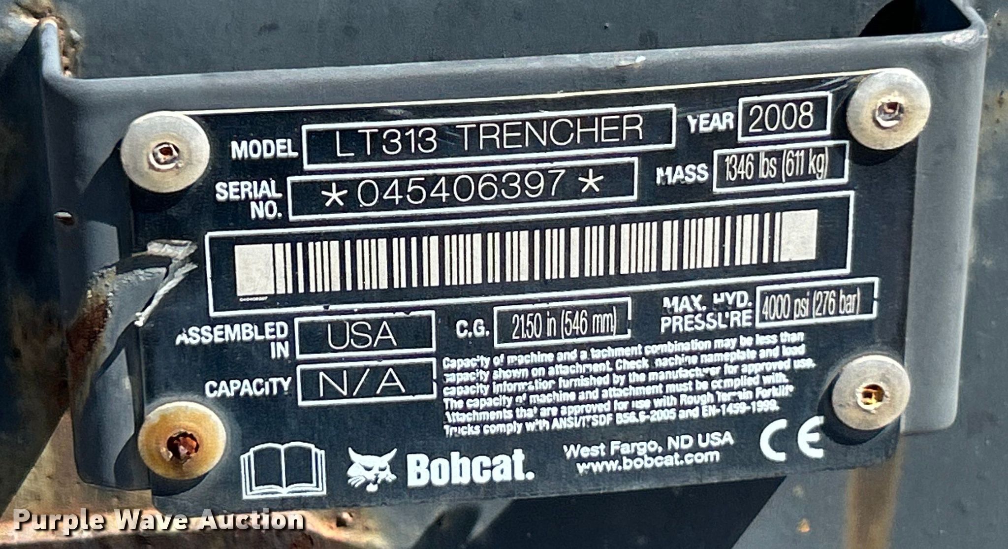 Purple Wave is selling a used Skid Steer Attach. in Missouri. This item is a 2008 Bobcat LT313 skid steer trencher with the following: Serial: 045406397, Dig depth: Approx. 5'