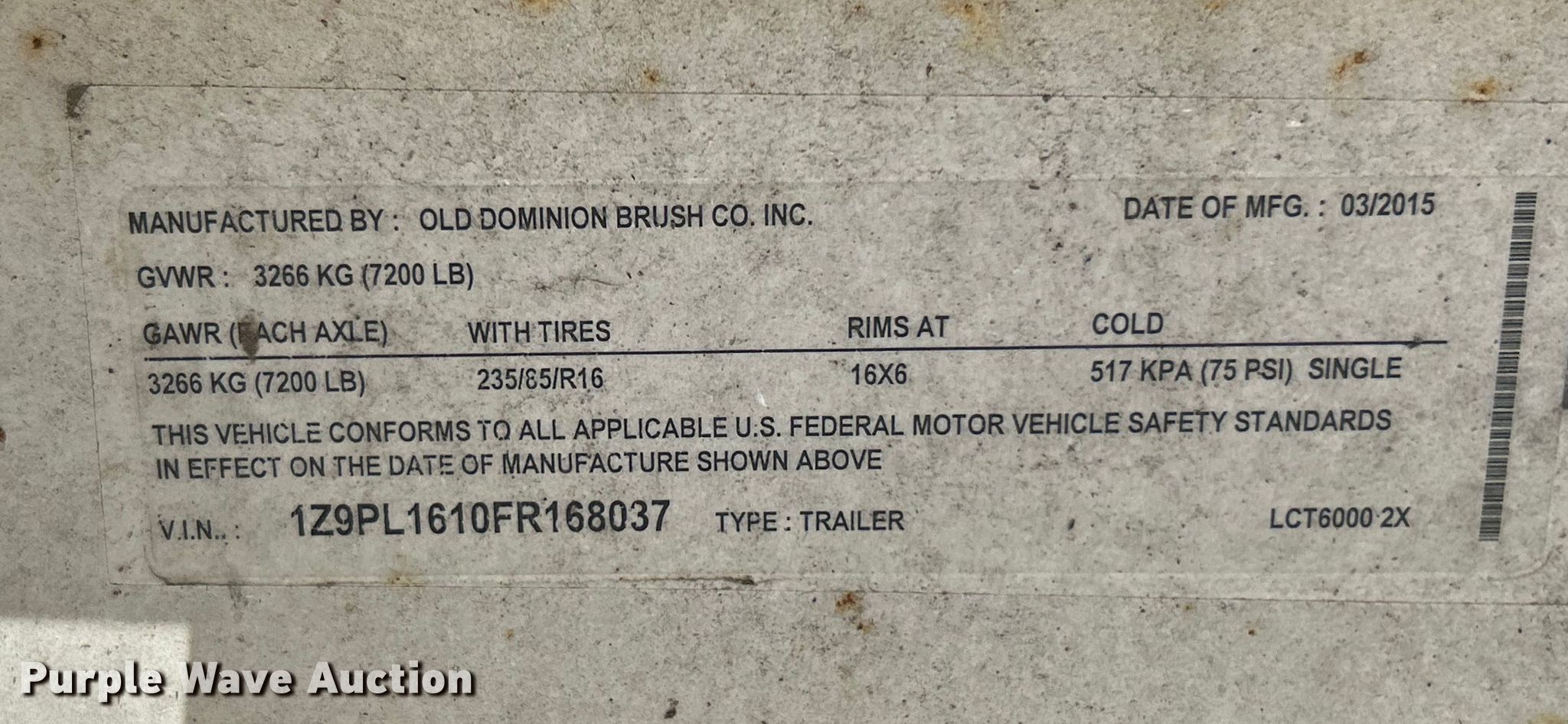 2015 Old Dominion Brush LCT6000 leaf vacuum. Hours: 2,034 on meter, VIN: 1Z9PL1610FR168037. Engine John Deere, Displacement: 4.5L, Cylinders: 4, Fuel type: Diesel. Features Suction hose Diameter: 16", Length: Approx. 11'. Trailer 15.5' L x 84" W, Brakes: Electric, Axles: Single, Tire size: ST235/85R16, GVWR: 7,200 lbs. Notes Additional chute included. Missouri title. Title distribution may be delayed up to 14 days from verification of funds. City of Clayton, MO. Clayton, MO 63105