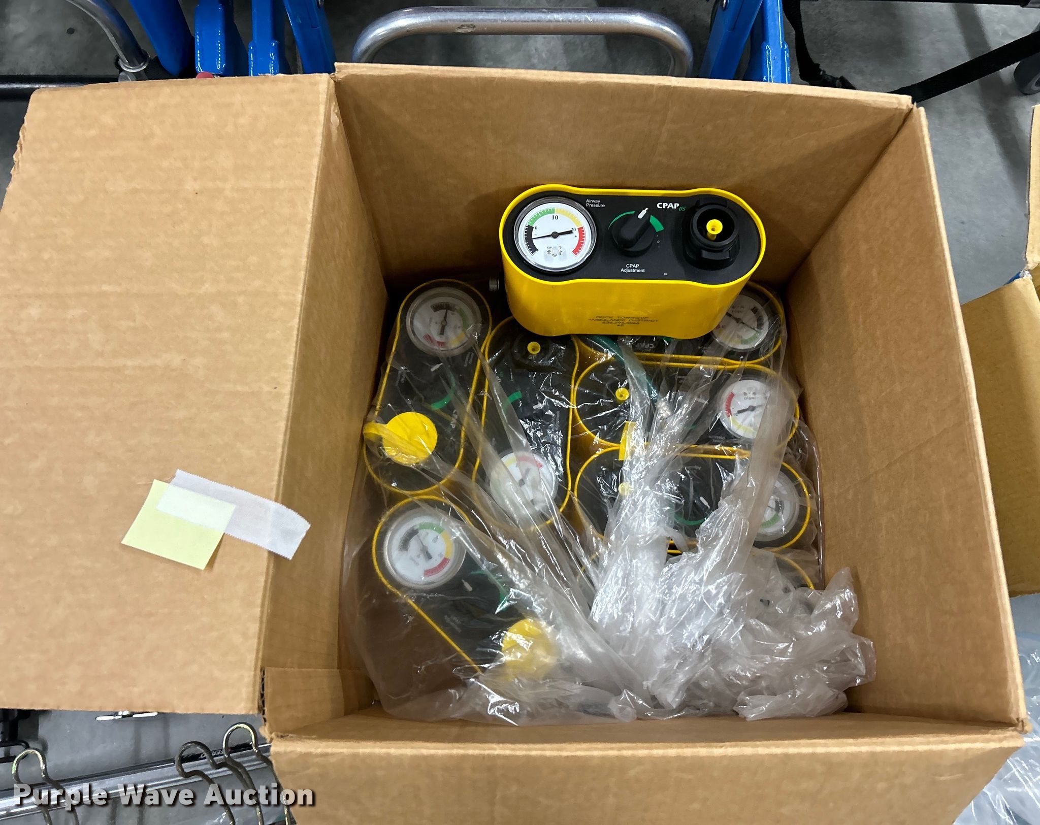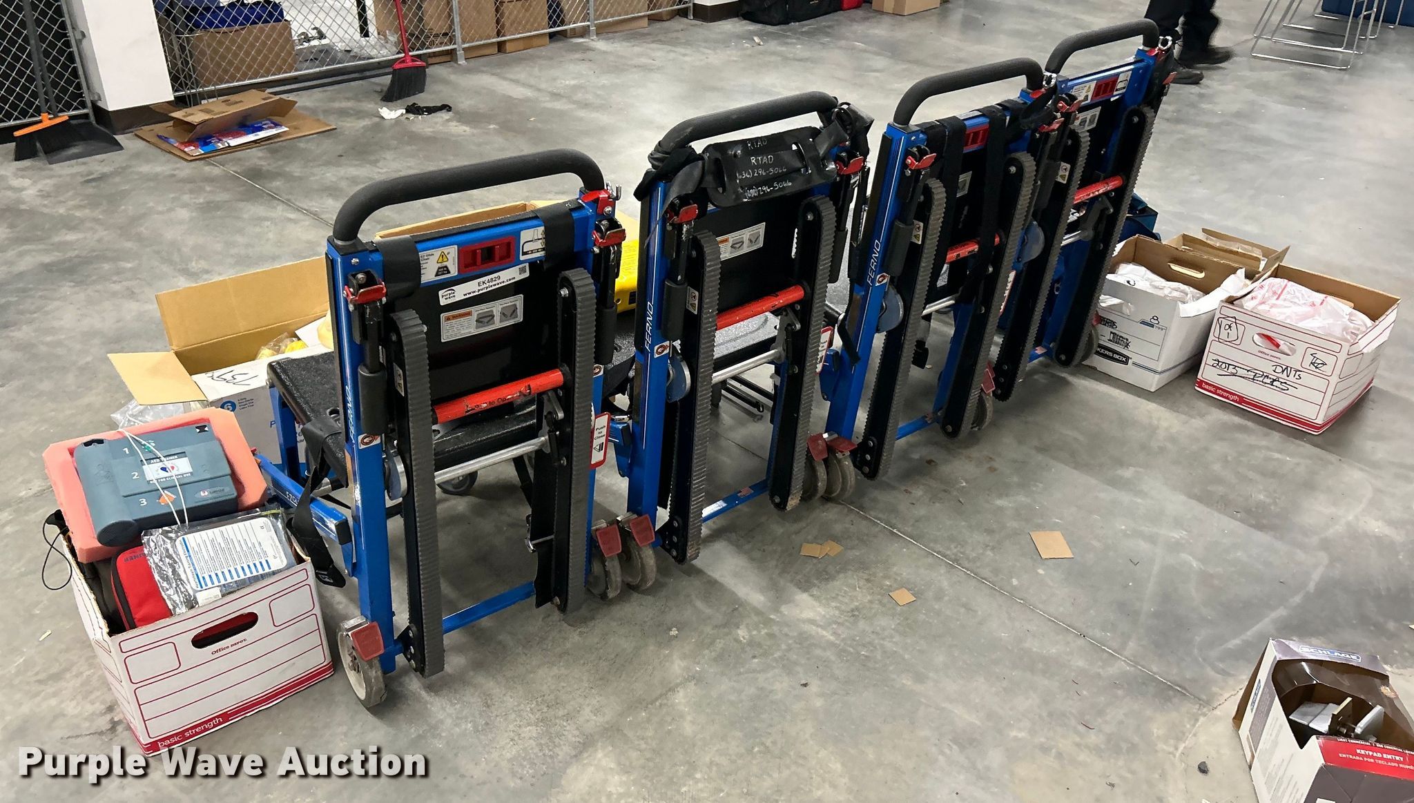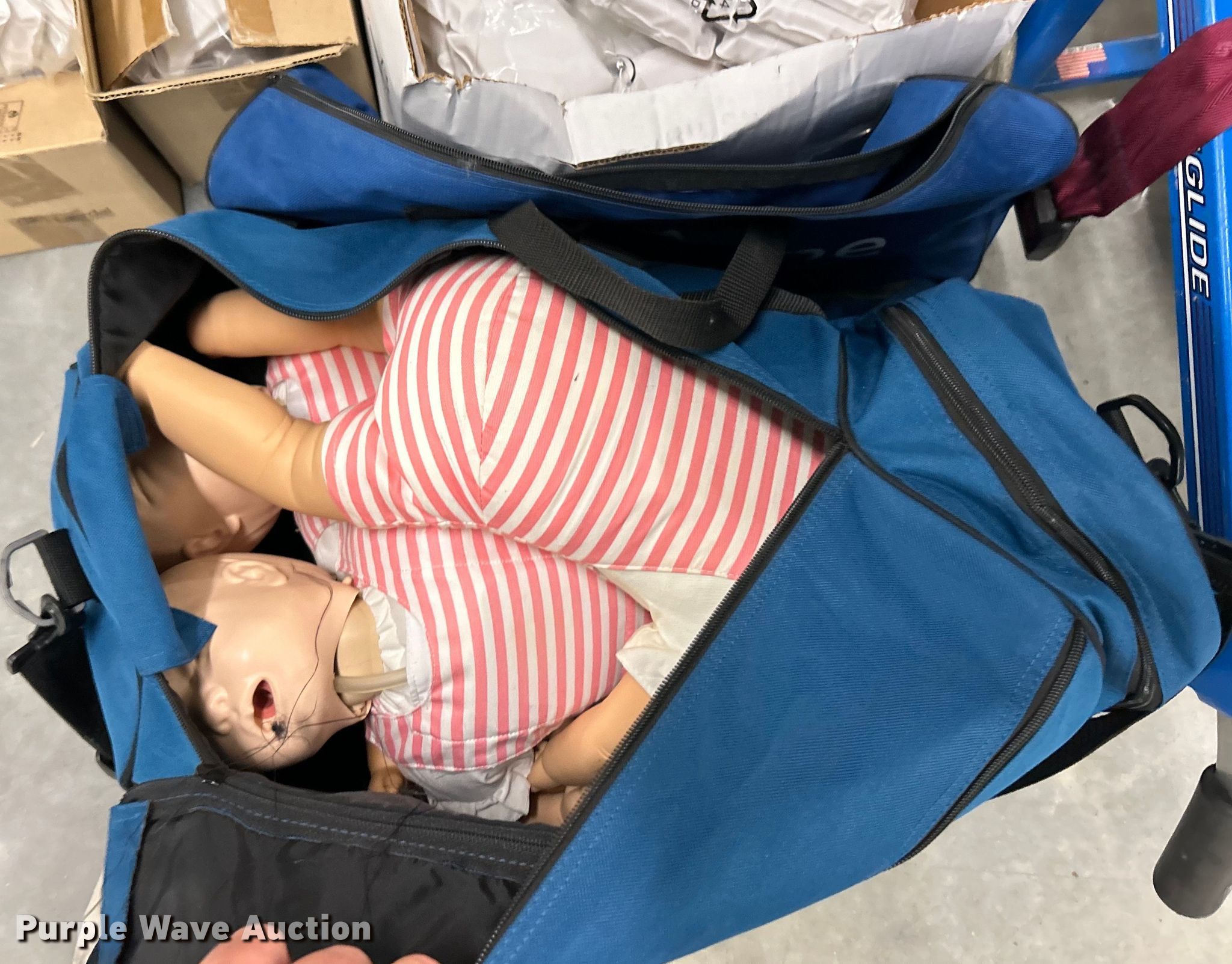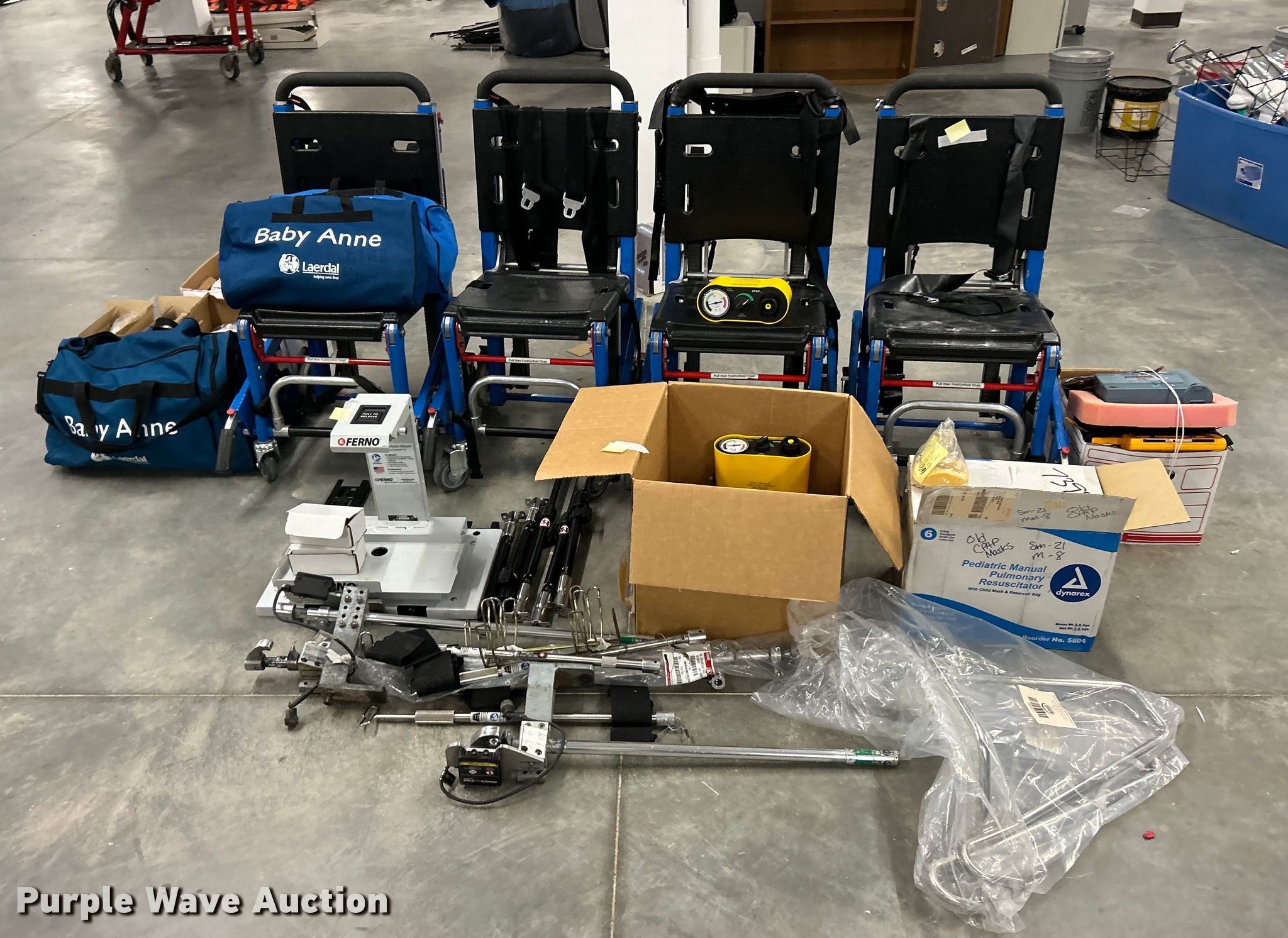 Purple Wave is selling a used Medical Equip. in Missouri. This item is a EMT equipment with the following: Ferno EZ glide stair chairs, AED trainers, CPAP05, Ferno stretcher mounts, CPR baby mannequins