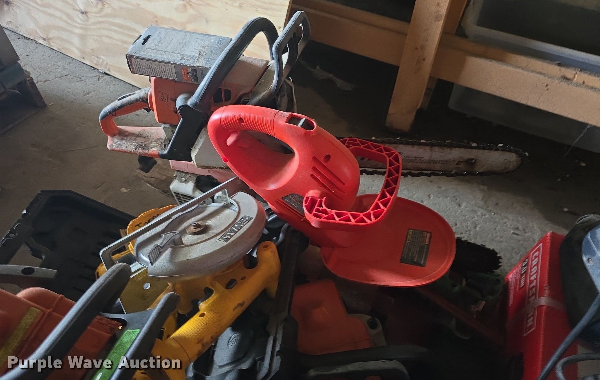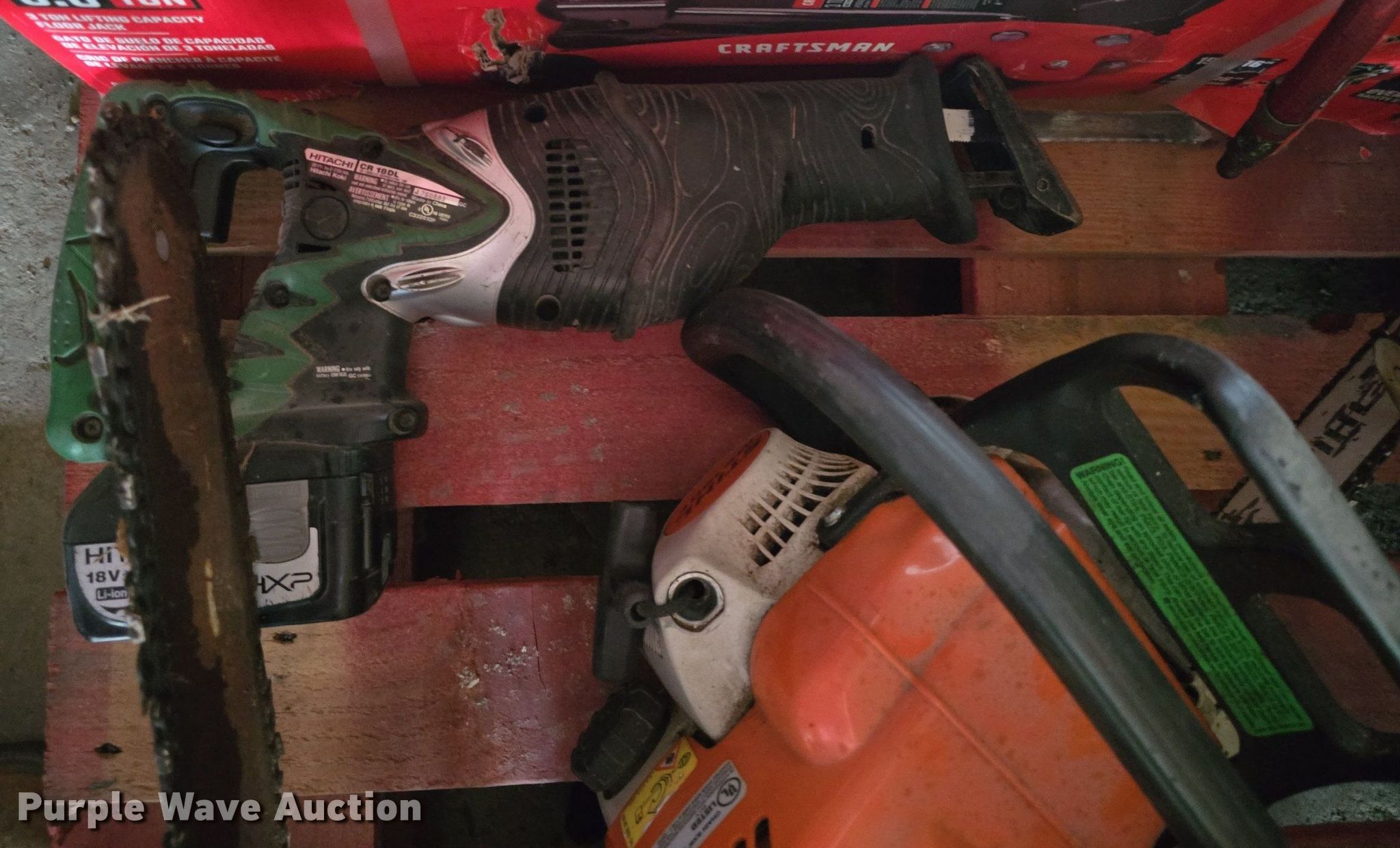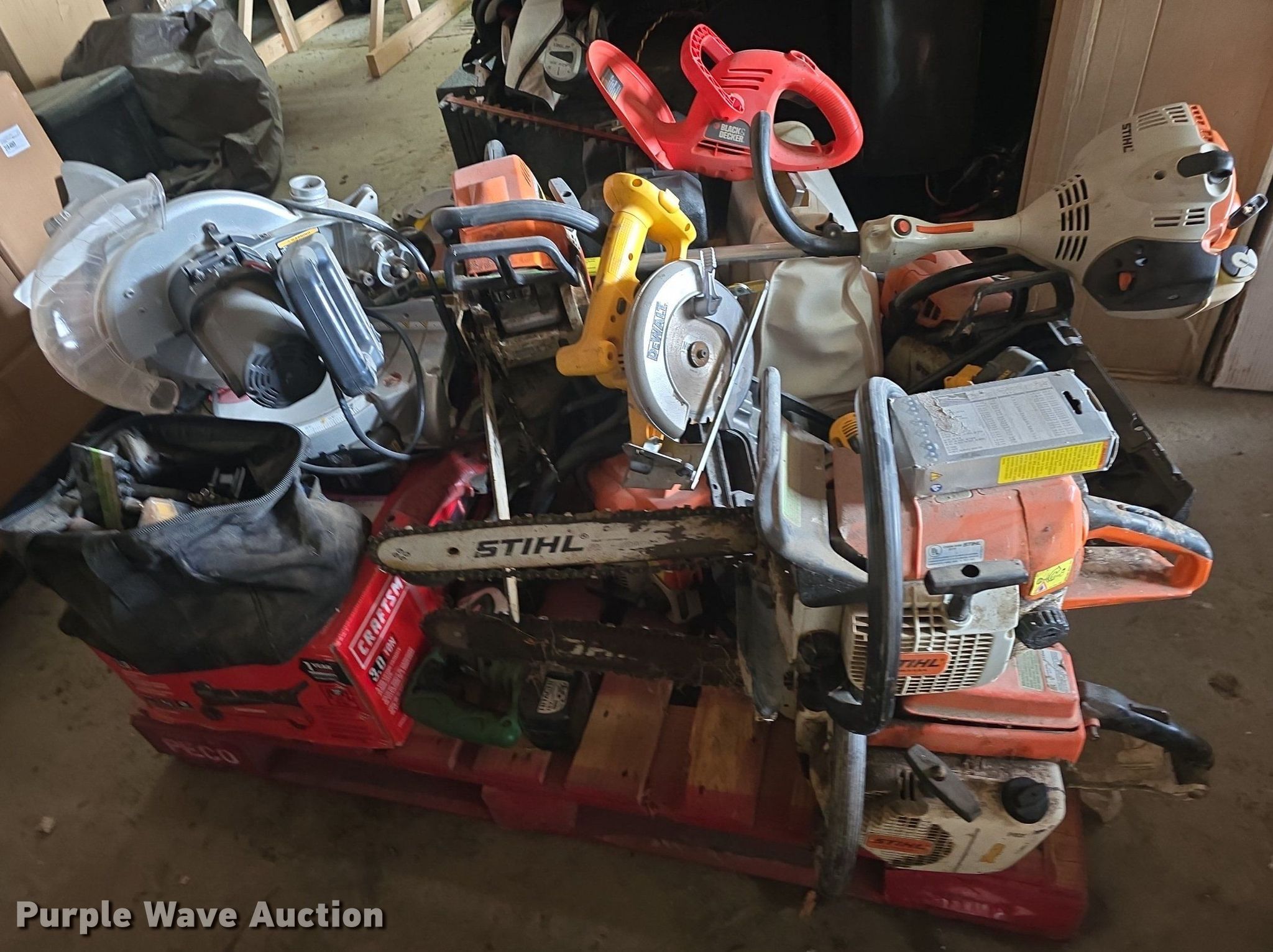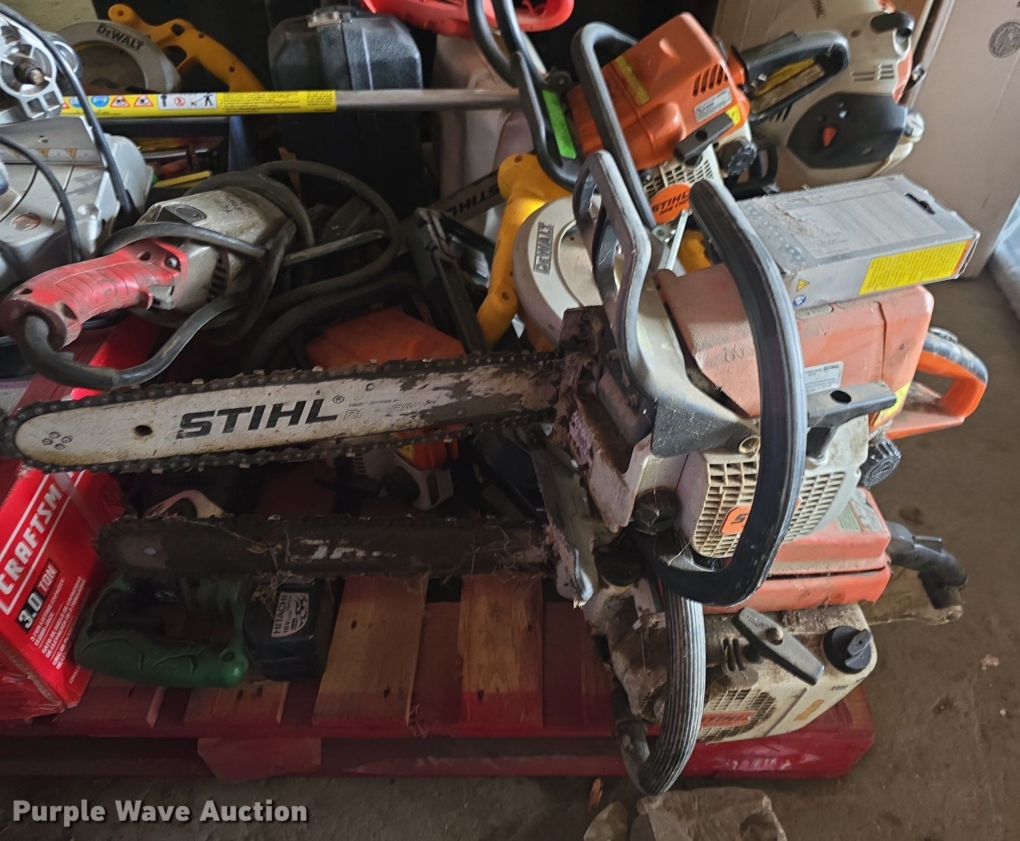 Purple Wave is selling a used Tools in Kansas. This item is a Tools with the following: Circular saws, Chainsaws, Stihl edger, Hedge trimmers, Sawzall, Craftsman floor jack and more