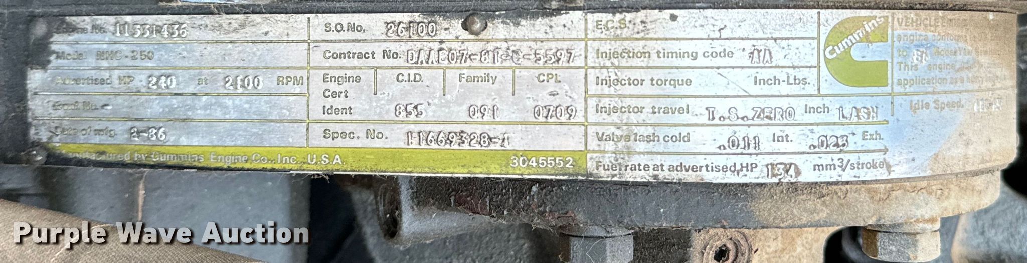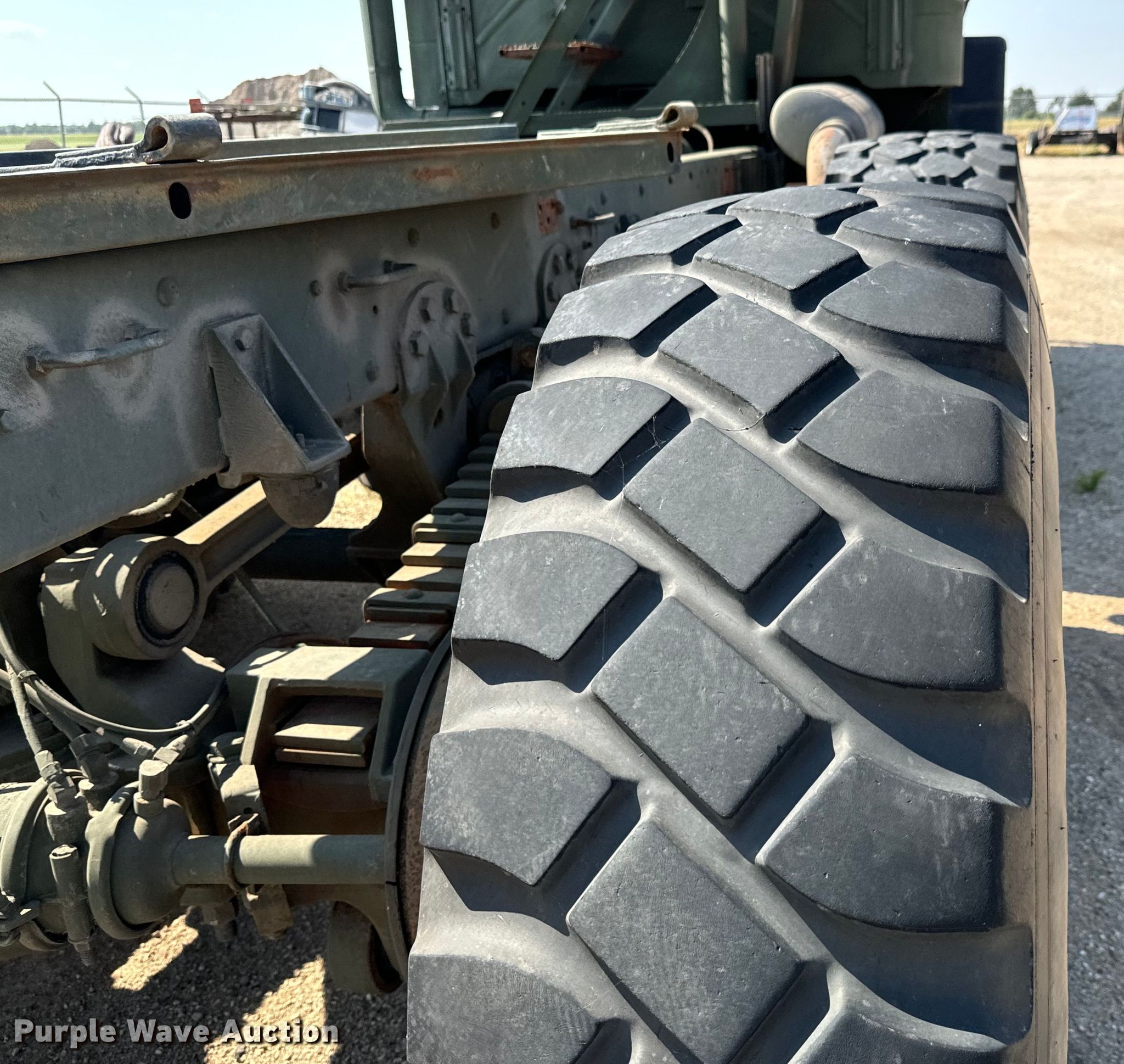 1985 AM General M923A1 truck cab and chassis. Miles: 1,883 on odometer, Hours: 190 on meter, VIN: NL2777. Engine Cummins NHC-250, Displacement: 855 C.I.D., Cylinders: 6, Fuel type: Diesel. Transmission Automatic, Six wheel drive. Chassis Axles: Tandem, Suspension: Spring over walking beam, Brakes: Air, Chassis length: 15'L, Wheelbase: 179". Interior Heat. Tires Size: 14.00R20. Notes Windshield chipped or cracked, Dead battery, Passenger door handle issues, Flat tire, Non-operational engine, Non-operational unit. Kansas title. Title distribution may be delayed up to 14 days from verification of funds. City of Cheney. Cheney, KS 67025