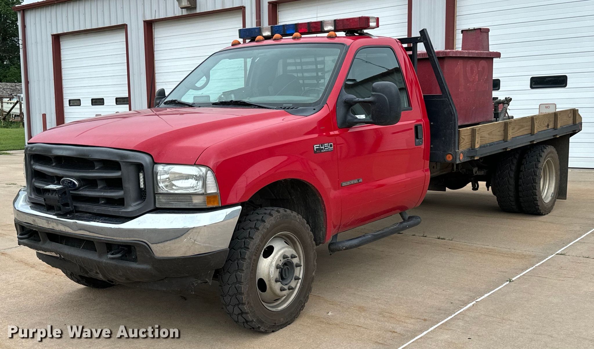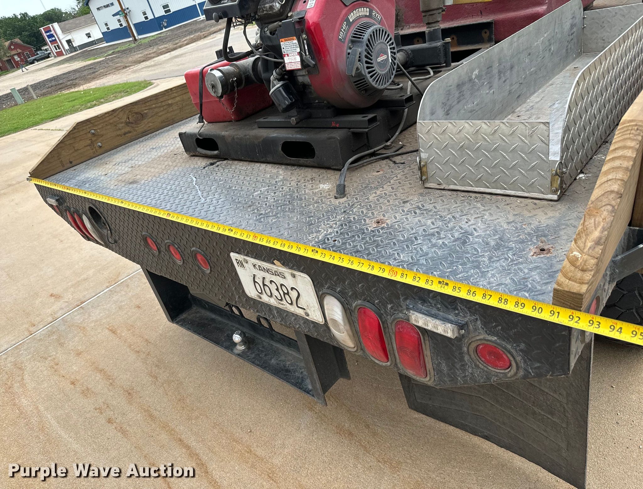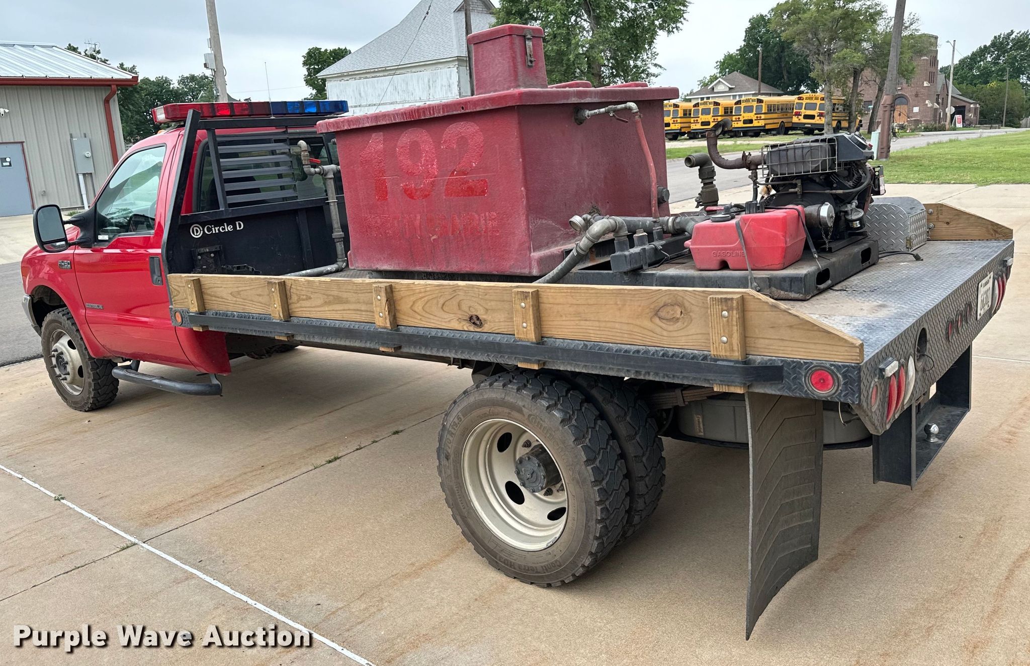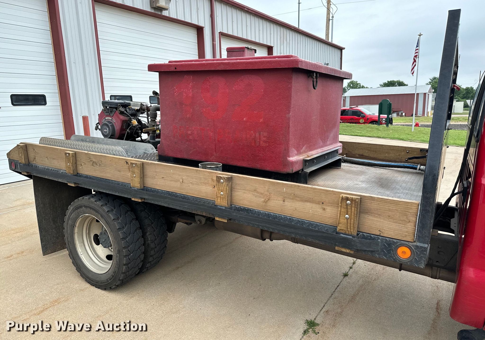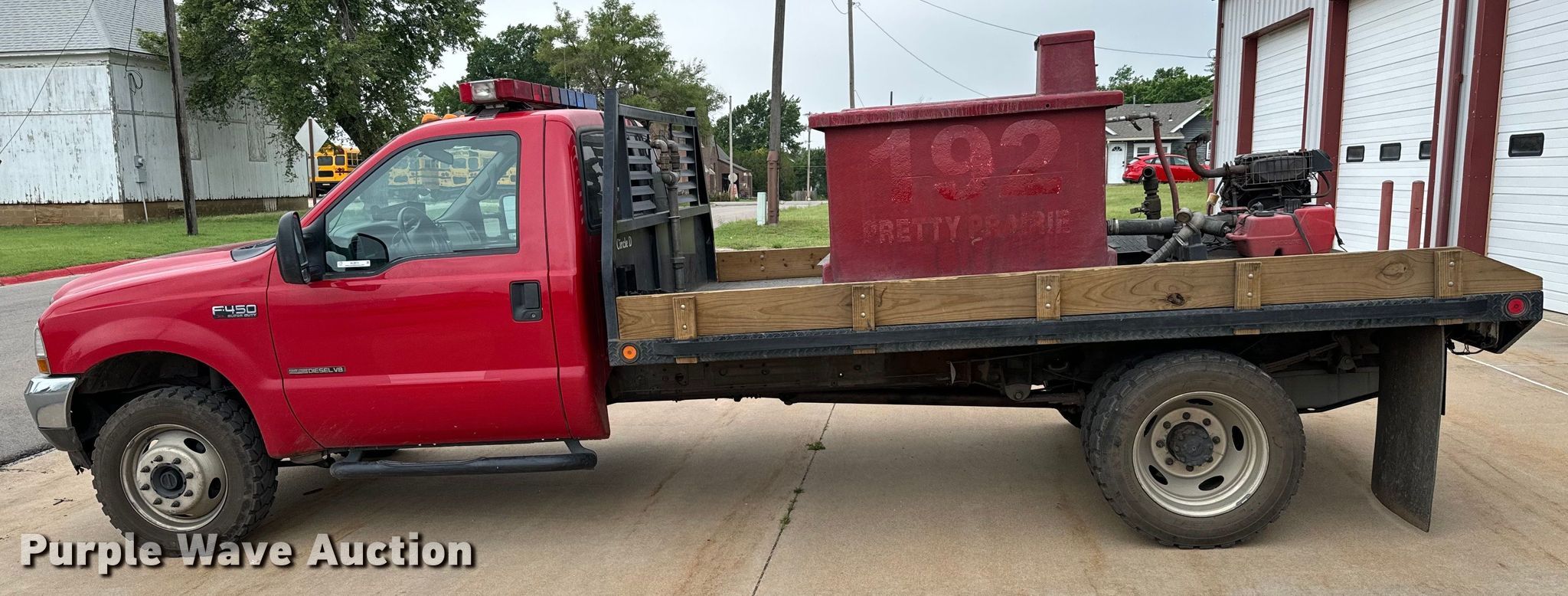 2002 Ford F450 Super Duty XL brush fire truck. Miles: 91,140 on odometer, VIN: 1FDXF47F22ED67112. Engine Displacement: 7.3L, Cylinders: 8, Fuel type: Diesel. Transmission Automatic. Chassis Four wheel drive, Axles: Single, Suspension: Spring, Brakes: Hydraulic, GVWR: 15,000 lbs. Interior AC, Heat, Cruise control. Features Flatbed Circle D, Dimensions: 12' L x 92" W, Pump, Engine Briggs & Stratton Vanguard, Cylinders: 2, Fuel type: Gas, HP: 18, Tank Capacity: 300 gallons, PA/siren controls. Tires Size: 225/70R19.5. Notes Windshield chipped or cracked, Unknown operating condition of AC. Kansas title. Title distribution may be delayed up to 14 days from verification of funds. Reno County Rural Fire Dept. Pretty Prairie, KS 67570