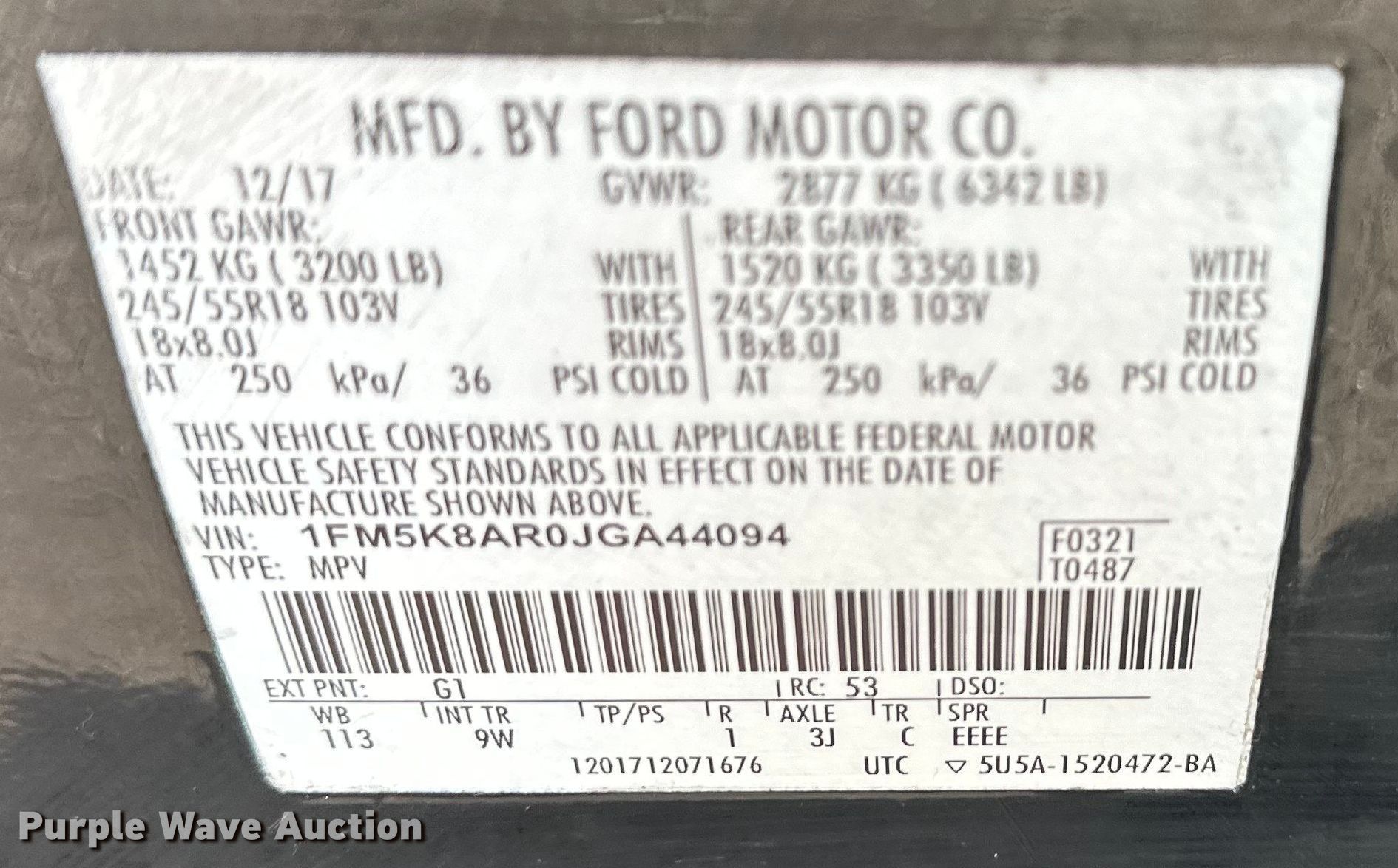 - VIN: 1FM5K8AR0JGA44094