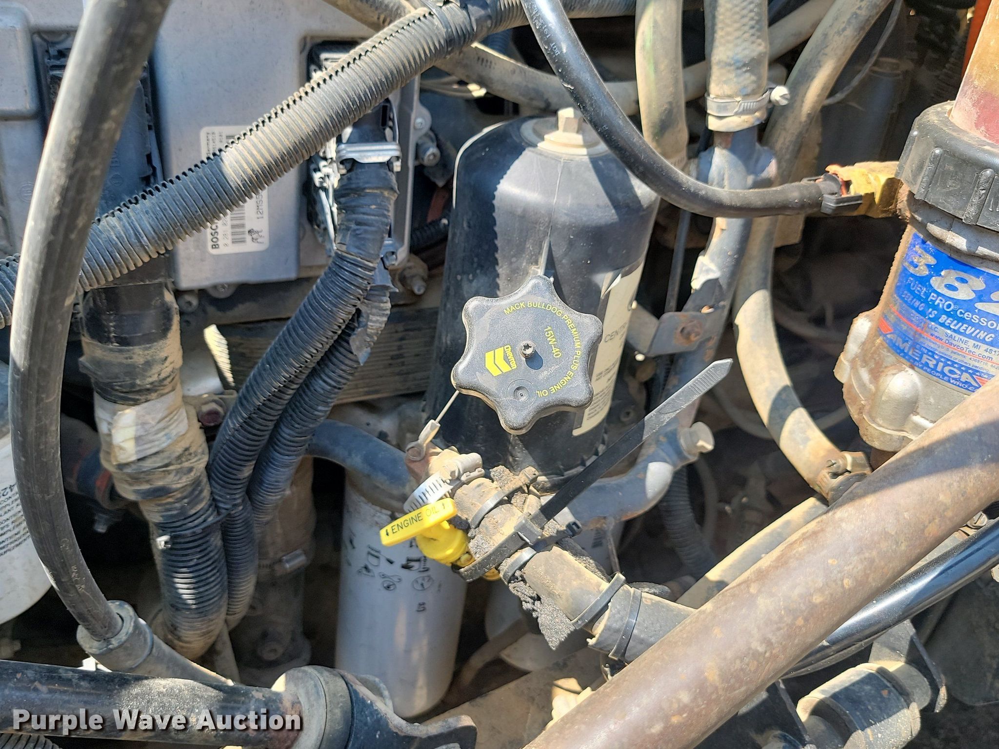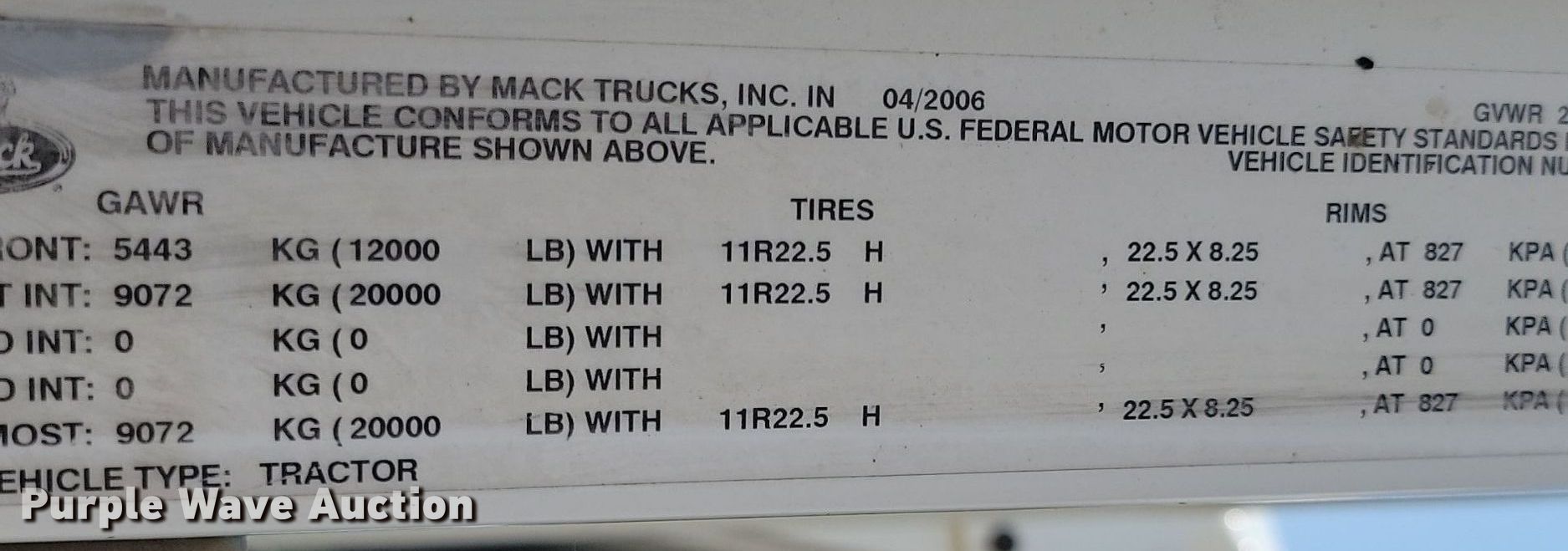 2007 Mack Vision CXN613 semi truck. Miles: 871,402 on odometer, Hours: 27,691 on meter, VIN: 1M1AK06Y97N017274. Engine Mack, Displacement: 12.0L, Cylinders: 6, Fuel type: Diesel. Transmission Manual. Chassis Axles: Tandem, Differential lock: Inter-axle, Suspension: Air Dump valves, Brakes: Air, PTO, GVWR: 52,000 lbs FAWR: 12,000 lbs, IAWR: 20,000 lbs, RAWR: 20,000 lbs. Interior AC, Heat, Heated mirrors, Power windows, Power locks, Cruise control, Air ride cab, Sleeper Sleeper length: 54", Beds: Single, Rear climate control. Features Fifth wheel type: Fixed, Fuel tank: Dual. Tires Size: 11R22.5. Notes Dash warning indicator: ABS, Windshield chipped or cracked, Turbo issues. South Dakota title. Day County Highway Department. Webster, SD 57274