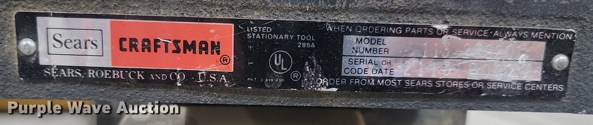 Purple Wave is selling a used Tools in South Dakota. This item is a Craftsman 113239201 shaper with the following: HP: .5, Volts: 115, Phase: Single, Serial: 2113P0026