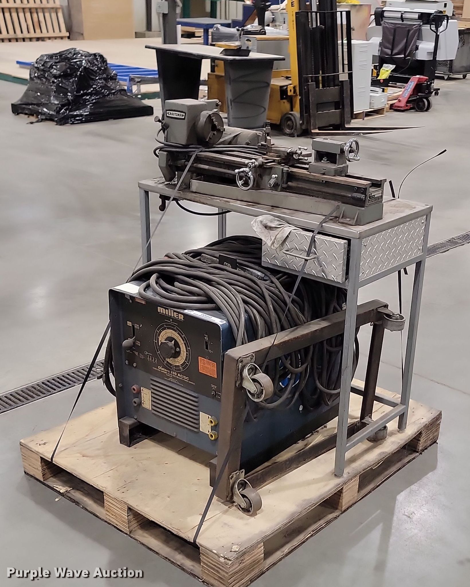 Purple Wave is selling a used Tools in South Dakota. This item is a Tools with the following: Miller Dial Arc 250 welder, Capabilities: AC, DC, Stick, Craftsman lathe, Volts: 115/230, HP: 1/3, Phase: Single