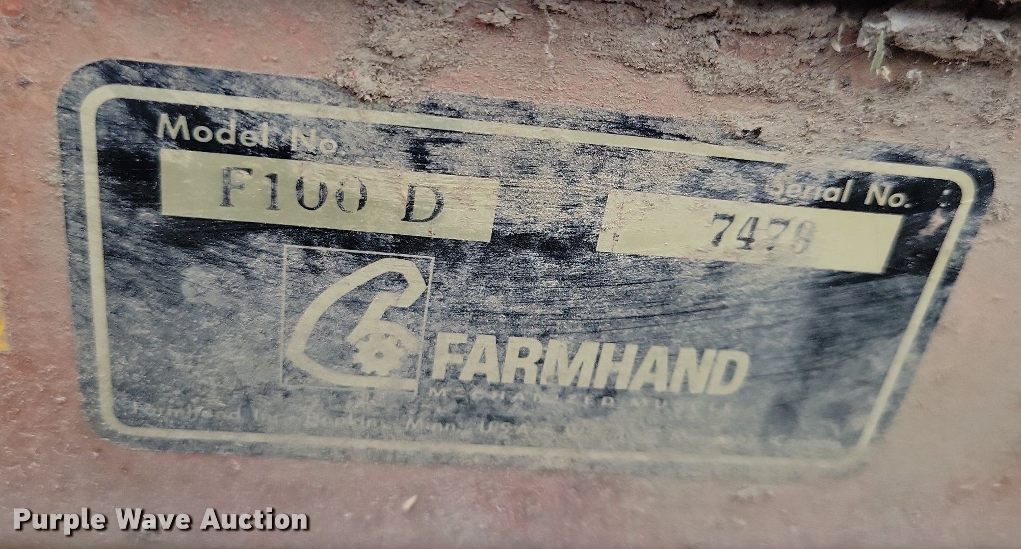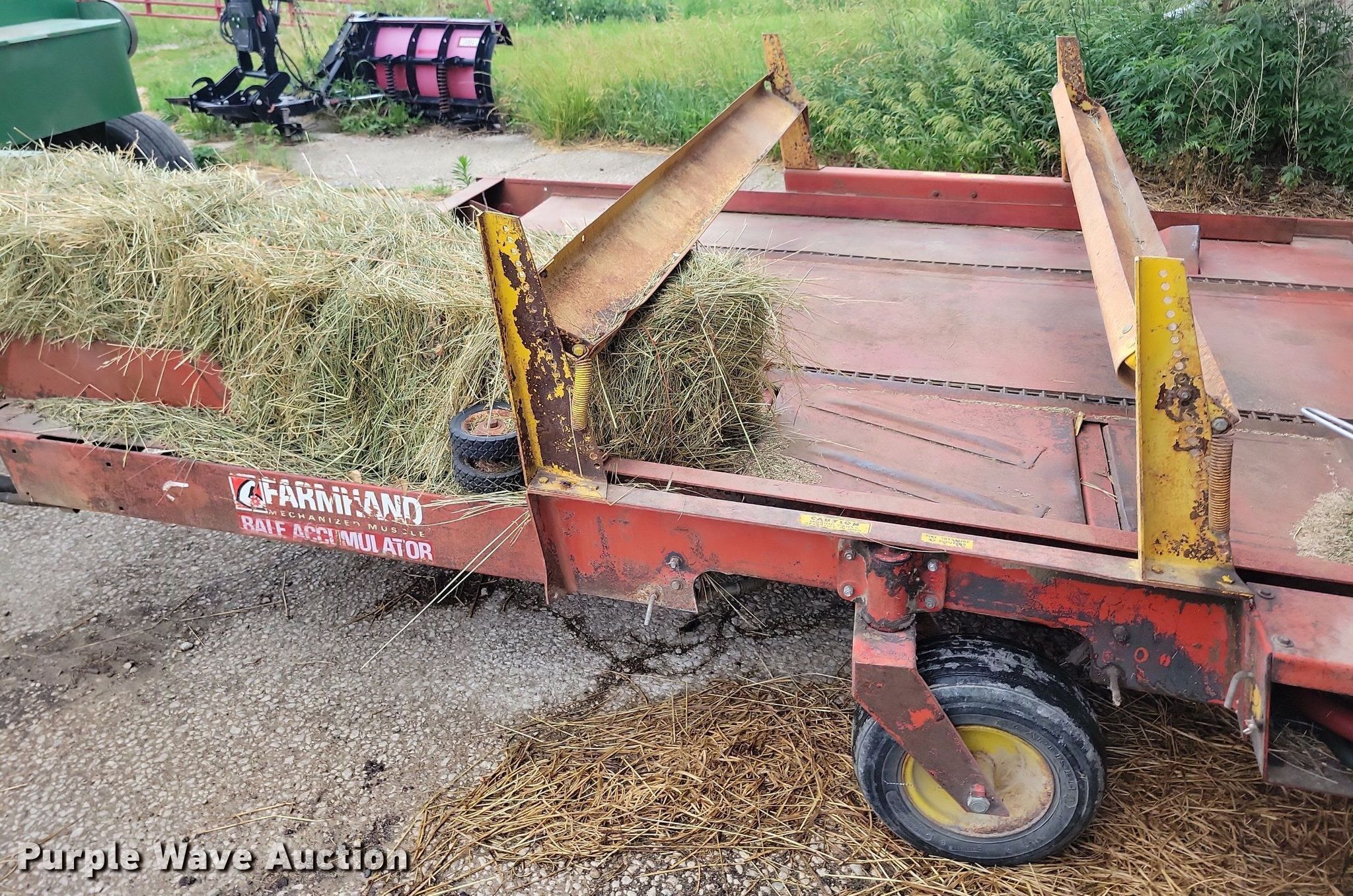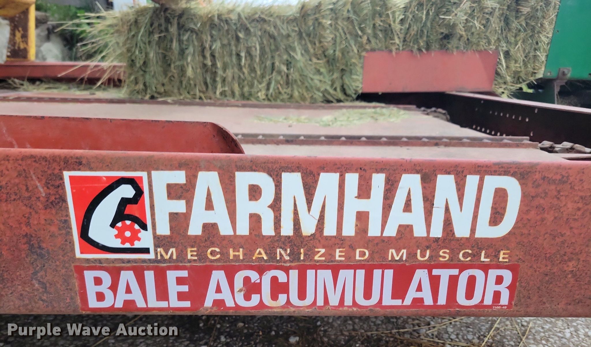 John Deere 348 small square baler. Serial: E00348X843837. Features PTO: 540, Pickup width: 66", Small square bale size: 14"x18", Knotters Quantity: 2, Twine tie, Bale accumulator Capacity: 8, Make: Farmhand. Tires Size: 26x12-12. Notes Contents not included. Winterset, IA 50273