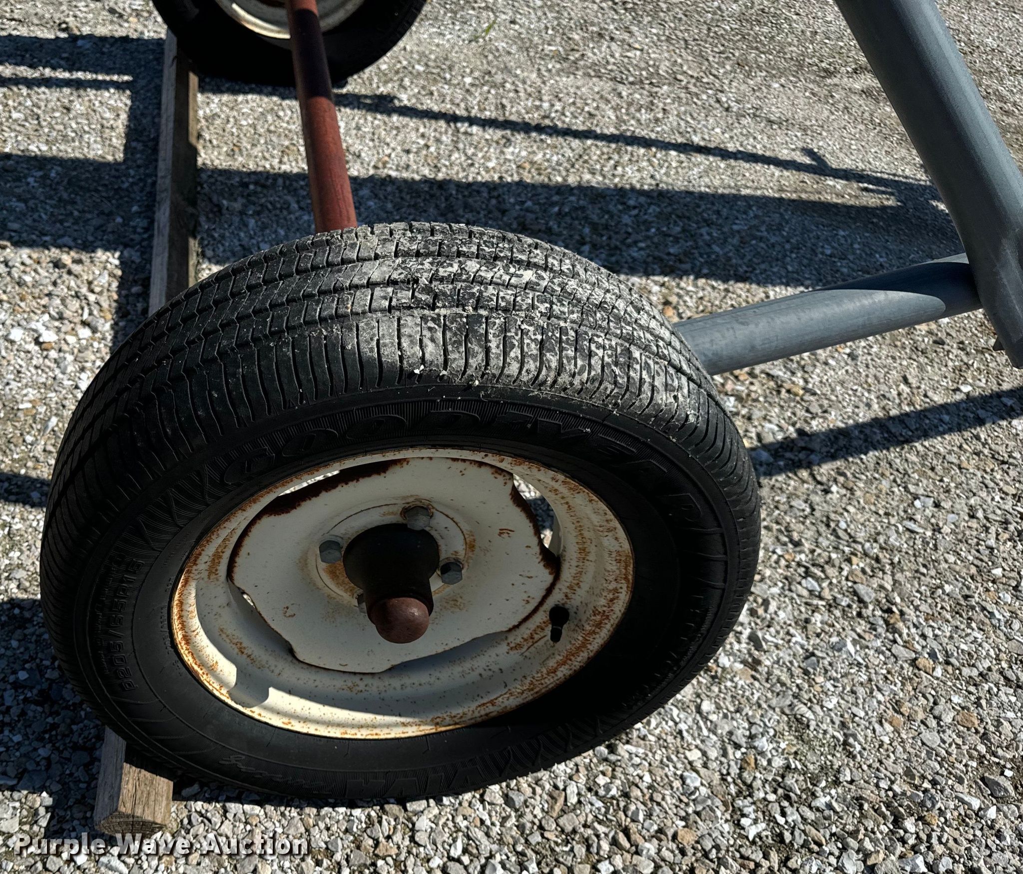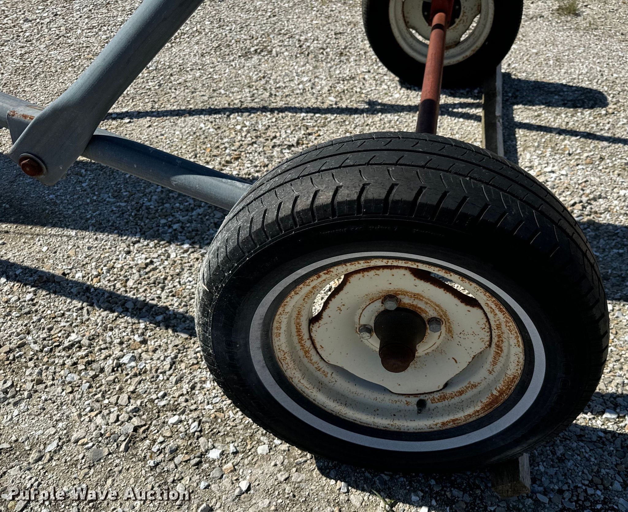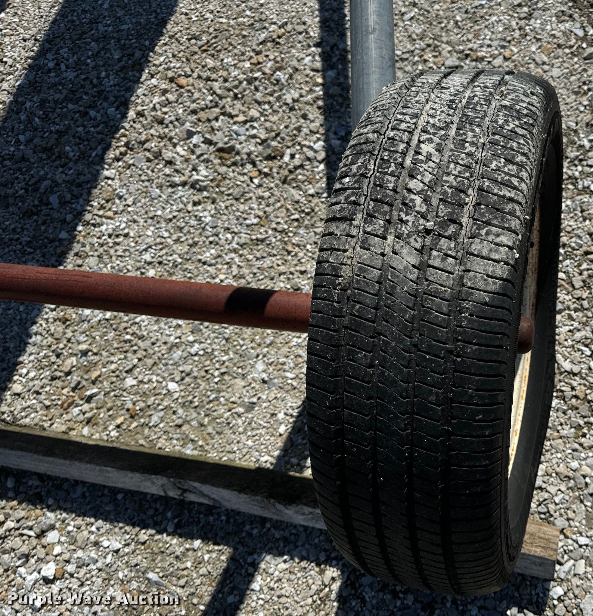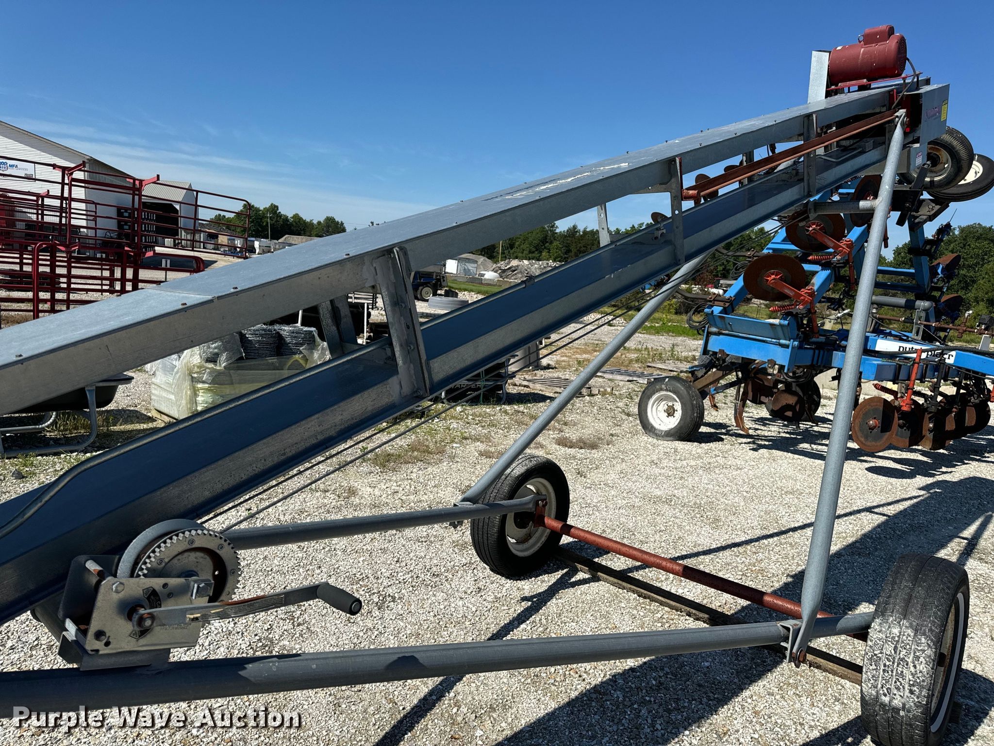 Cardinal Farm CBC10-23E conveyor. Serial: BC10-499. Electric Motor Volts: 220, Phase: Single. Features Length: 26', Width: 6", Lift: Manual. Tires Rear: P205/65R15. Notes Tires damaged. MFA Ag Inc.. Columbia, MO 65202