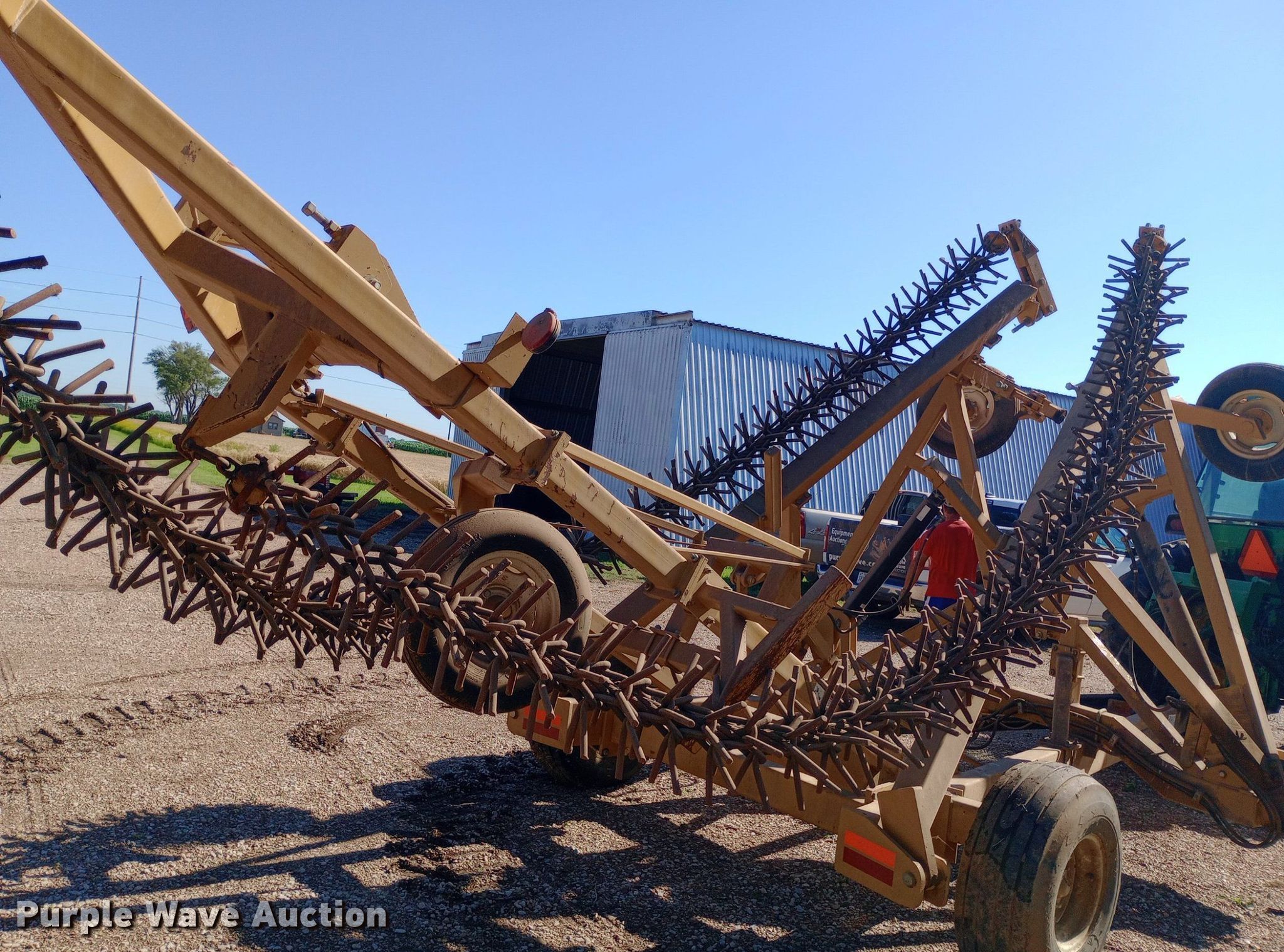 Phillips 3003A rotary harrow. Overall width: 30', Serial: 30TA-04087. Features Operation Hydraulic fold, Attachments Rolling pickers/ treader. Tires Tire size: 12.5L-15. Clearwater, KS 67026
