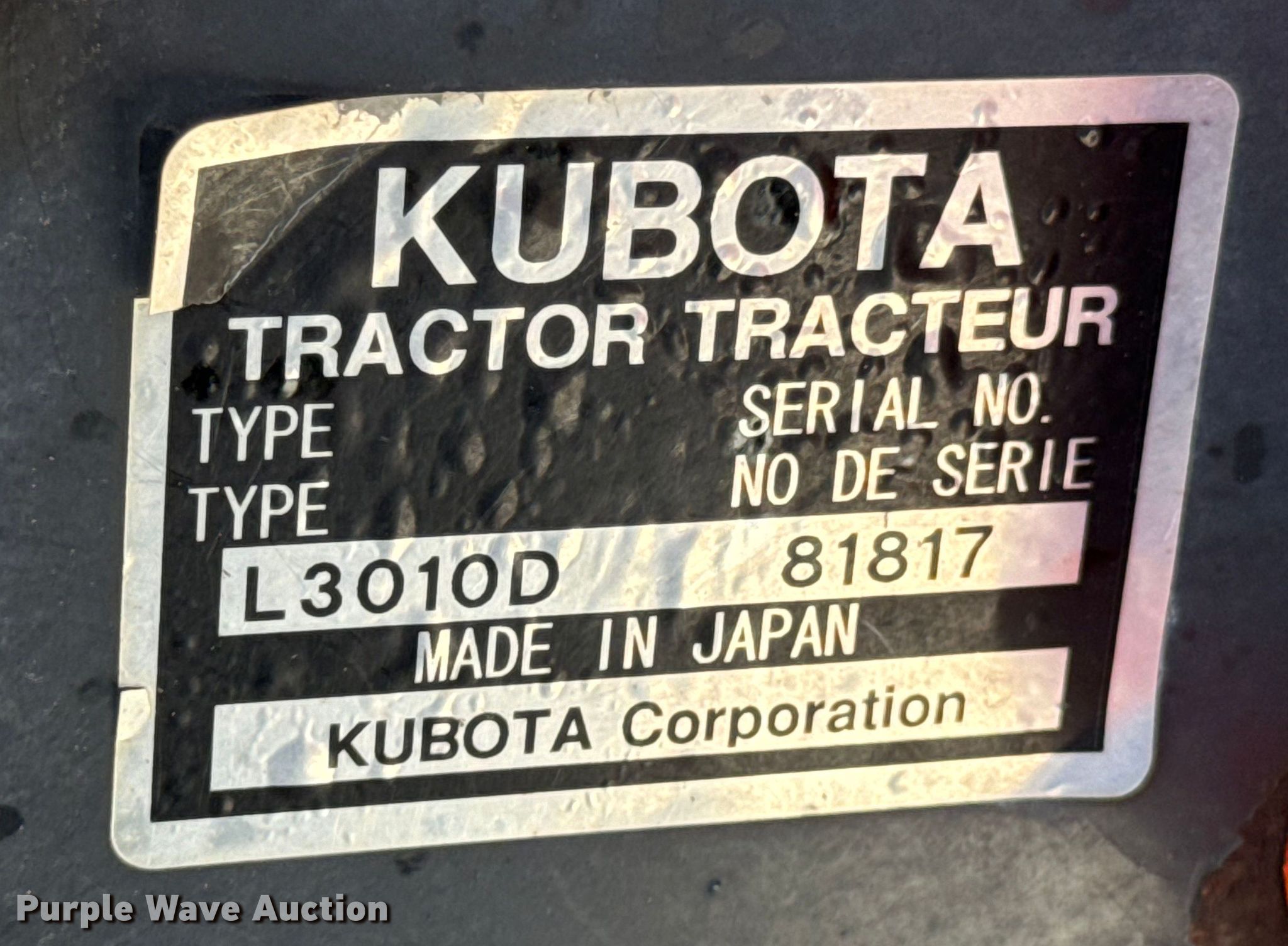 Purple Wave is selling a used Tractor in Kansas. This item is a Kubota L3010D MFWD tractor with the following: Hours: 734 on meter, Serial: 81817