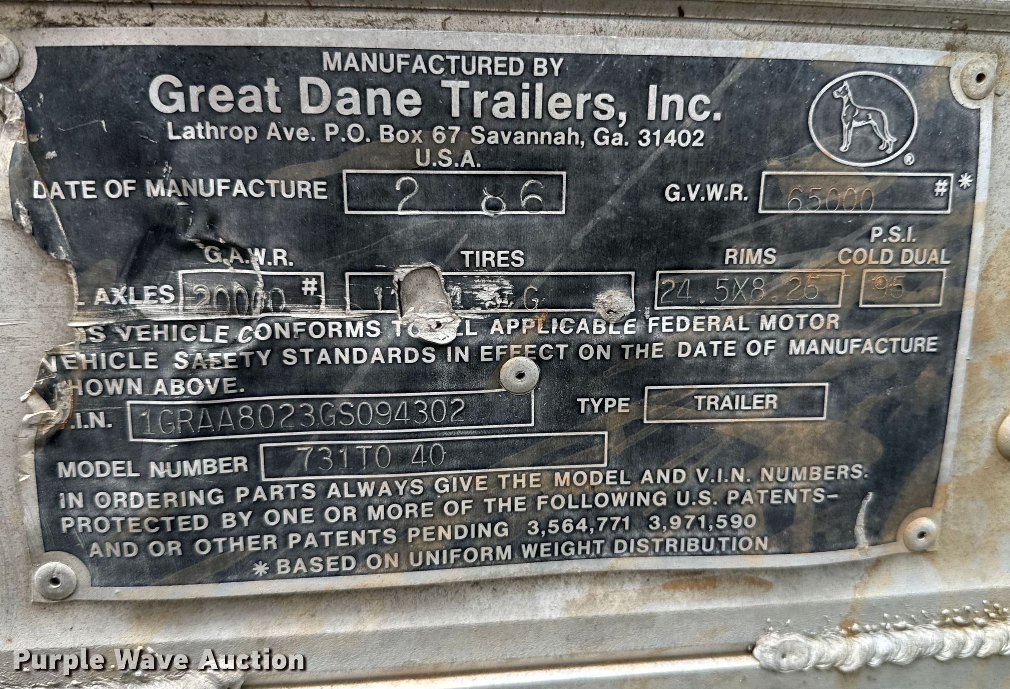 Purple Wave is selling a used Grain or Commodity Trailer in Arkansas. This item is a 1986 Great Dane grain trailer with the following: VIN: 1GRAA8023GS094302