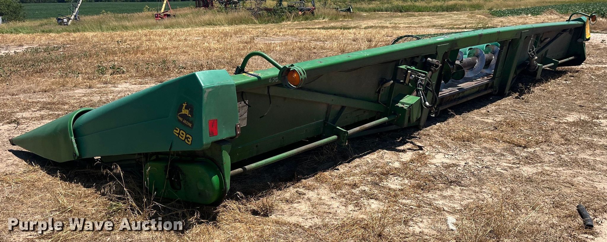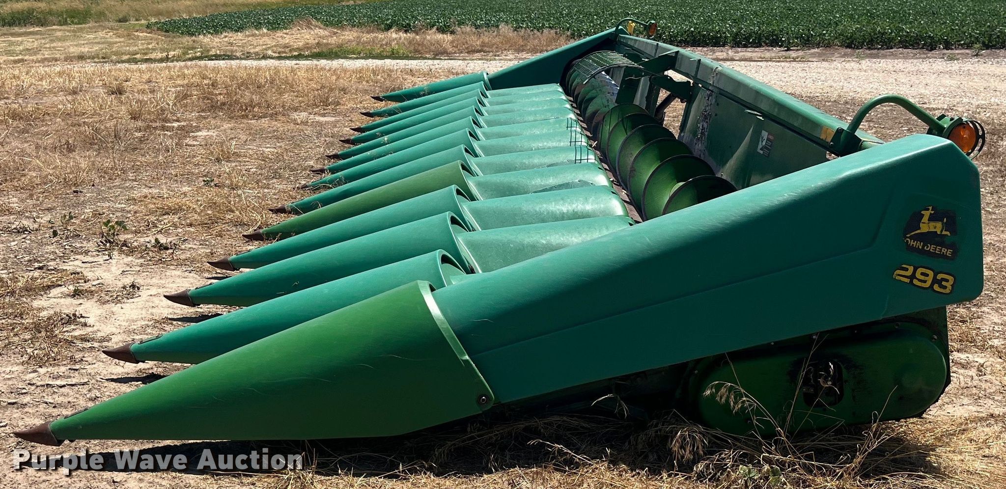 John Deere 1293 corn head. Features. Rows: 12, Row spacing: 30", Hydraulic deck plates, Single point coupler, Drivelines: Dual. Otter Creek Farms. Clarence, MO 63437