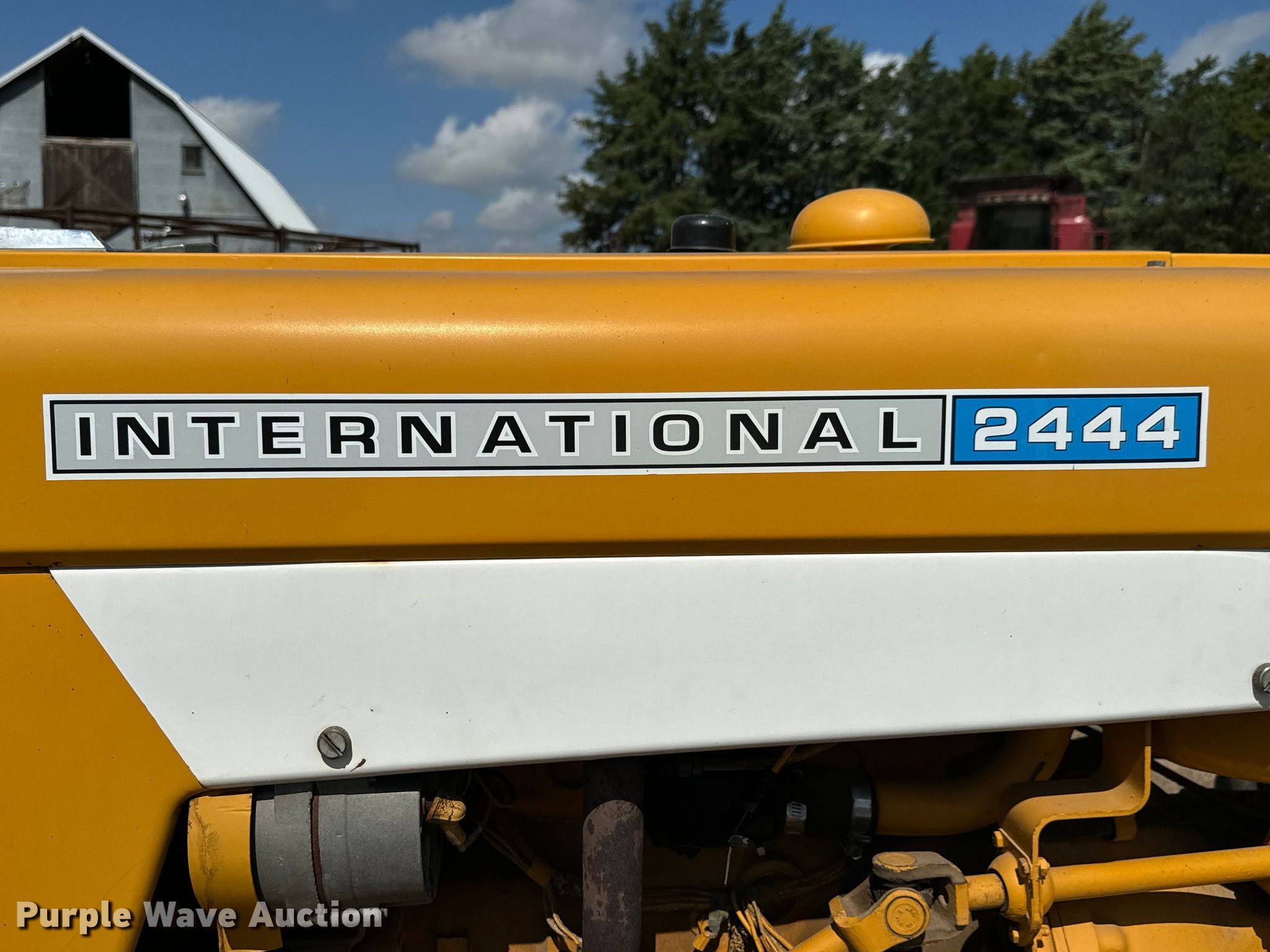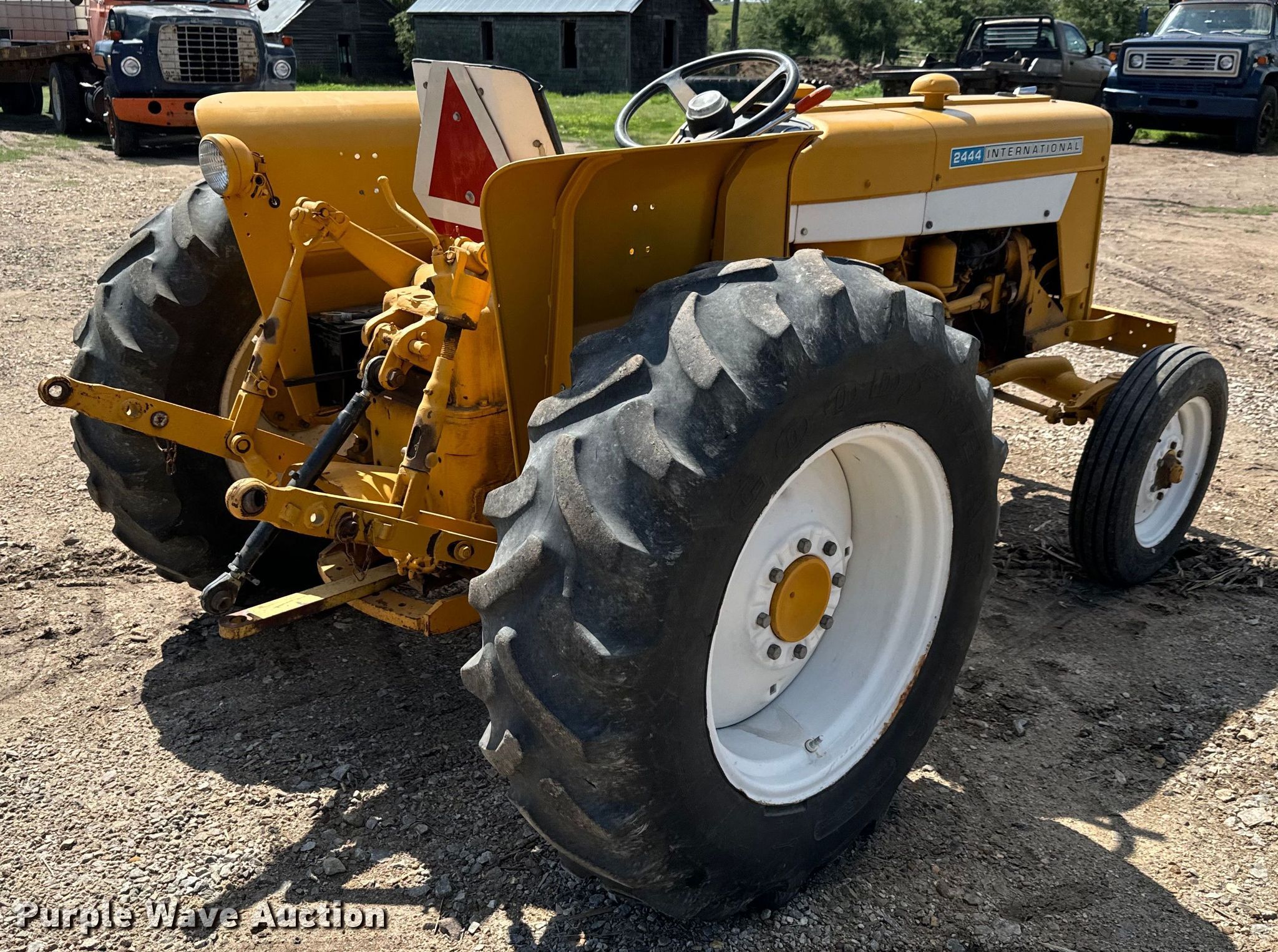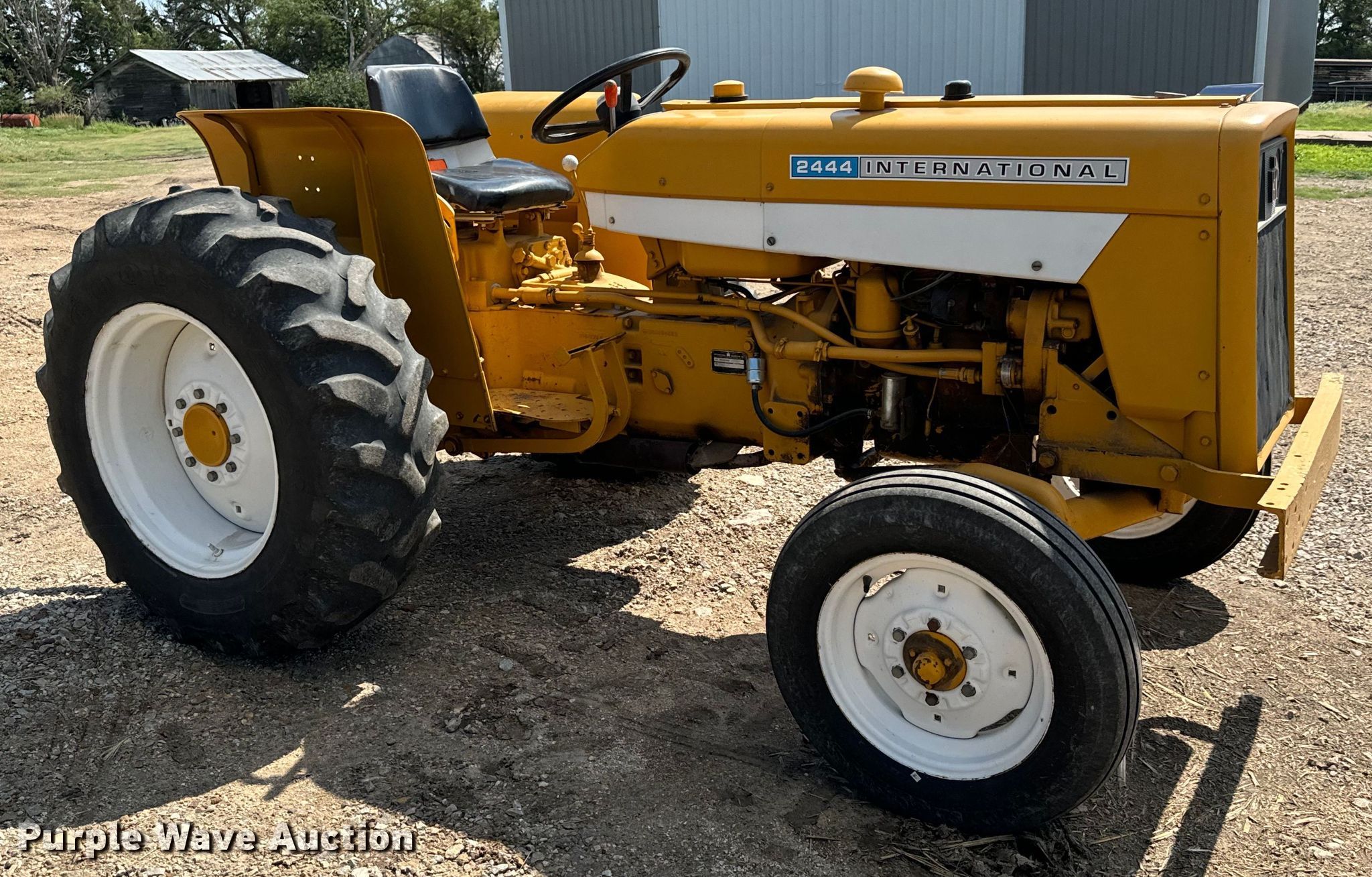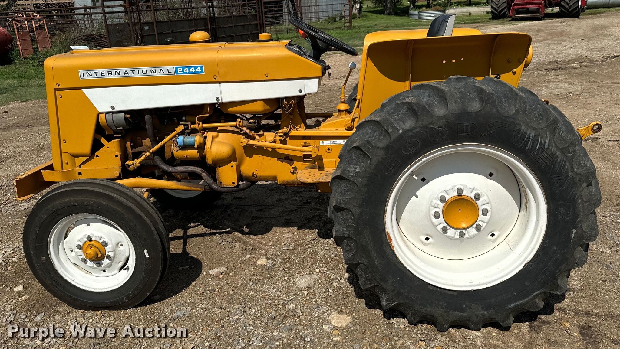 International 2444 Industrial tractor. Hours: 6,526 on meter, Serial: 03582. Engine Cylinders: 4, Fuel type: Gas, HP: 47. Transmission Manual, 8F - 2R, Differential lock. Features PTO: 540, Three point Top link. Tires Front: 6.00-16, Rear: 13.6-24. Notes Non-operational oil pressure gauge. Holyrood, KS 67450
