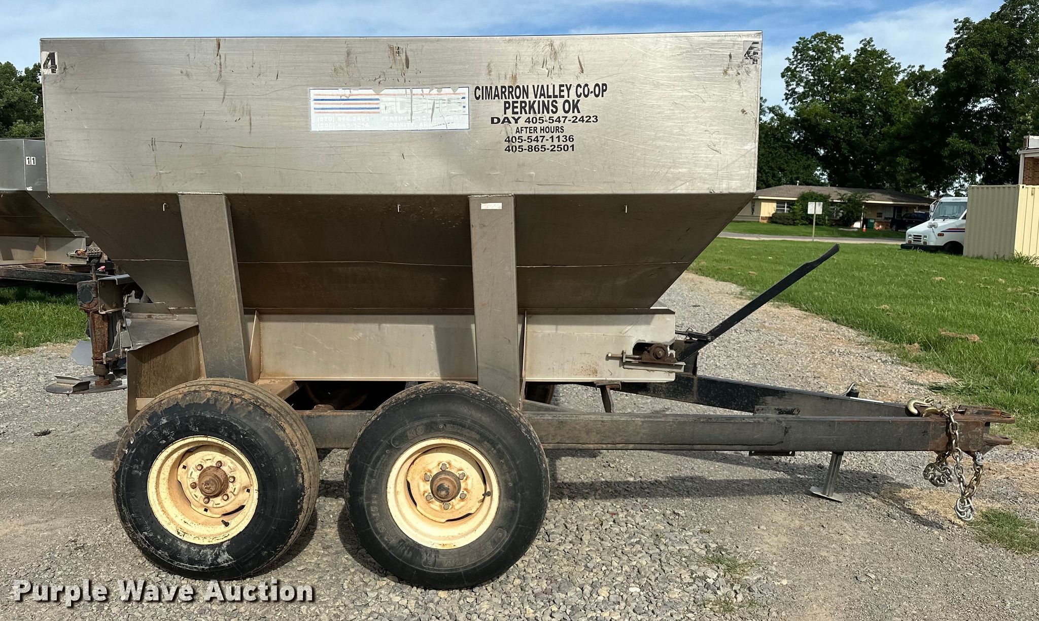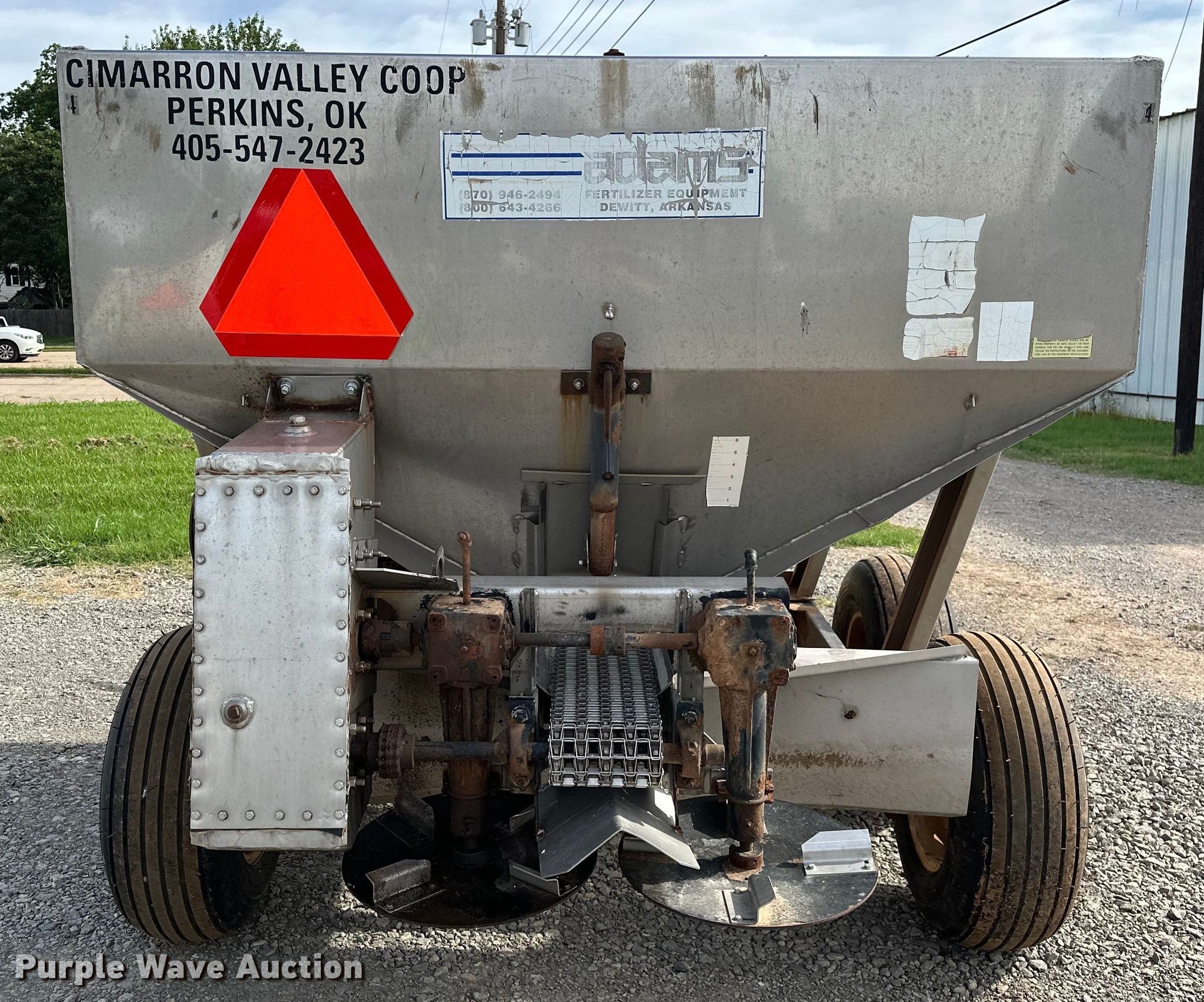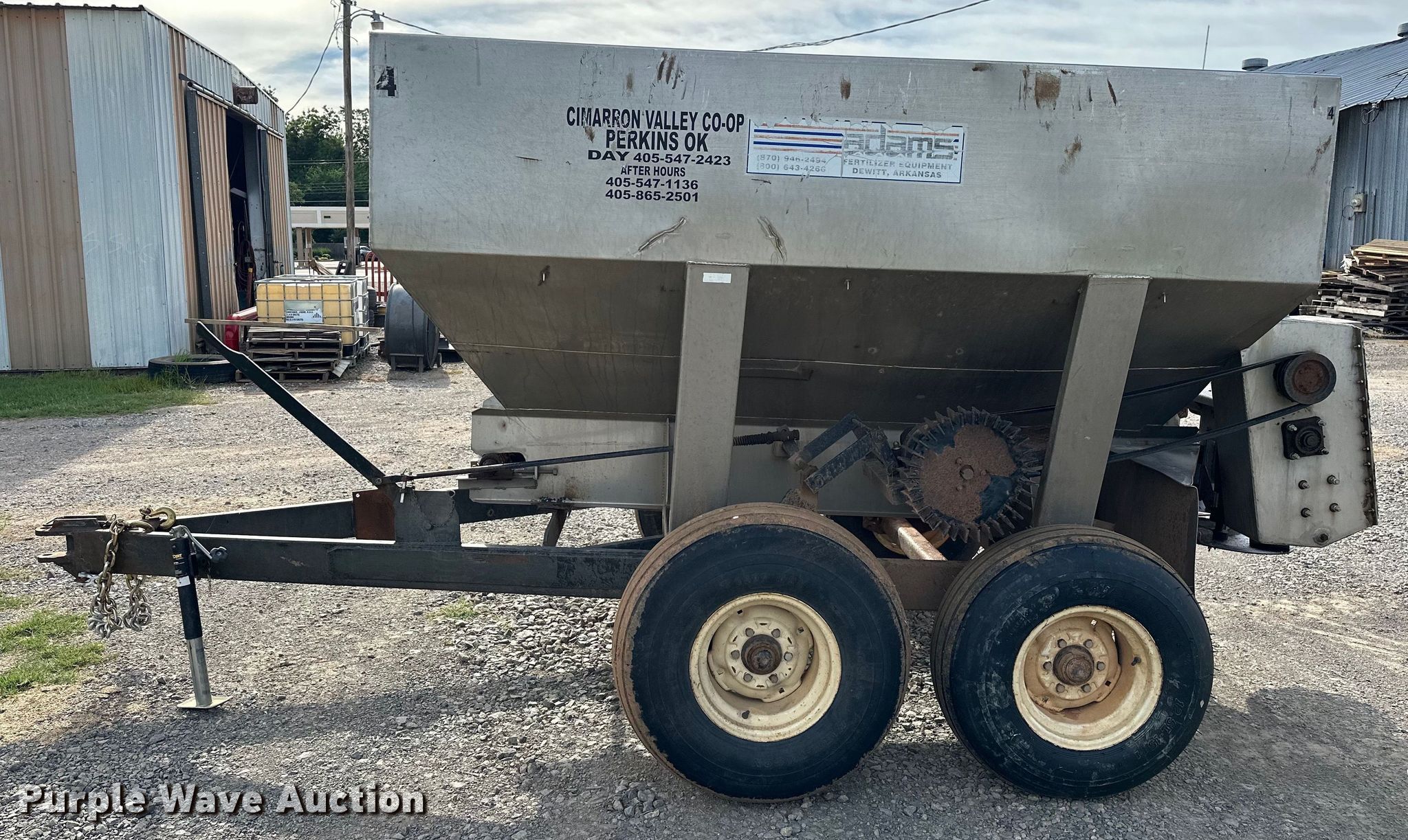 Adams spreader. Serial: 14331. Features Dry fertilizer spreader Tons capacity: 4, Stainless steel, Dual spinners, Ground driven, Conveyor belt Width: 8".. Tires Size: 12.5L-15. Cimarron Valley Coop Inc.. Perkins, OK 74059