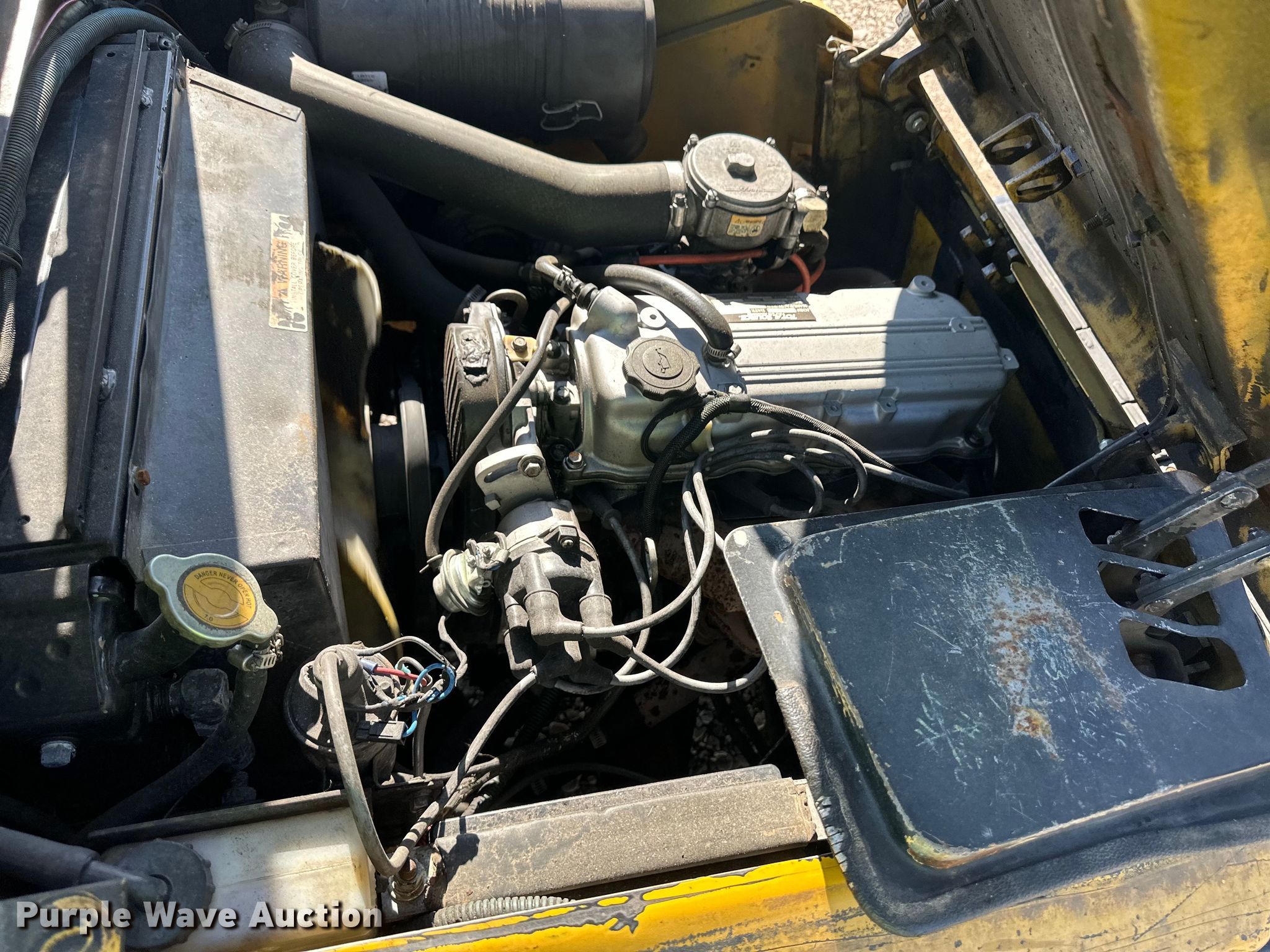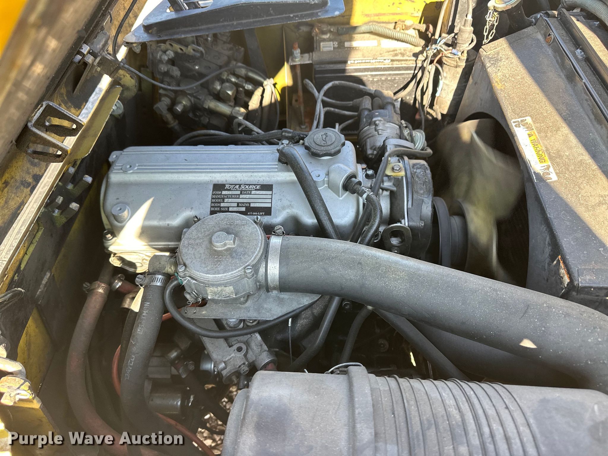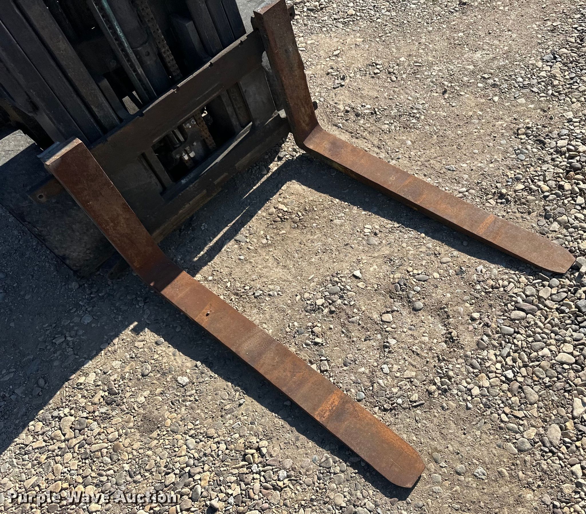 Yale GLC050TGNUAE084 forklift. Hours: Unknown, Serial: E187V07805V. Engine Mazda F2, Serial: 9572, Cylinders: 4, Fuel type: LPG LP bottle: Not included. Transmission Powershift. Operators station Canopy. Features Maximum lift capacity: 4,650 lbs, Maximum lift height: 195", Mast stages: 3, Mast tilt, Fork length: 42". Tires Front: 21x7x15, Rear: 16x5x10.5, Solid. Notes Non-operational hour meter. Peter Teichroeb. Sublette, KS 67877