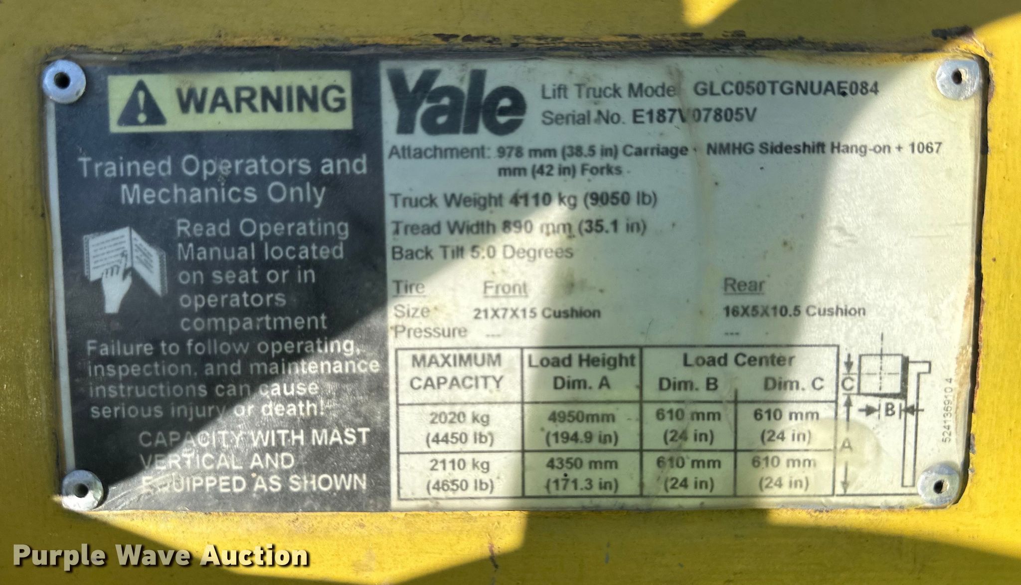 Purple Wave is selling a used Warehouse Forklift in Kansas. This item is a Yale GLC050TGNUAE084 forklift with the following: Hours: Unknown, Serial: E187V07805V