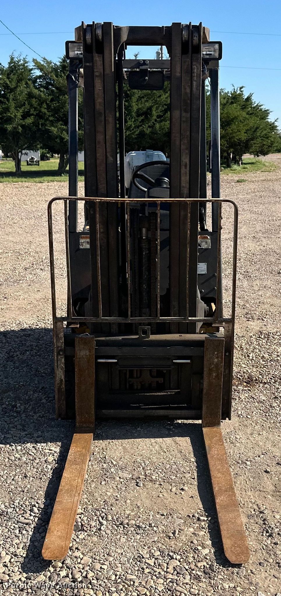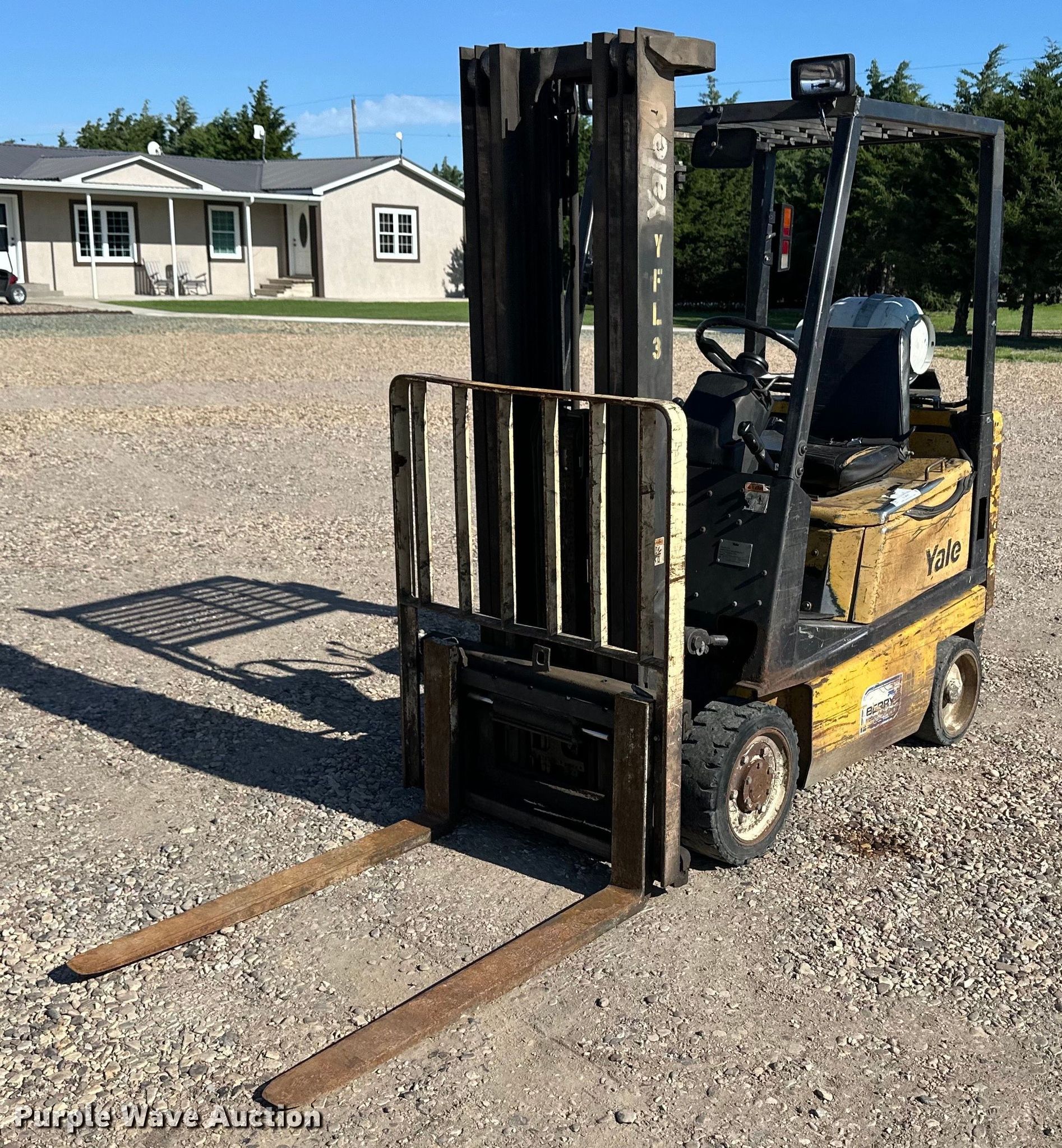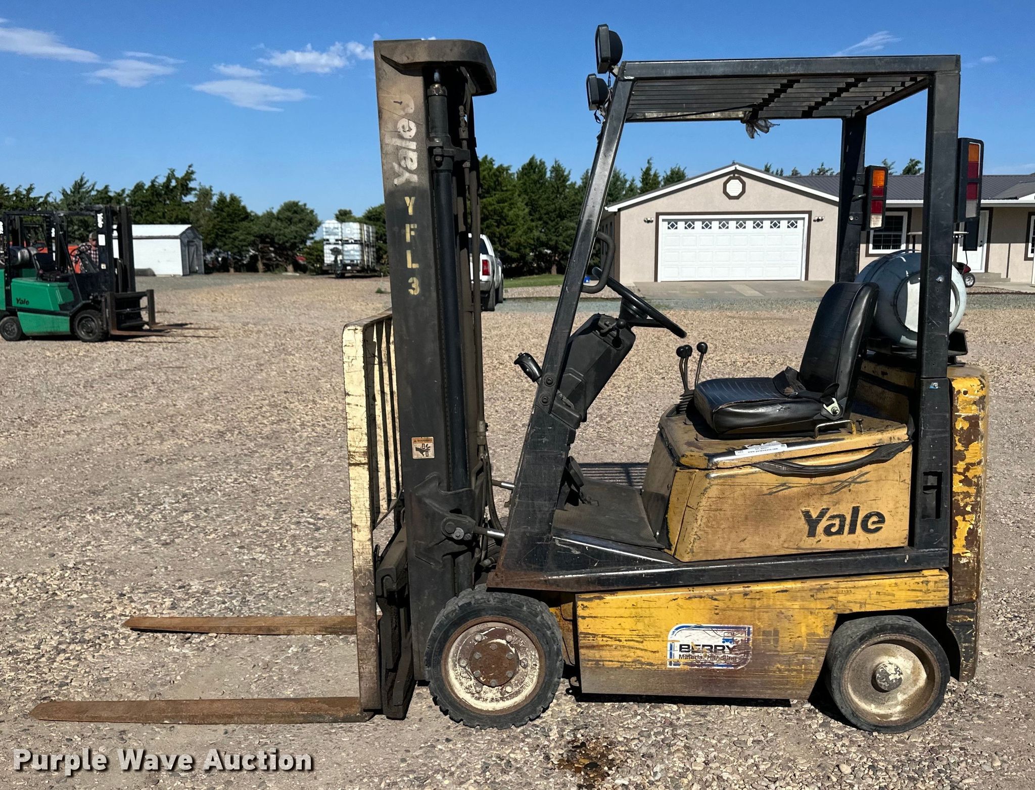 Yale GLC030BFNUAE082 forklift. Hours: 6,180 on meter, Serial: A809N02219S. Engine Cylinders: 4, Fuel type: LPG LP bottle: Not included. Transmission Powershift. Operators station Canopy. Features Maximum lift capacity: 3,000 lbs, Maximum lift height: 185", Mast stages: 3, Side shift, Mast tilt, Fork length: 42". Tires Front: 18x6x12&1/8, Rear: 15x5x11.5, Solid. Peter Teichroeb. Sublette, KS 67877
