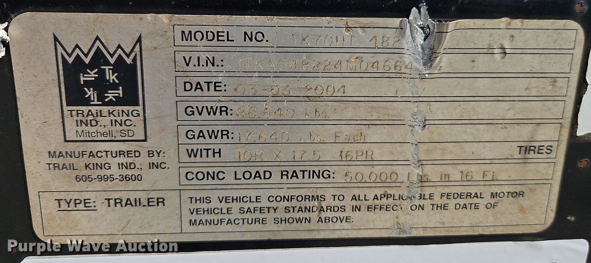 Purple Wave is selling a used Equip. Trailer in Kansas. This item is a 2004 Trail King TK70HT 482 drop deck equipment trailer with the following: VIN: 1TKA048224M046647, Unit #: 215
