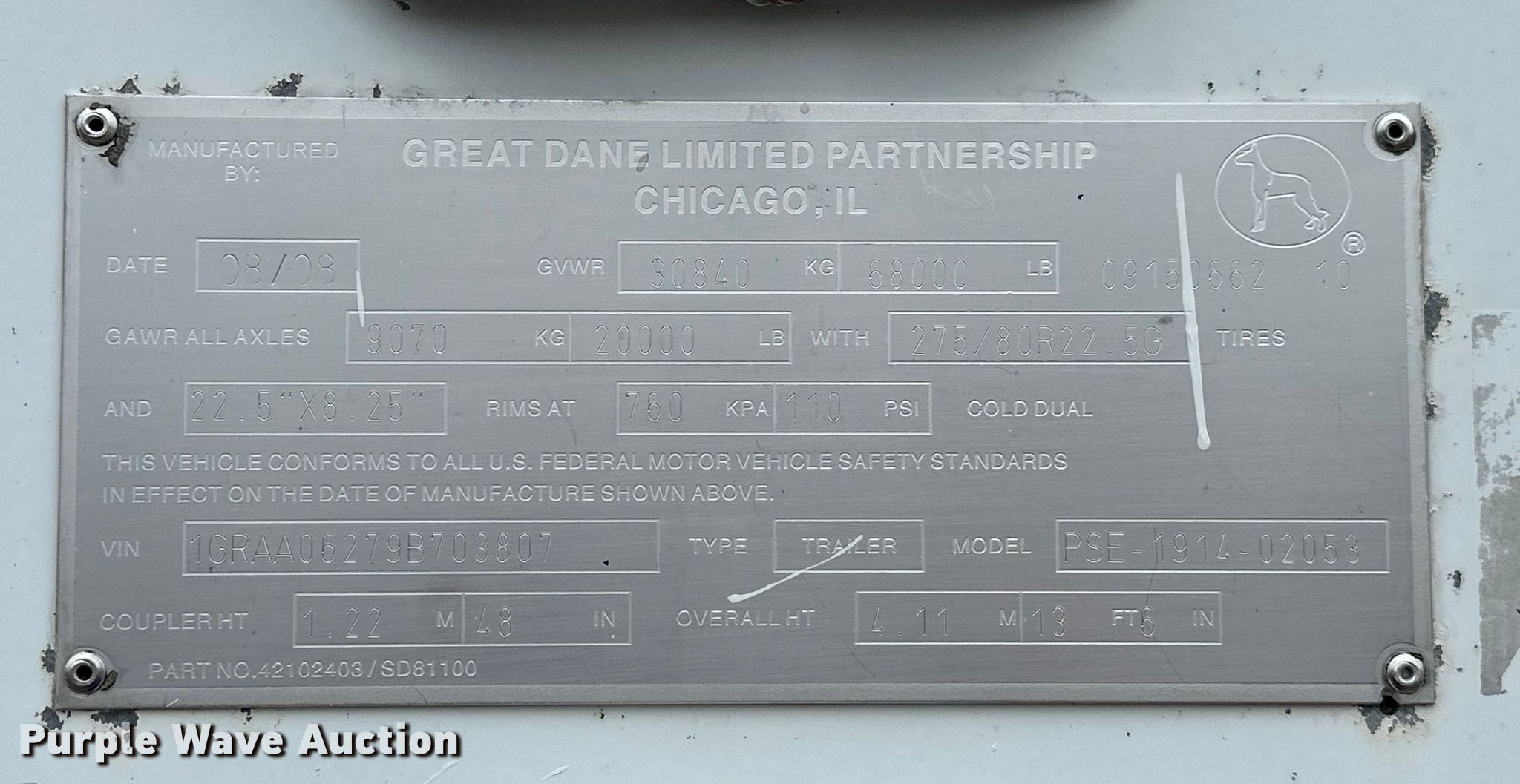 Purple Wave is selling a used Dry Van Trailer in Oklahoma. This item is a 2009 Great Dane PSE-1914-02053 dry van trailer with the following: VIN: 1GRAA06279B703807