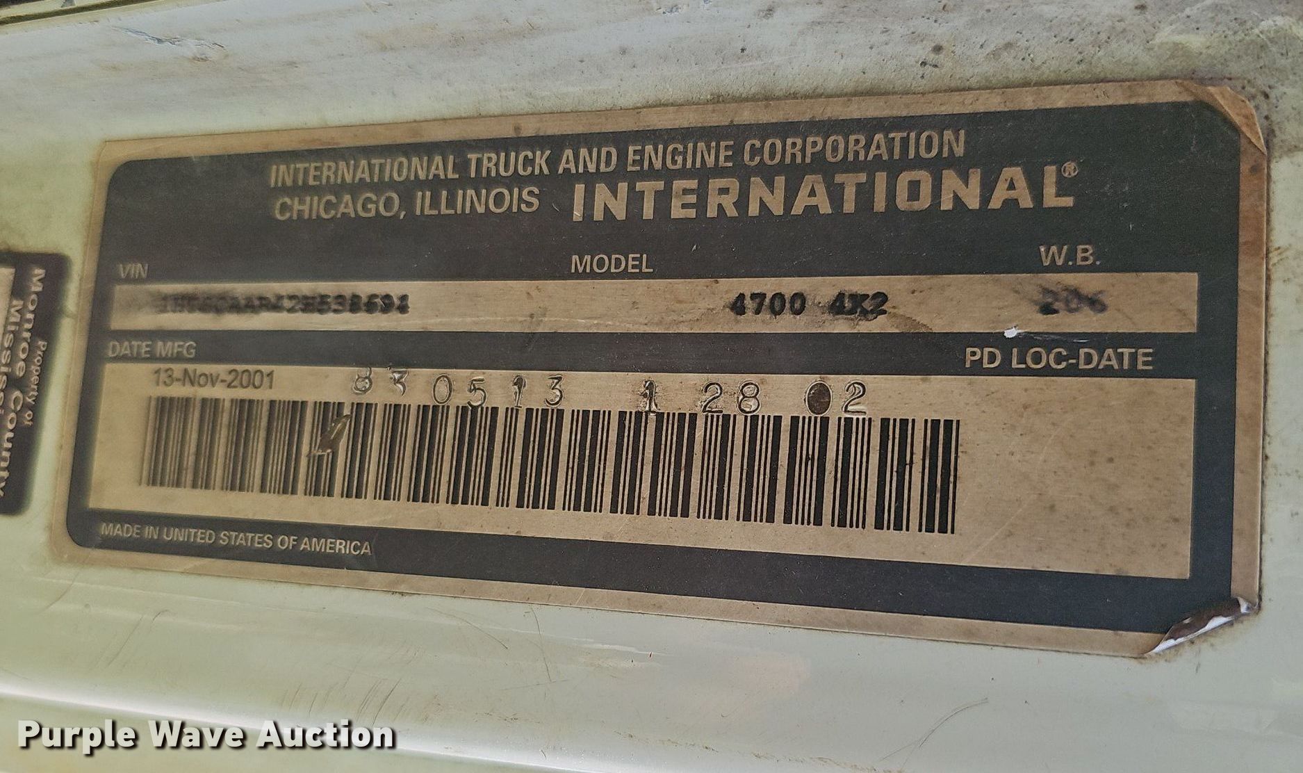 Purple Wave is selling a used Truck Chassis in Missouri. This item is a 2002 International 4700 truck cab and chassis with the following: Miles: 198,290 on odometer, VIN: 1HTSCAAR42H538694