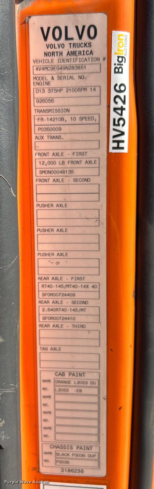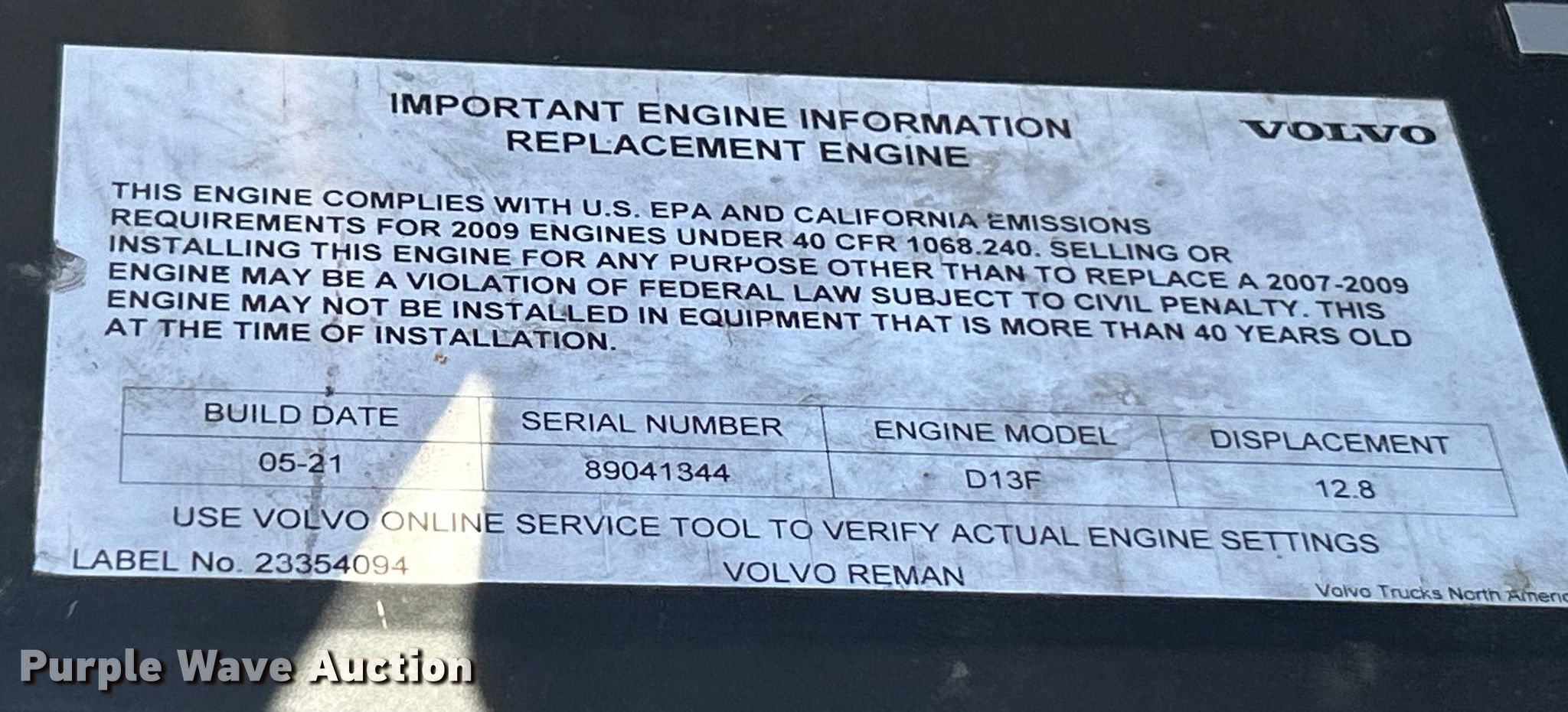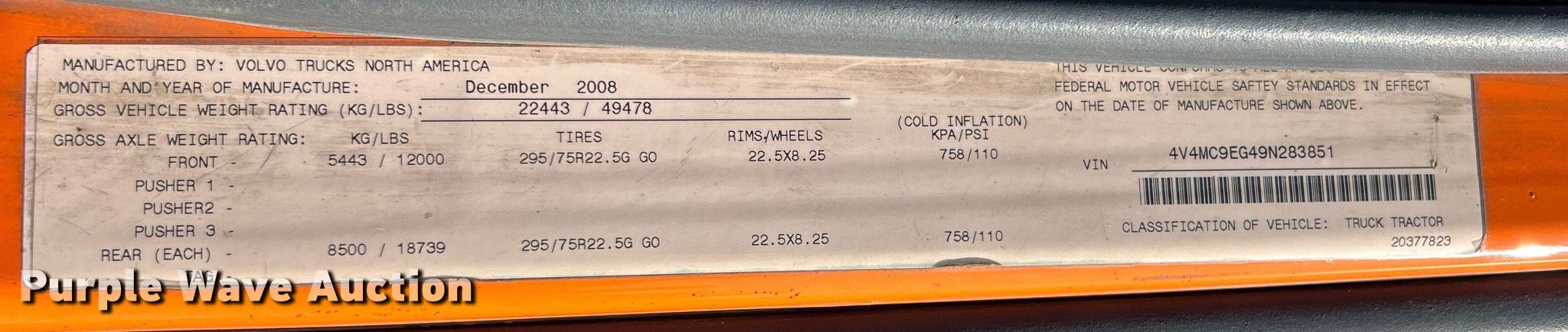 2009 Volvo VNM semi truck. Miles: 985,226 on odometer, VIN: 4V4MC9EG49N283851. Engine Volvo D13F, Serial: 89041344, Displacement: 12.8L, Cylinders: 6, Fuel type: Diesel, HP: 375, Engine brake. Transmission Eaton, Manual, Speed: 10. Chassis Axles: Tandem, Differential lock: Inter-axle, Suspension: Air Dump valves, Brakes: Air, GVWR: 49,478 lbs FAWR: 12,000 lbs, IAWR: 18,739 lbs, RAWR: 18,739 lbs. Interior AC, Heat, Heated mirrors, Cruise control. Features Deck plate: Aluminum, Fifth wheel type: Air operated, Sliding, Fuel tank: Dual. Tires Front: 275/80R22.5, Rear: 295/75R22.5. Notes Windshield chipped or cracked. Indiana title. Seller is a Missouri licensed motor vehicle dealer. Title will be assigned and distributed by the dealer. Please contact the seller for distribution questions. Title distribution may be delayed up to 30 days from verification of funds. Northpoint Enterprises, LLC. Troy, MO 63379