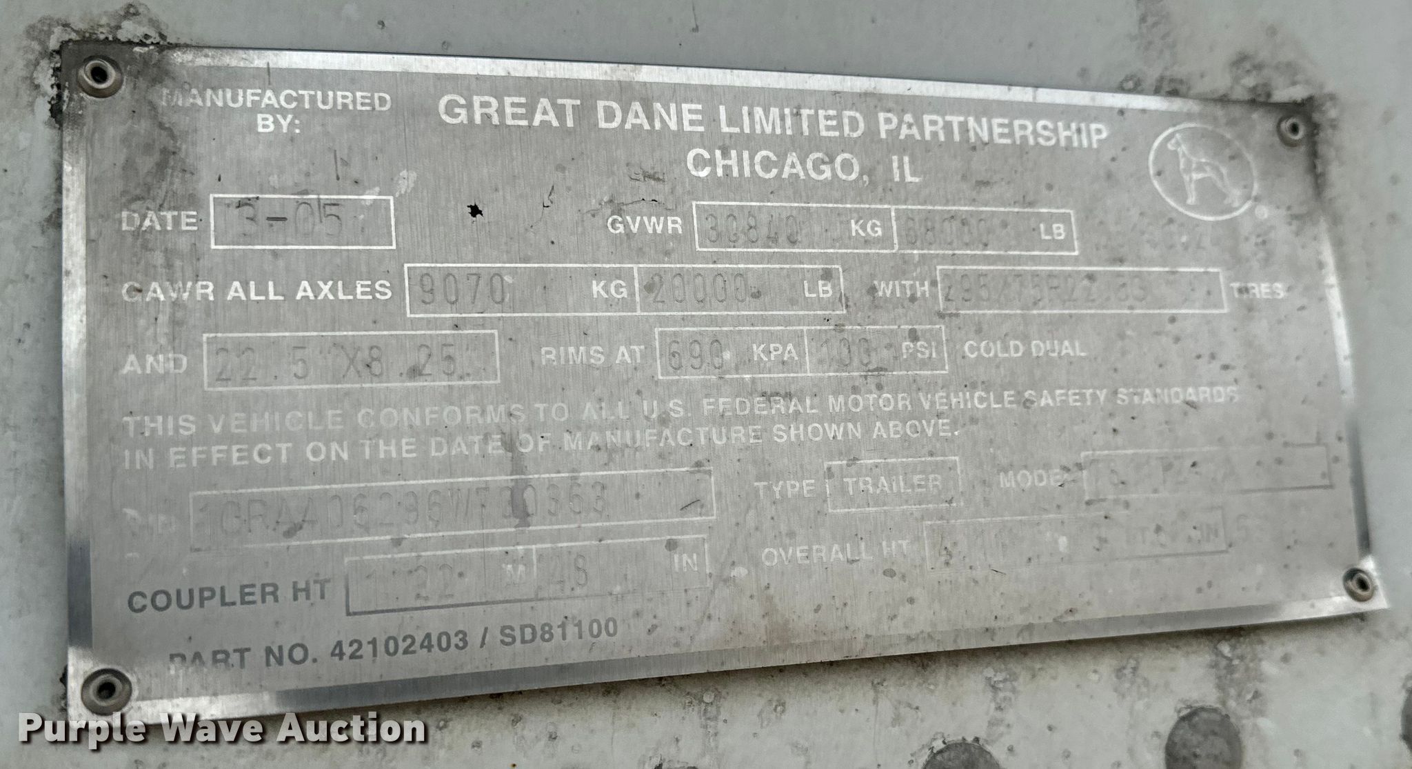 Purple Wave is selling a used Refrigerated Van Trailer in Kansas. This item is a 2006 Great Dane 7811TZ-1A refrigerated van trailer with the following: VIN: 1GRAA06296W700363
