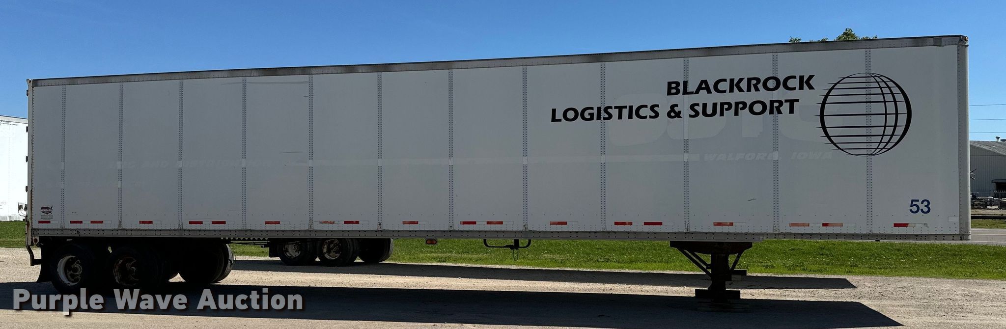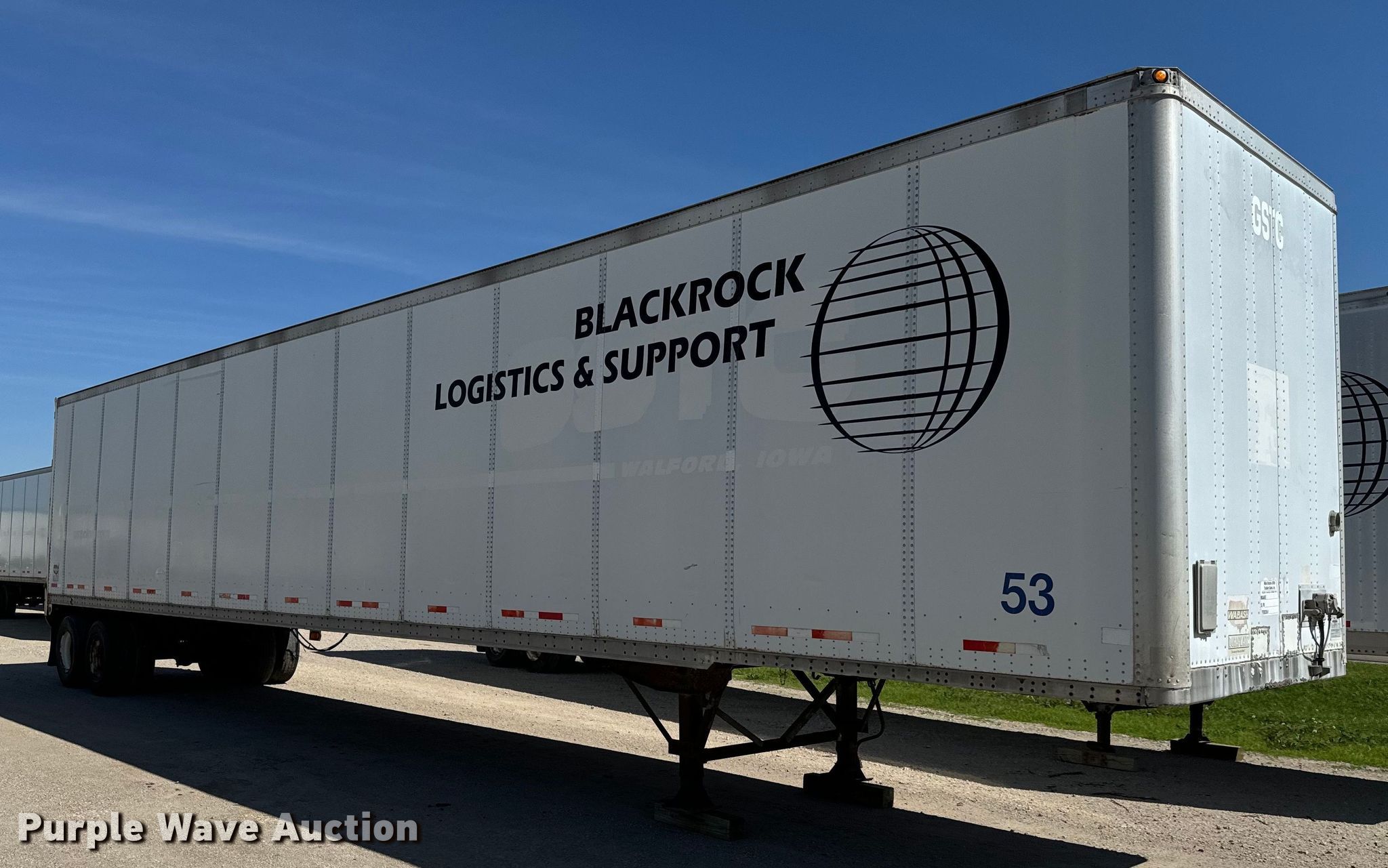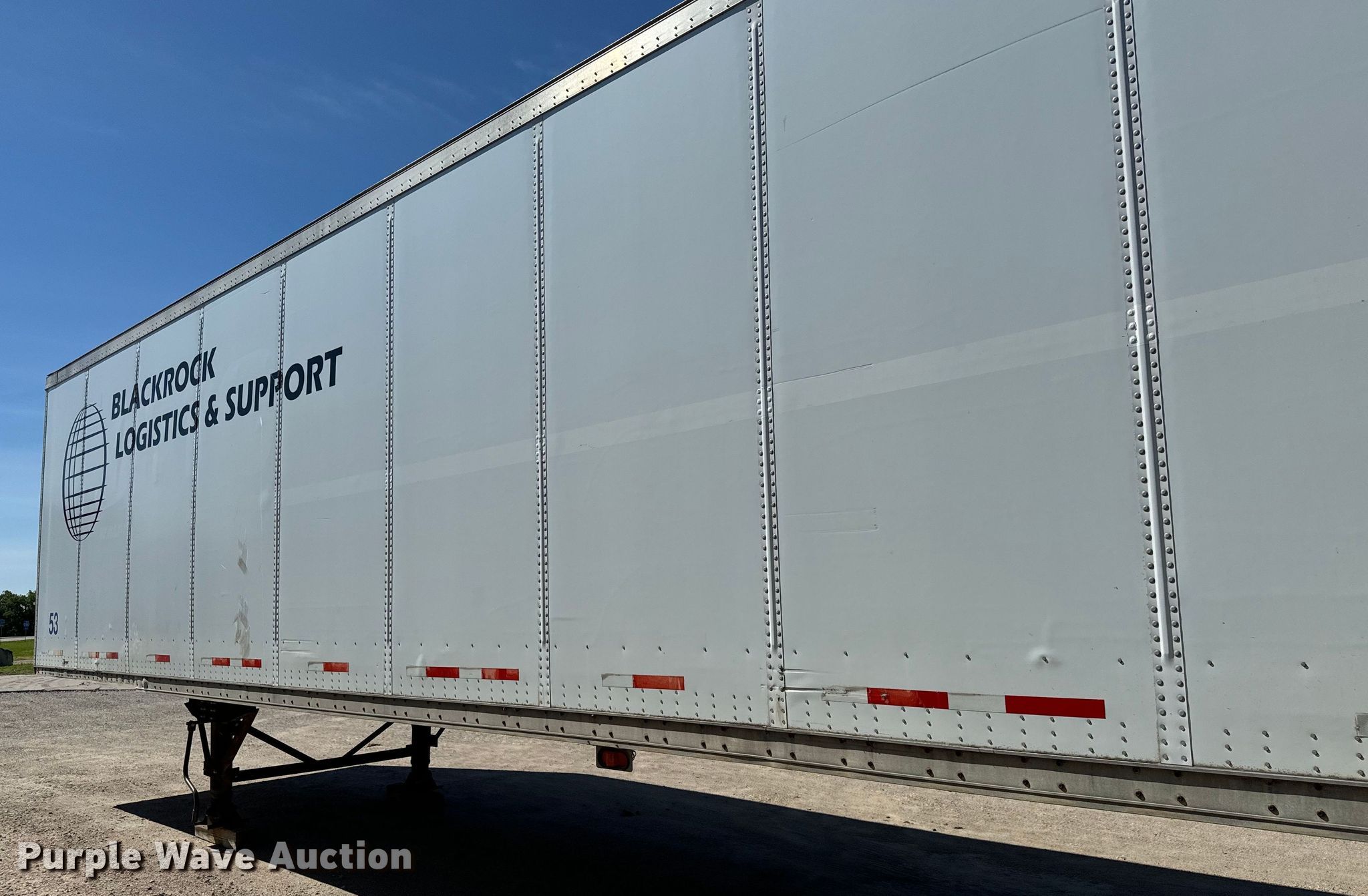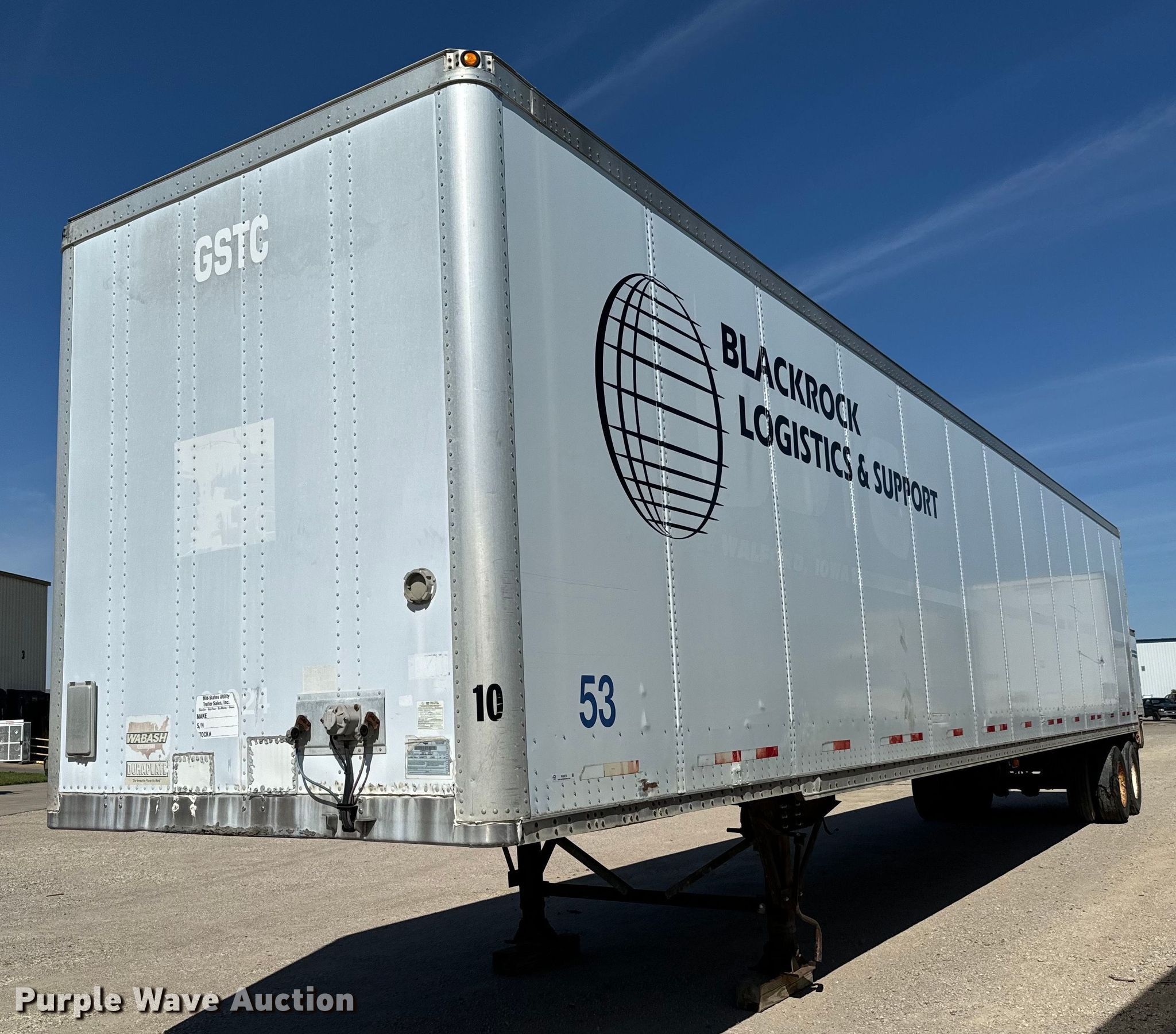 2001 Wabash DVCVHPC dry van trailer. VIN: 1JJV532WX1L761393, Unit #: 10. Dimensions Overall: 53' L x 102" W. Features Deck type: Aluminum, E-track rail system. Chassis Landing gear: Dual, Suspension: Air, Brakes: Air, Axles: Tandem Sliding, GVWR: 68,000 lbs, GAWR: 19,000 lbs. Tires Steel wheels, Size: 295/75R22.5, Size: 275/80R22.5. Notes Tire damaged. Nebraska title. Blackrock Logistics & Support. 8515 North Hesston Road. Hesston, KS 67062