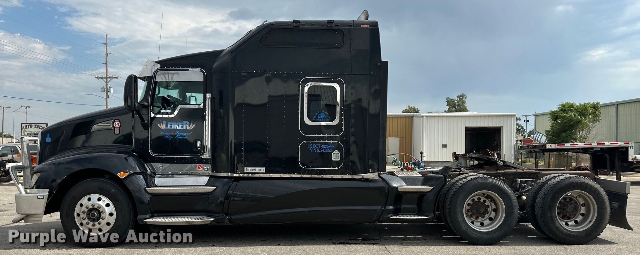 2009 Kenworth T600 semi truck. Miles: 111,645 on odometer Actual miles unknown, Hours: 18,443 on meter, VIN: 1XKAD49X19J243893. Engine Cummins ISX 525, Serial: 79294025, Displacement: 14.9L, Cylinders: 6, Fuel type: Diesel, Engine brake. Transmission Eaton Fuller, Manual, Speed: 15. Chassis Axles: Tandem, Differential lock: Inter-axle, Suspension: Air Dump valves, Brakes: Air. Interior AC, Heat, Power windows, Power locks, Cruise control, Air ride cab, Sleeper Sleeper length: 72", Beds: Double bunk, Refrigerator, Rear climate control. Features Deck plate: Steel, Fifth wheel type: Air operated, Sliding, Fuel tank: Dual. Tires Front: 11R22.5, Rear: 295/75R22.5. Kansas title. Leiker Farms & Trucking. Hays, KS 67601