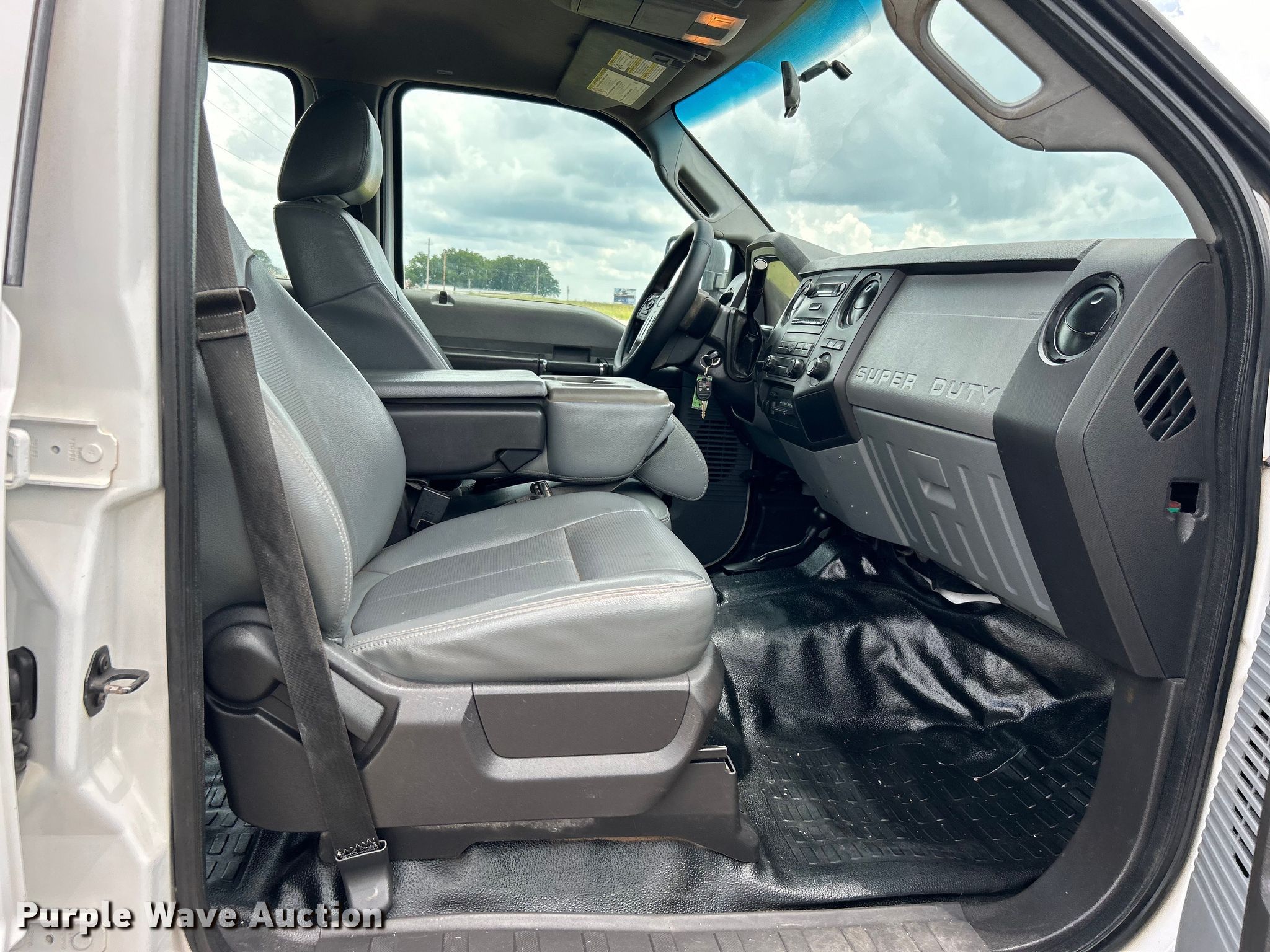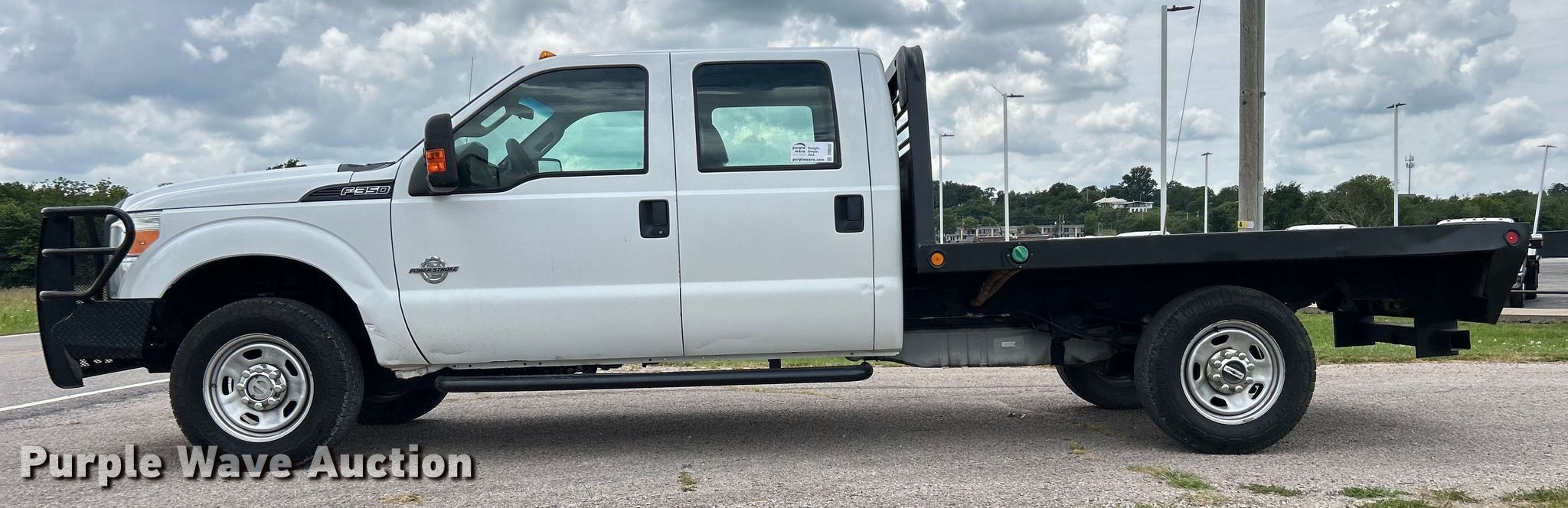 This 2014 Ford F350 Super Duty Crew Cab flatbed pickup truck will sell to the highest bidder regardless of price.