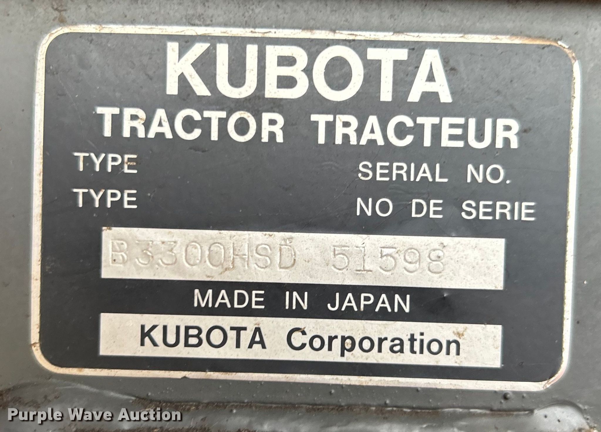 Purple Wave is selling a used Tractor in Oklahoma. This item is a 2011 Kubota B3300SU MFWD tractor with the following: Hours: 348 on meter, Serial: 51598