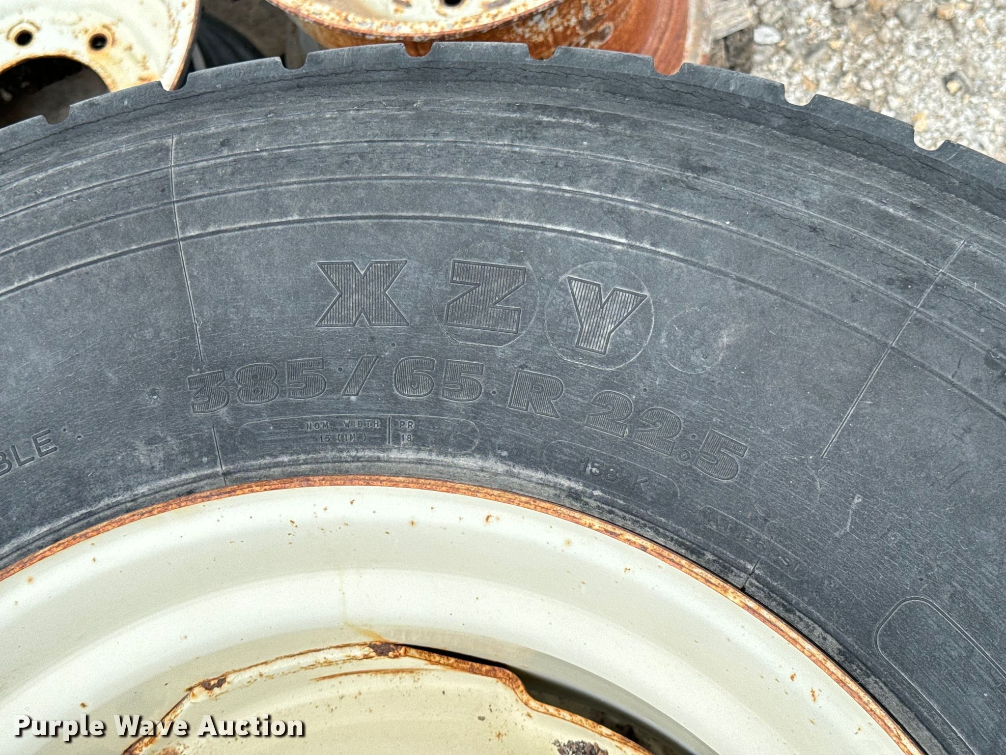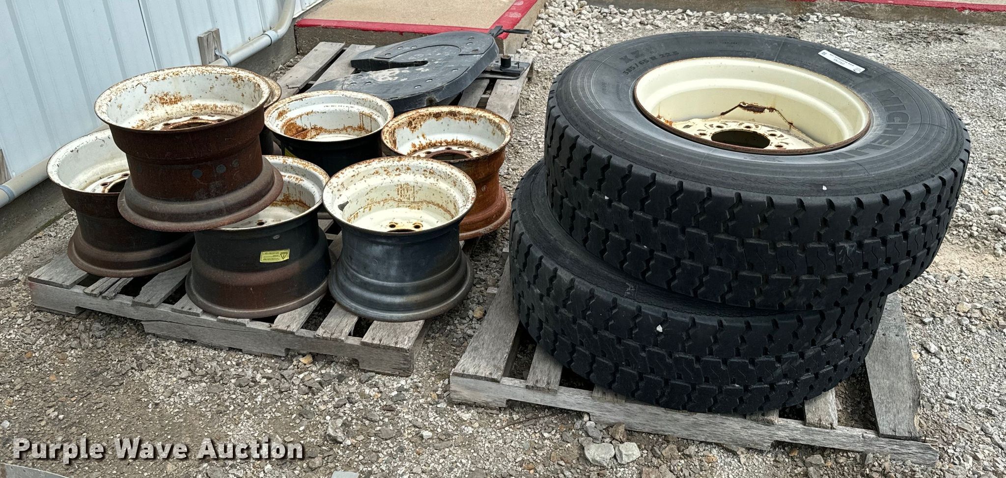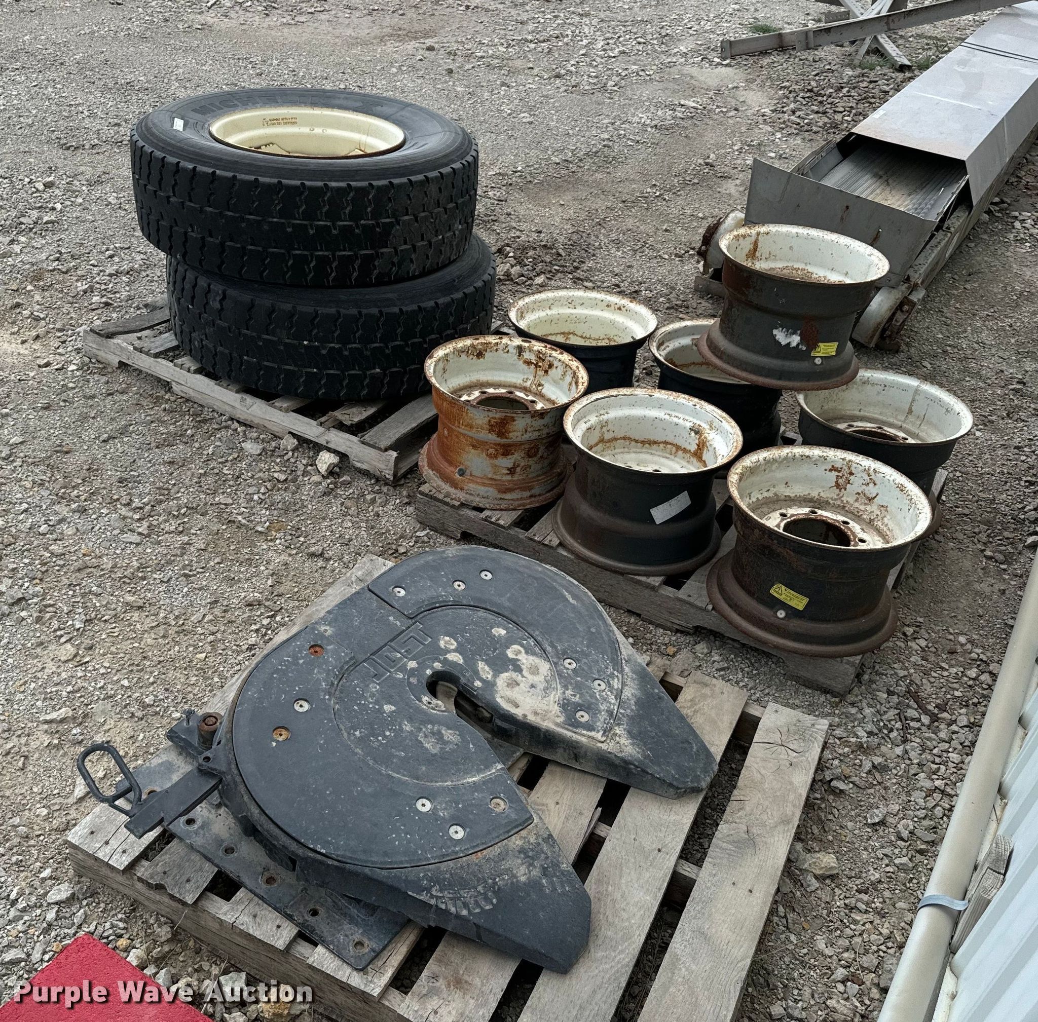 Purple Wave is selling a used Truck Part and Attach. in Kansas. This item is a Truck parts with the following: (7) 16" wheels, (2) 385/65R22.5 tires and wheels, Jost fifth wheel plate, Width: 40"