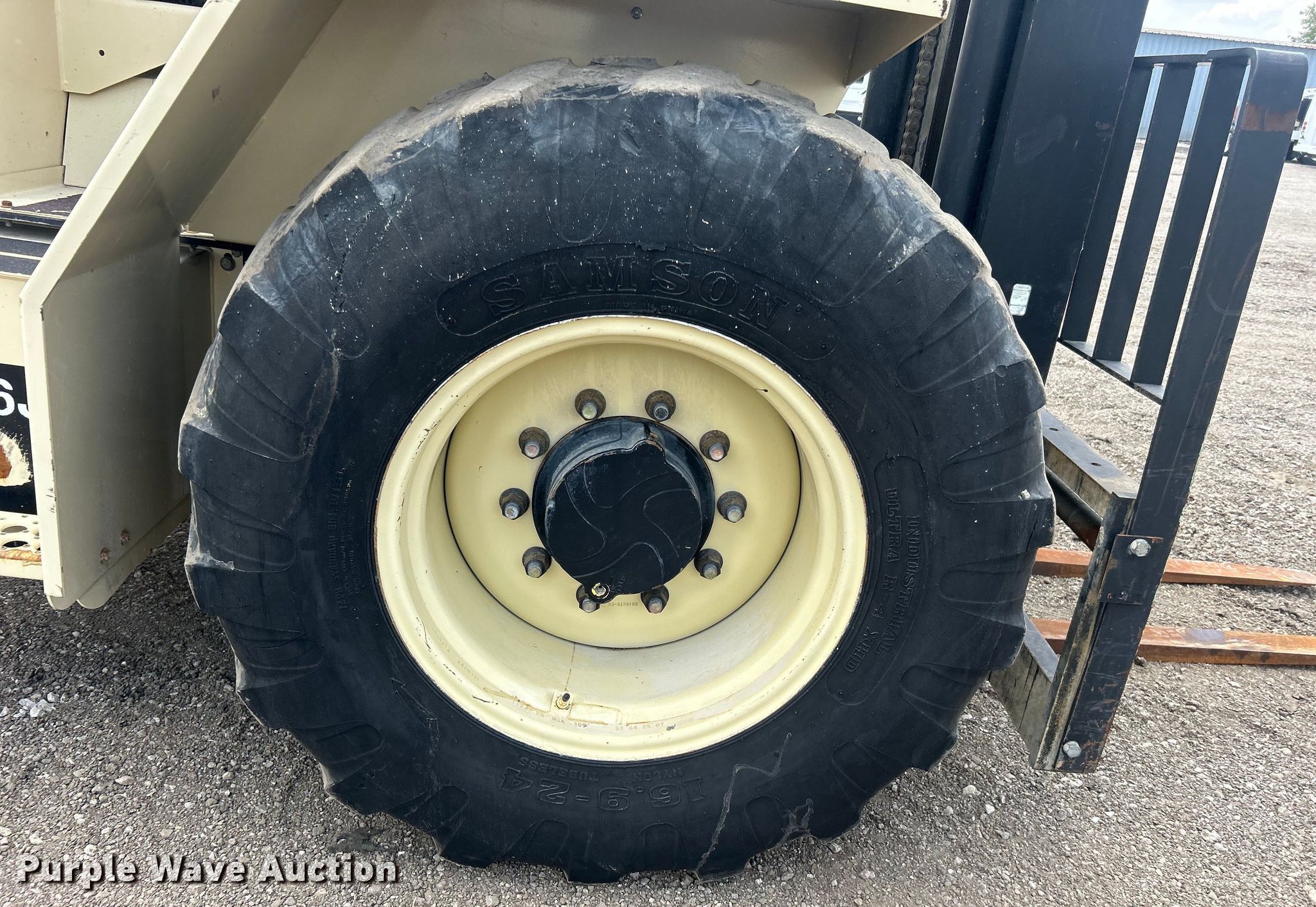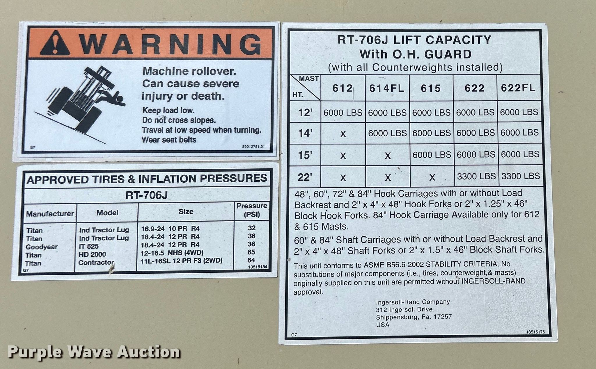 Ingersoll Rand RT-706J forklift. Hours: 4,990 on meter. Engine John Deere 4045DF270, Serial: PE4045D684112, Displacement: 4.5, Cylinders: 4, Fuel type: Diesel. Transmission Powershift, 3F - 3R. Operators station Canopy. Features Maximum lift capacity: 6,000 lbs, Maximum lift height: 22", Mast stages: 3, Mast tilt, Fork length: 47". Tires Front: 16.9-24 IND, Rear: 1-16 SL. 15107 North 137th East Avenue. Collinsville, OK 74021
