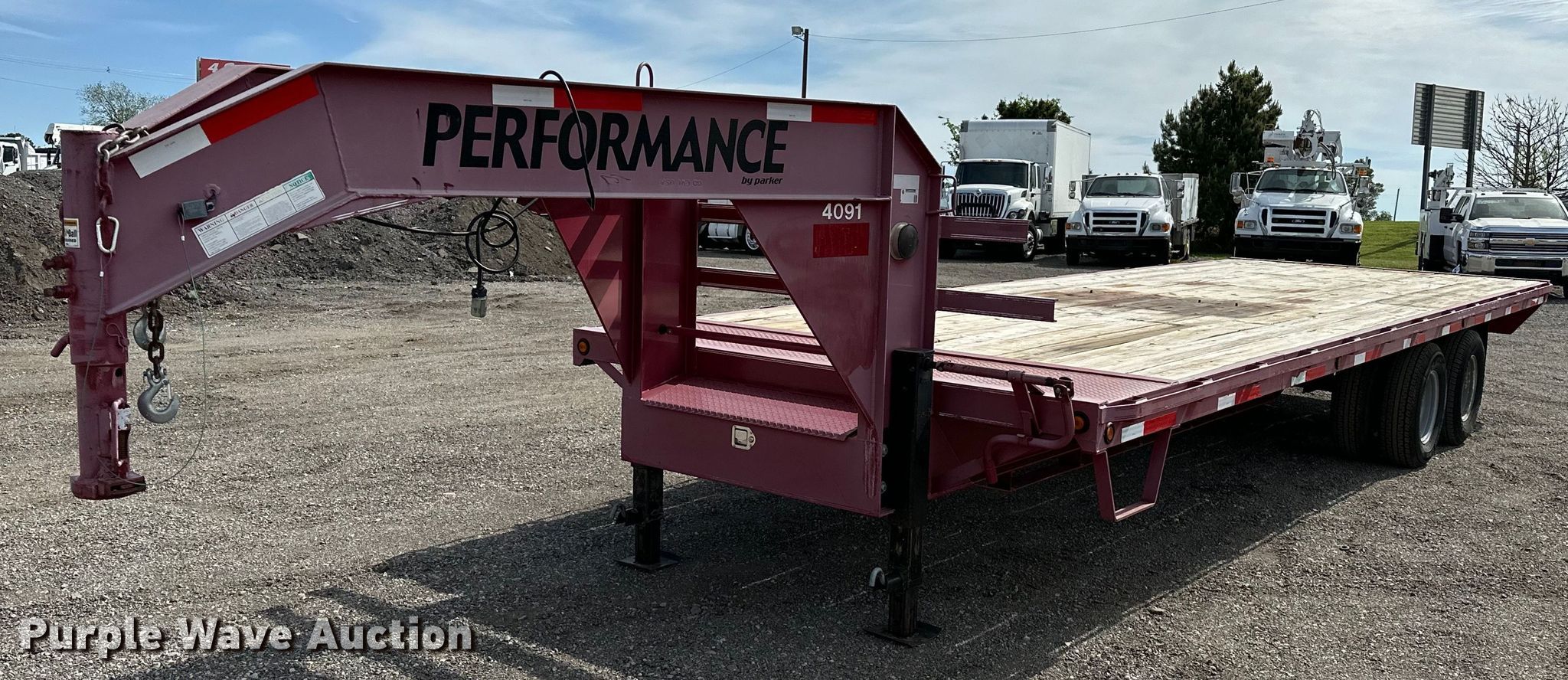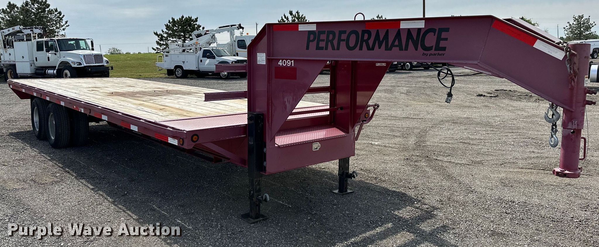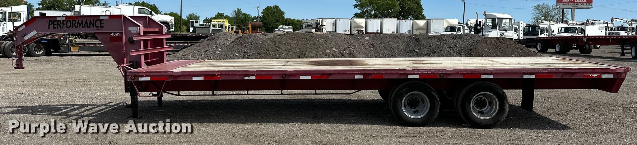 2012 Performance flatbed trailer. VIN: 13ZGF2620C1001160. Dimensions Overall: 34' 6" L x 102" W, Deck: 26' L x 97" W. Features Deck type: Wood. Chassis Hitch: Gooseneck, Landing gear: Dual, Suspension: Torsion, Brakes: Electric, Axles: Tandem. Tires Steel wheels, Size: ST235/80R16. Oklahoma title. Collinsville, OK 74021